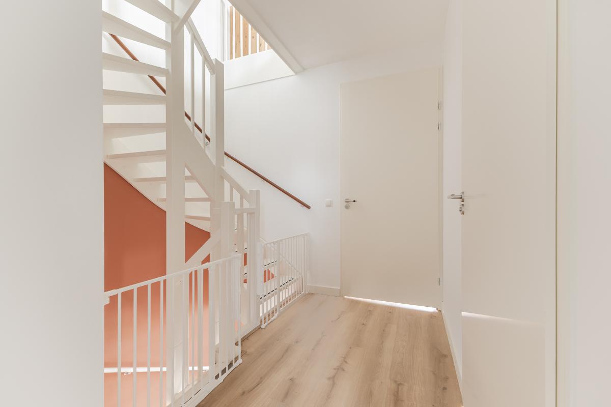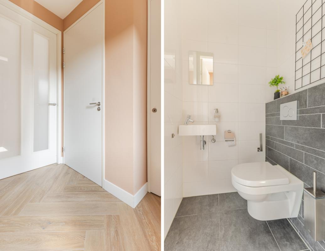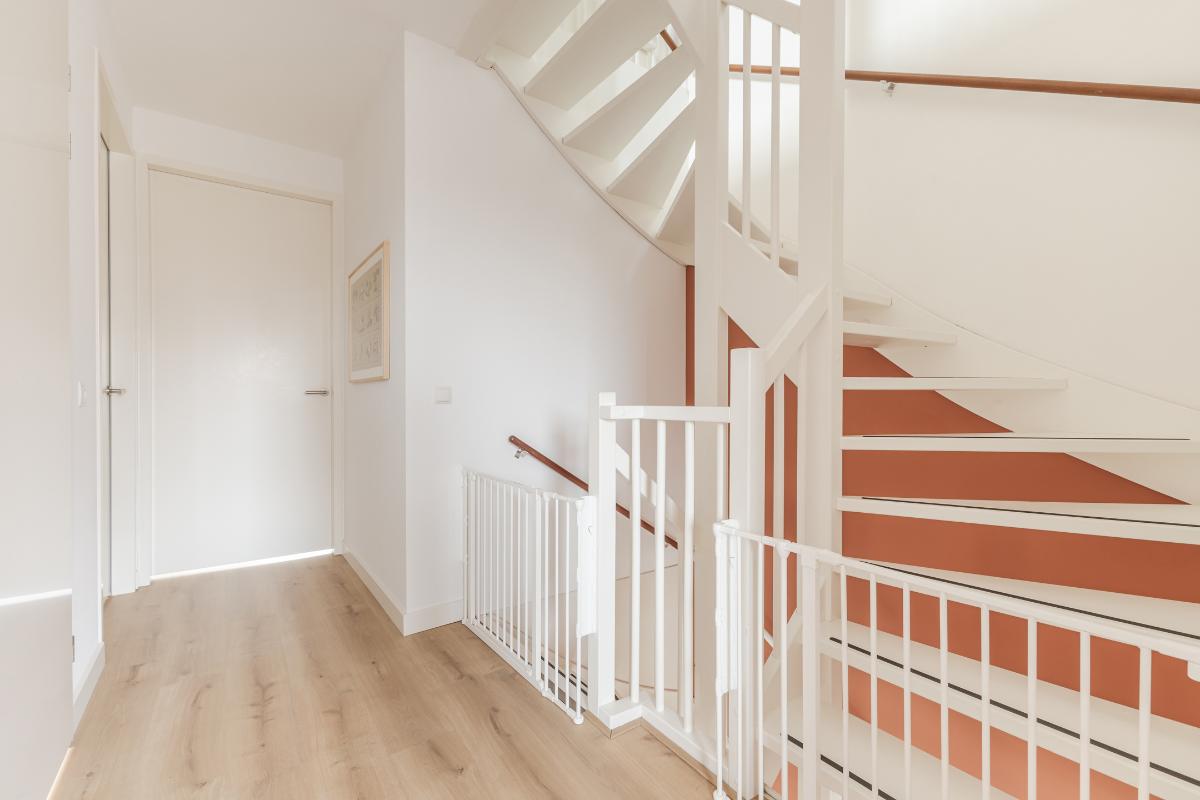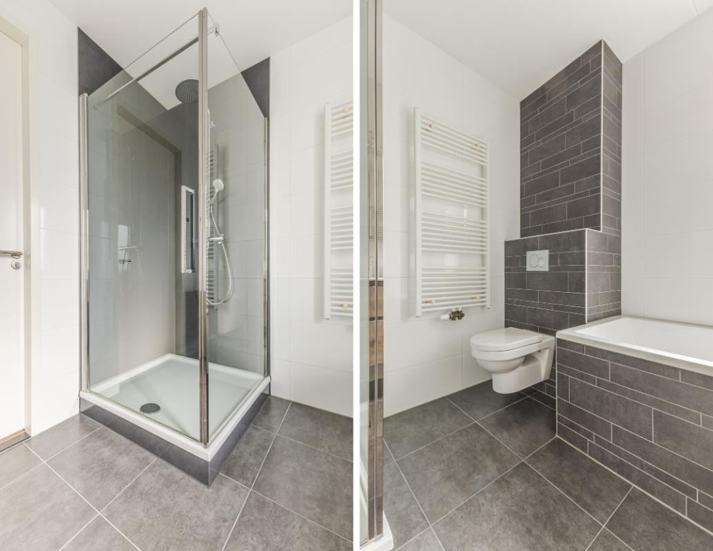 1e verdieping: Overloop naar 3 slaapkamers en de badkamer. De badkamer heeft een moderne uitstraling en een complete inrichting met ligbad, badmeubel met dubbele wastafel, een wandcloset en een inloopdouche met rainshower.