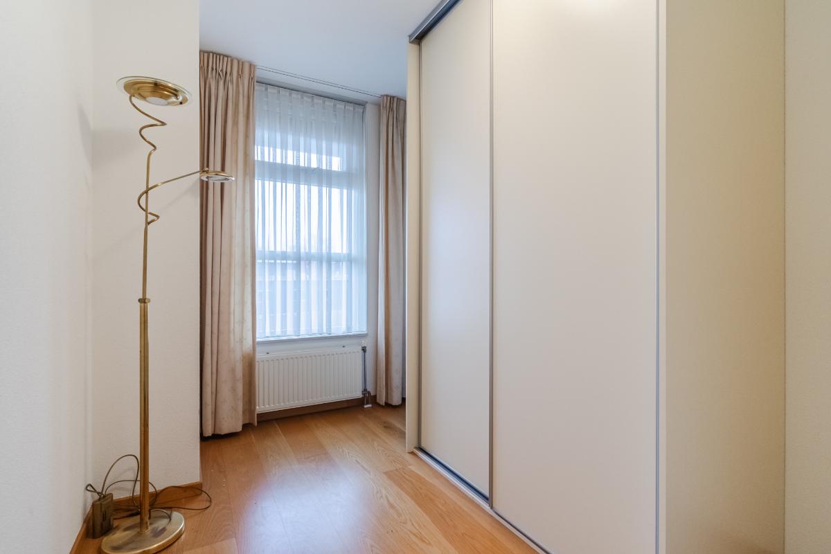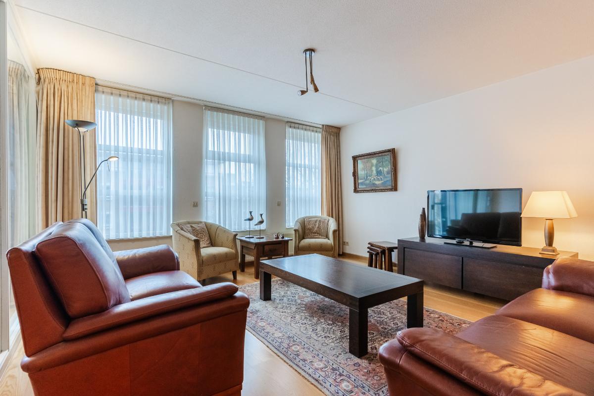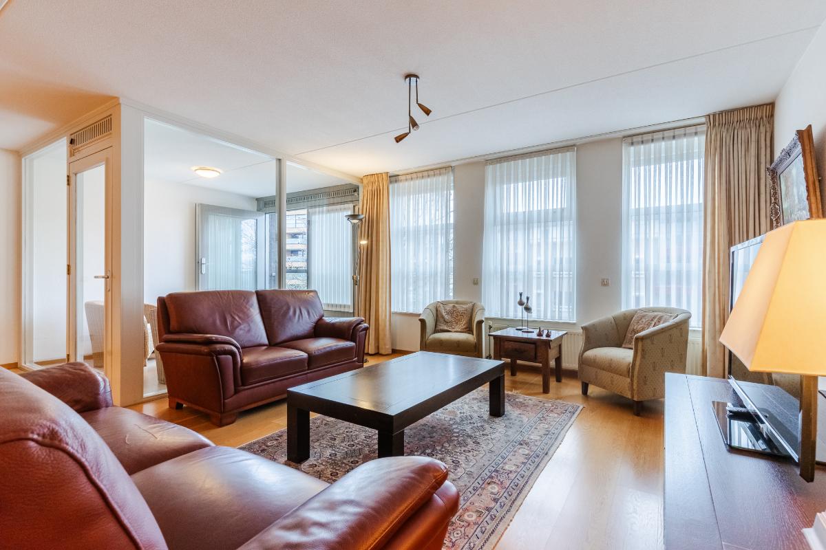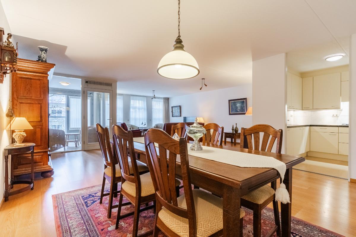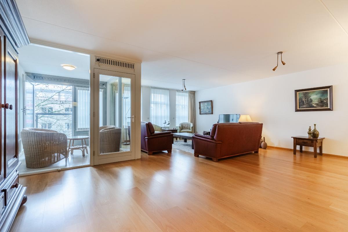 Appartement (2e verdieping): Hal, meterkast en geheel betegeld toilet met wandcloset en fontein. De slaapkamers (ouderslaapkamer, van plm. 15m² en slaapkamer 2 plm. 8m²) liggen aan de achterzijde. Inpandige berg-/wasruimte met aansluiting voor de wasmachine en opstelling van de c.v.-combiketel. Ruim opgezette, geheel betegelde badkamer met ligbad (v.v. thermostaatkraan), separate douchecabine en badmeubel met wastafel. Voorts de heerlijk ruime living van maar liefst 57m². De woonkamer is voorzien van een lamel-parketvloer en geeft toegang tot de loggia. De verwarmde loggia (7m²) is voorzien van openslaande balkondeuren. Gesloten keuken met nette inrichting in U-opstelling voorzien van vaatwasser, koelkast, gaskookplaat, combi-oven en afzuigkap.