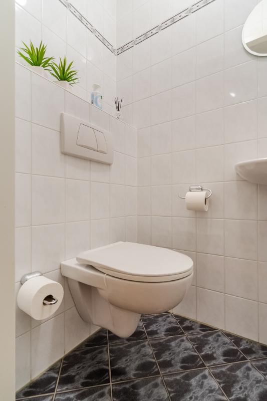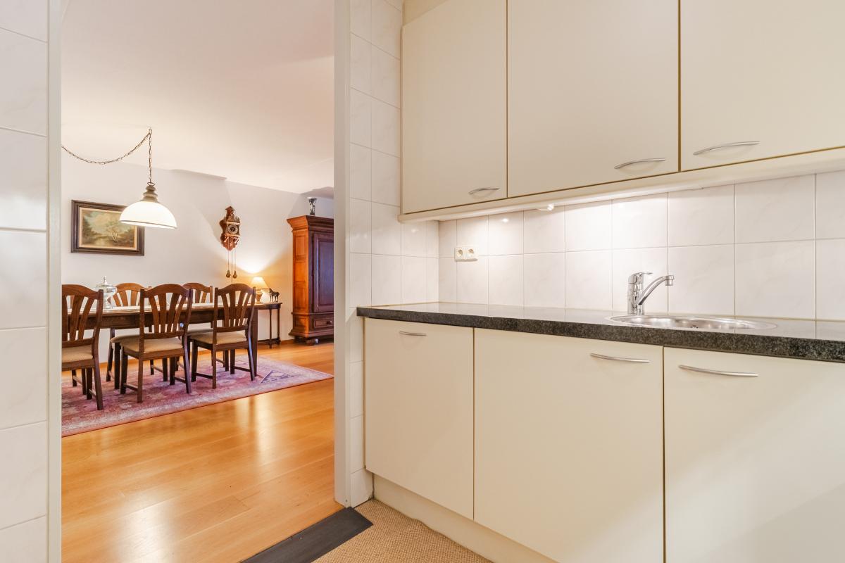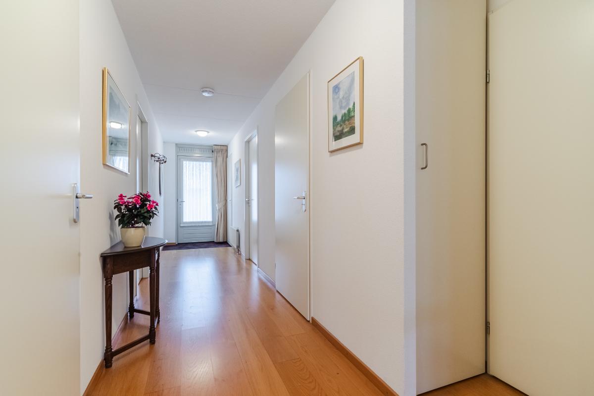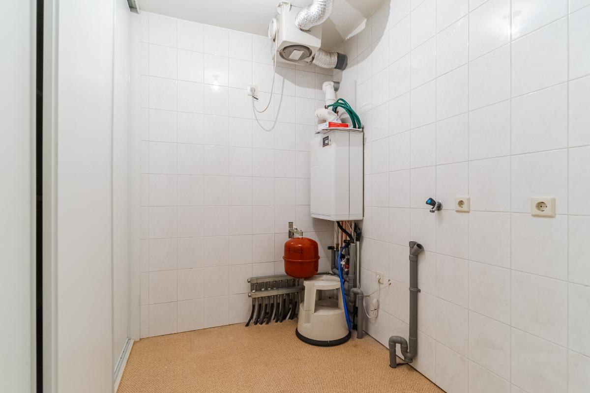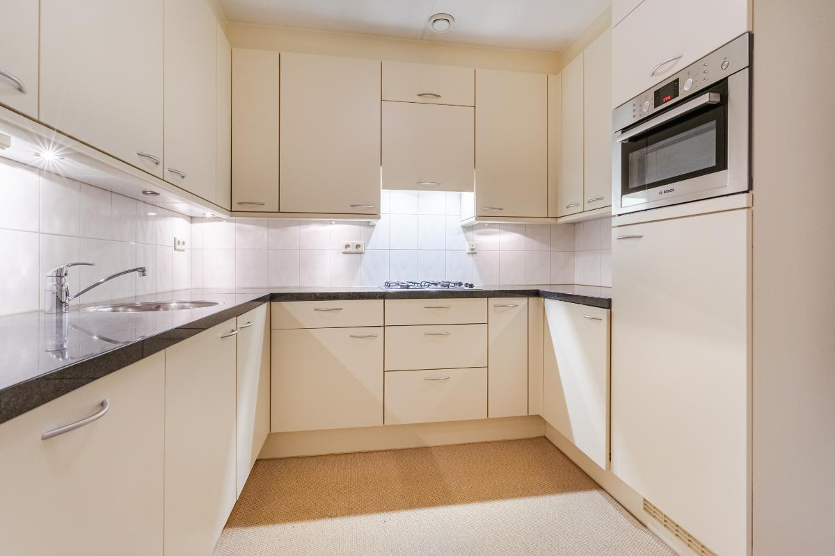 Appartement (2e verdieping): Hal, meterkast en geheel betegeld toilet met wandcloset en fontein. De slaapkamers (ouderslaapkamer, van plm. 15m² en slaapkamer 2 plm. 8m²) liggen aan de achterzijde. Inpandige berg-/wasruimte met aansluiting voor de wasmachine en opstelling van de c.v.-combiketel. Ruim opgezette, geheel betegelde badkamer met ligbad (v.v. thermostaatkraan), separate douchecabine en badmeubel met wastafel. Voorts de heerlijk ruime living van maar liefst 57m². De woonkamer is voorzien van een lamel-parketvloer en geeft toegang tot de loggia. De verwarmde loggia (7m²) is voorzien van openslaande balkondeuren. Gesloten keuken met nette inrichting in U-opstelling voorzien van vaatwasser, koelkast, gaskookplaat, combi-oven en afzuigkap.