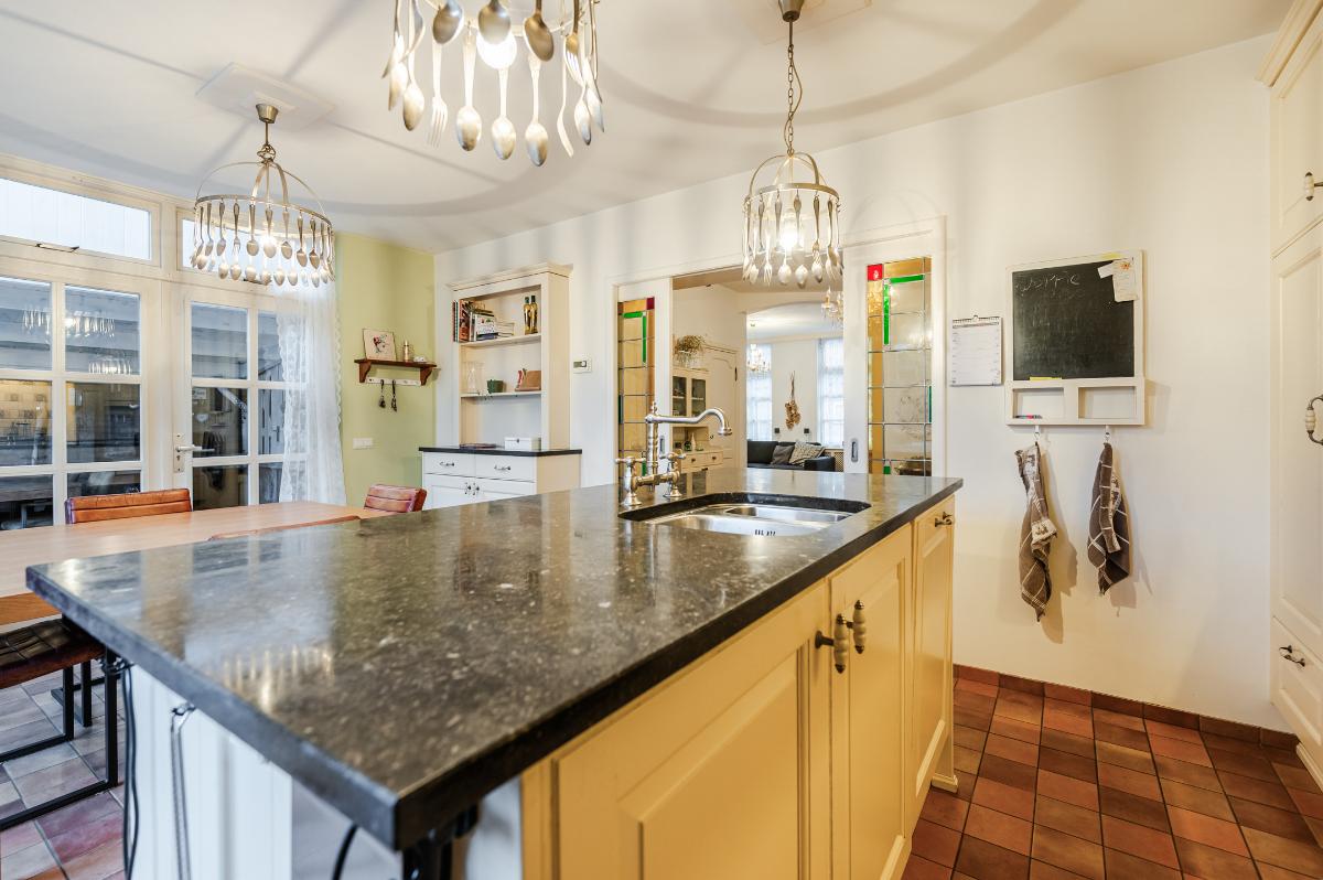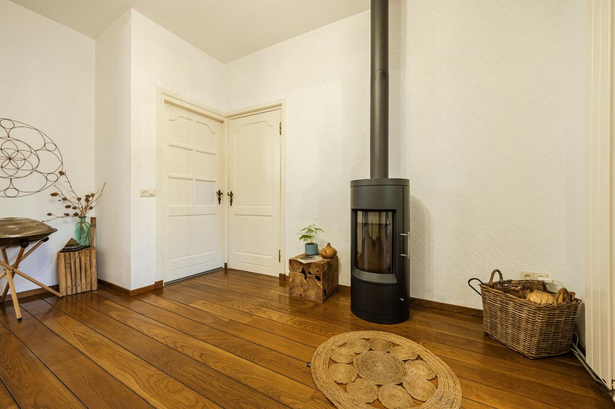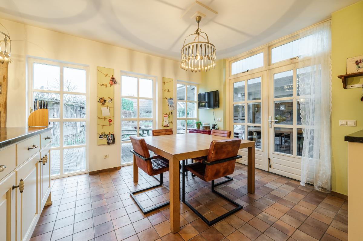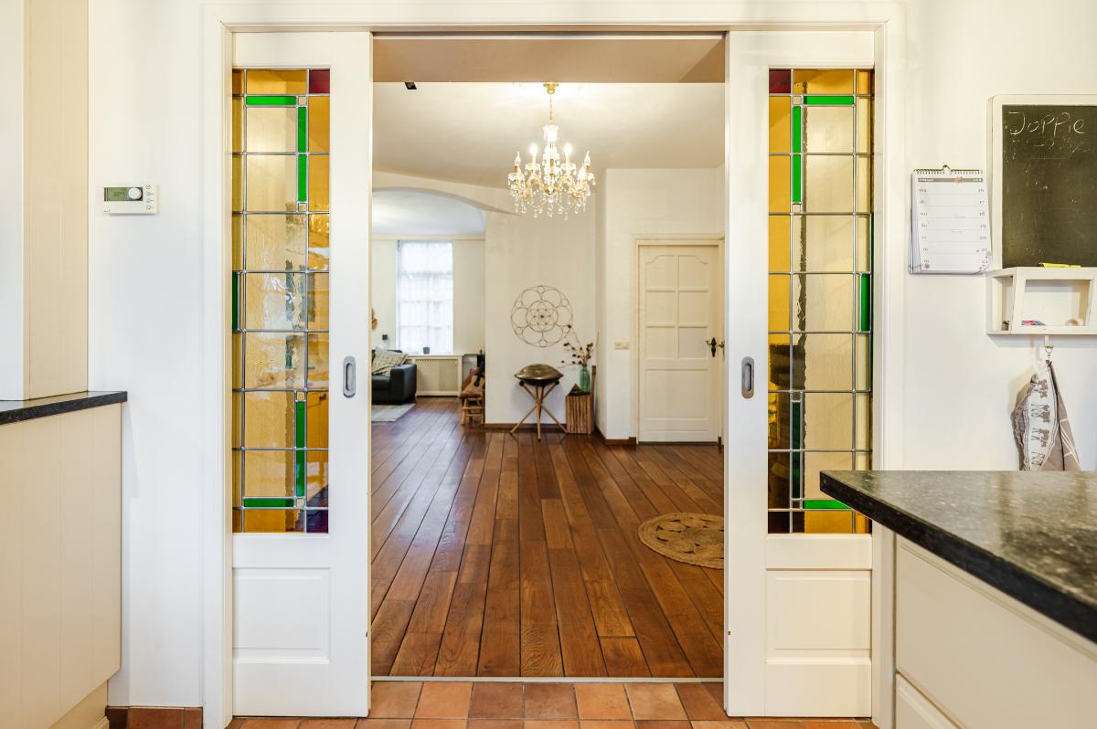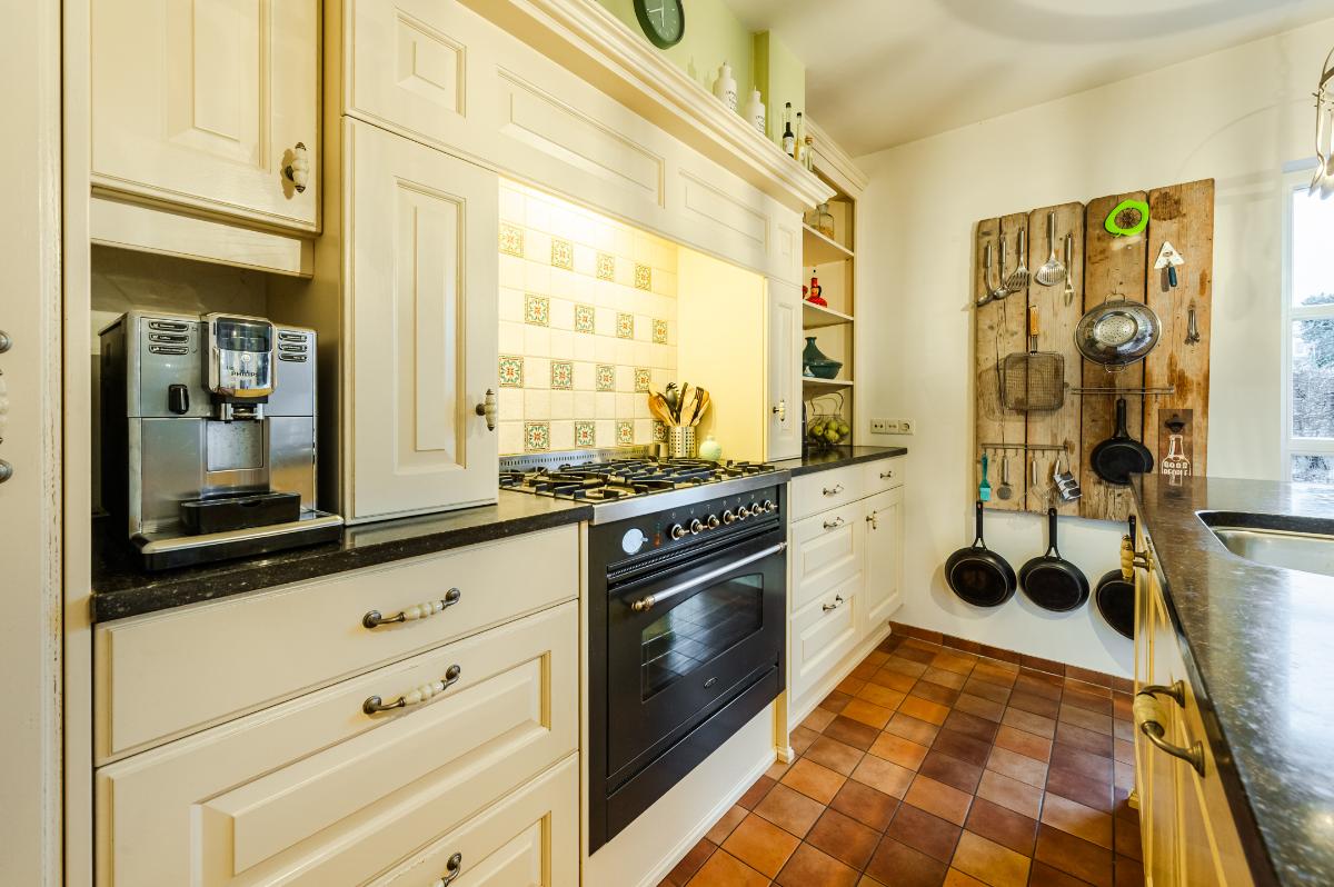 Indeling: Begane grond: Entree naar ontvangsthal met meterkast. Z-vormige woonkamer met houten vloer, stucwerk met sierlijsten en sfeervolle houtkachel. Toegang tot de opkamer, een praktische kelder en de bijkeuken waar ook het toilet te vinden is. Aan de voorzijde bevindt zich de voormalige keuken, super handig als extra ruimte voor de kookliefhebber maar ook eenvoudig om te vormen naar bijvoorbeeld een speelkamer voor de kinderen of werkkamer aan huis. De huidige keuken bevindt zich in de aanbouw aan de achterzijde en is van de woonkamer gescheiden door karakteristieke glas-in-lood en-suite schuifdeuren. De keuken biedt ruimte voor een grote eettafel en heeft een prettige oriëntatie op de tuin. De inrichting is landelijk met centraal een spoeleiland. Op de vloer ligt een boeren plavuizen tegelvloer met vloerverwarming en de apparatuur bestaat uit een vaatwasser, een koelkast en een groot fornuis met 6-pits gaskookplaat, oven en afzuigkap.