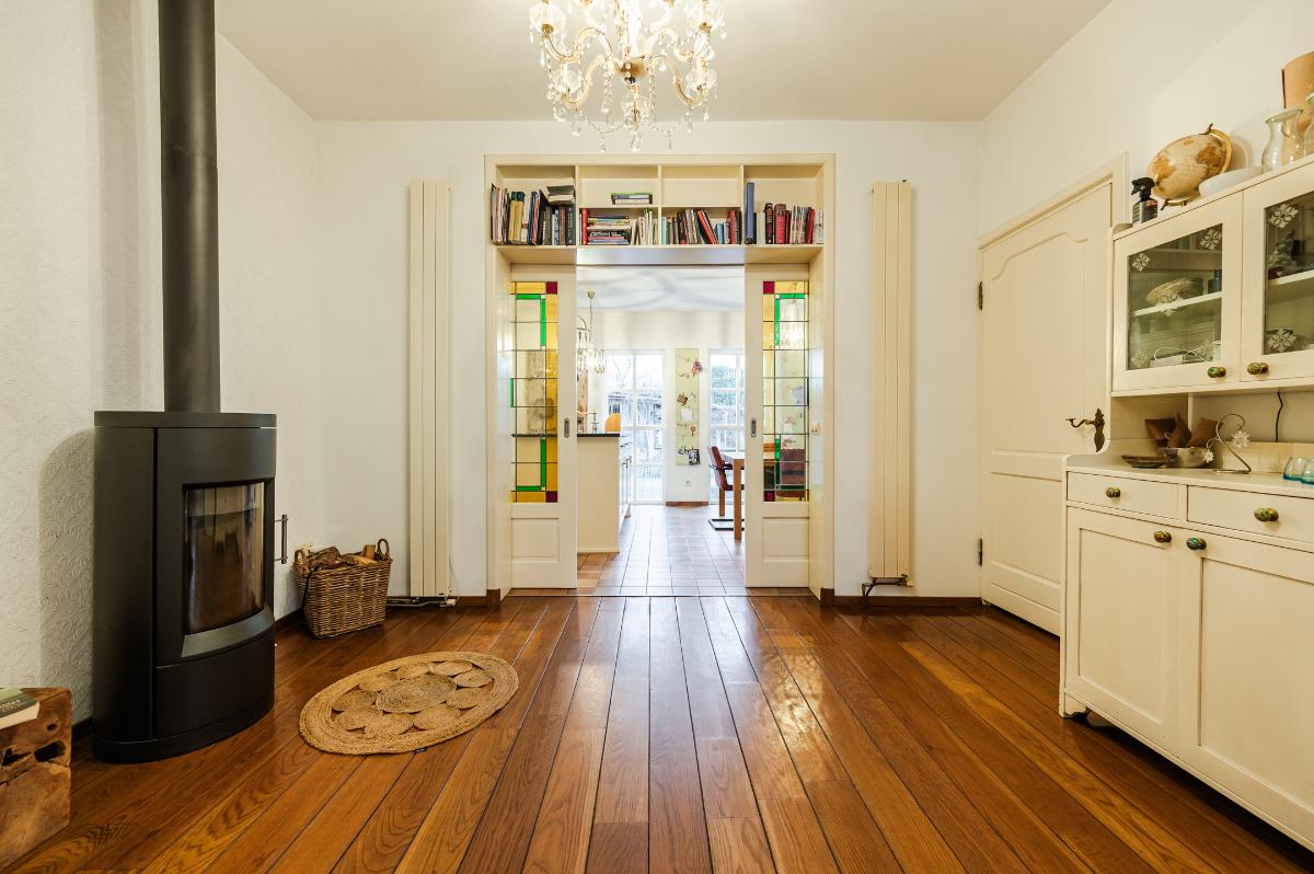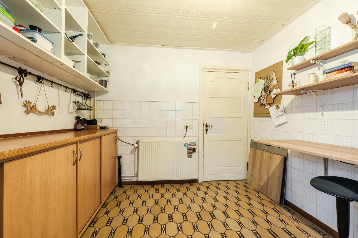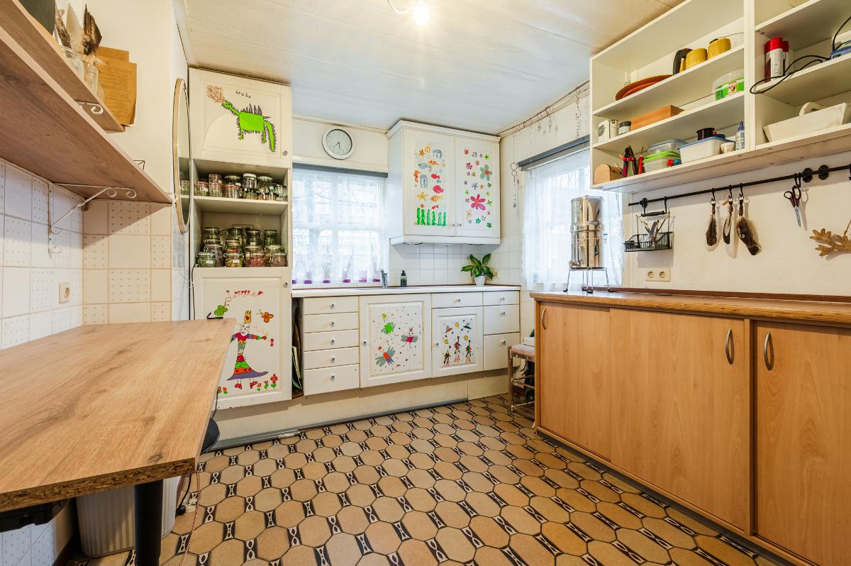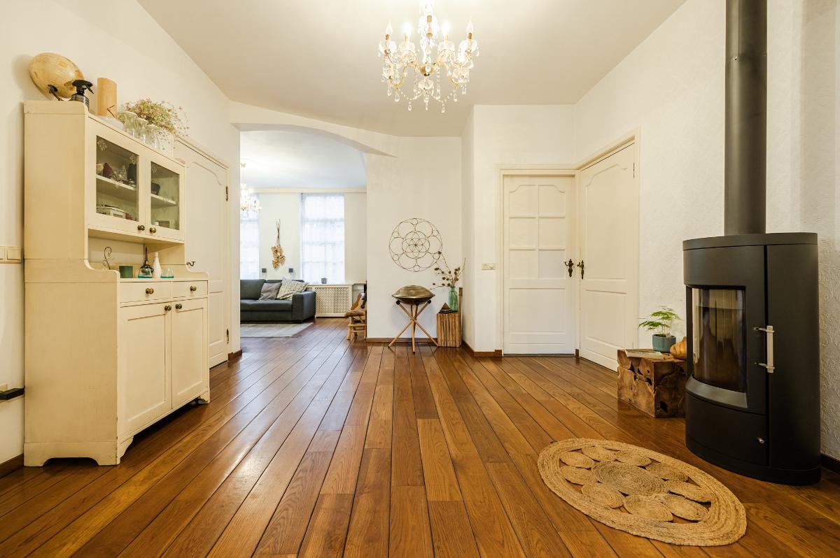 Indeling: Begane grond: Entree naar ontvangsthal met meterkast. Z-vormige woonkamer met houten vloer, stucwerk met sierlijsten en sfeervolle houtkachel. Toegang tot de opkamer, een praktische kelder en de bijkeuken waar ook het toilet te vinden is. Aan de voorzijde bevindt zich de voormalige keuken, super handig als extra ruimte voor de kookliefhebber maar ook eenvoudig om te vormen naar bijvoorbeeld een speelkamer voor de kinderen of werkkamer aan huis. De huidige keuken bevindt zich in de aanbouw aan de achterzijde en is van de woonkamer gescheiden door karakteristieke glas-in-lood en-suite schuifdeuren. De keuken biedt ruimte voor een grote eettafel en heeft een prettige oriëntatie op de tuin. De inrichting is landelijk met centraal een spoeleiland. Op de vloer ligt een boeren plavuizen tegelvloer met vloerverwarming en de apparatuur bestaat uit een vaatwasser, een koelkast en een groot fornuis met 6-pits gaskookplaat, oven en afzuigkap.