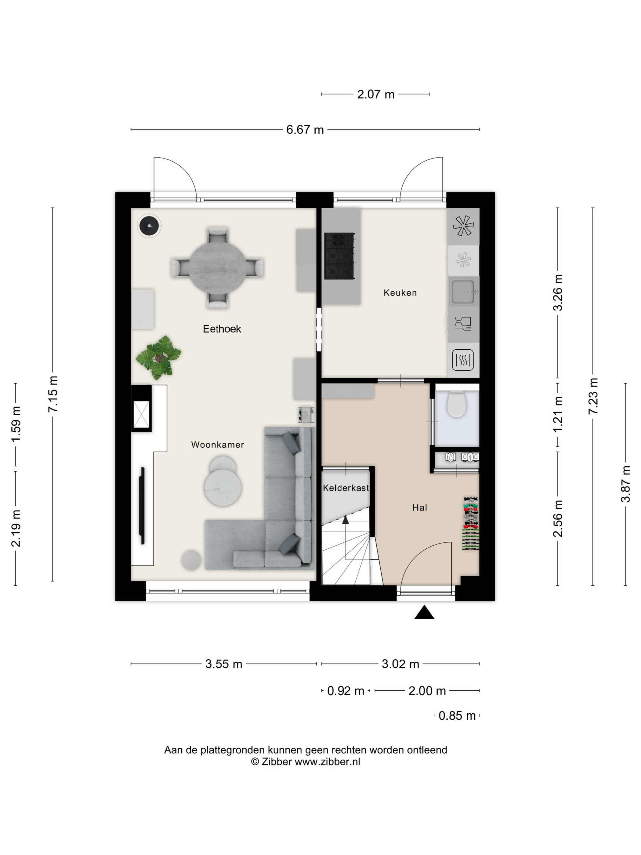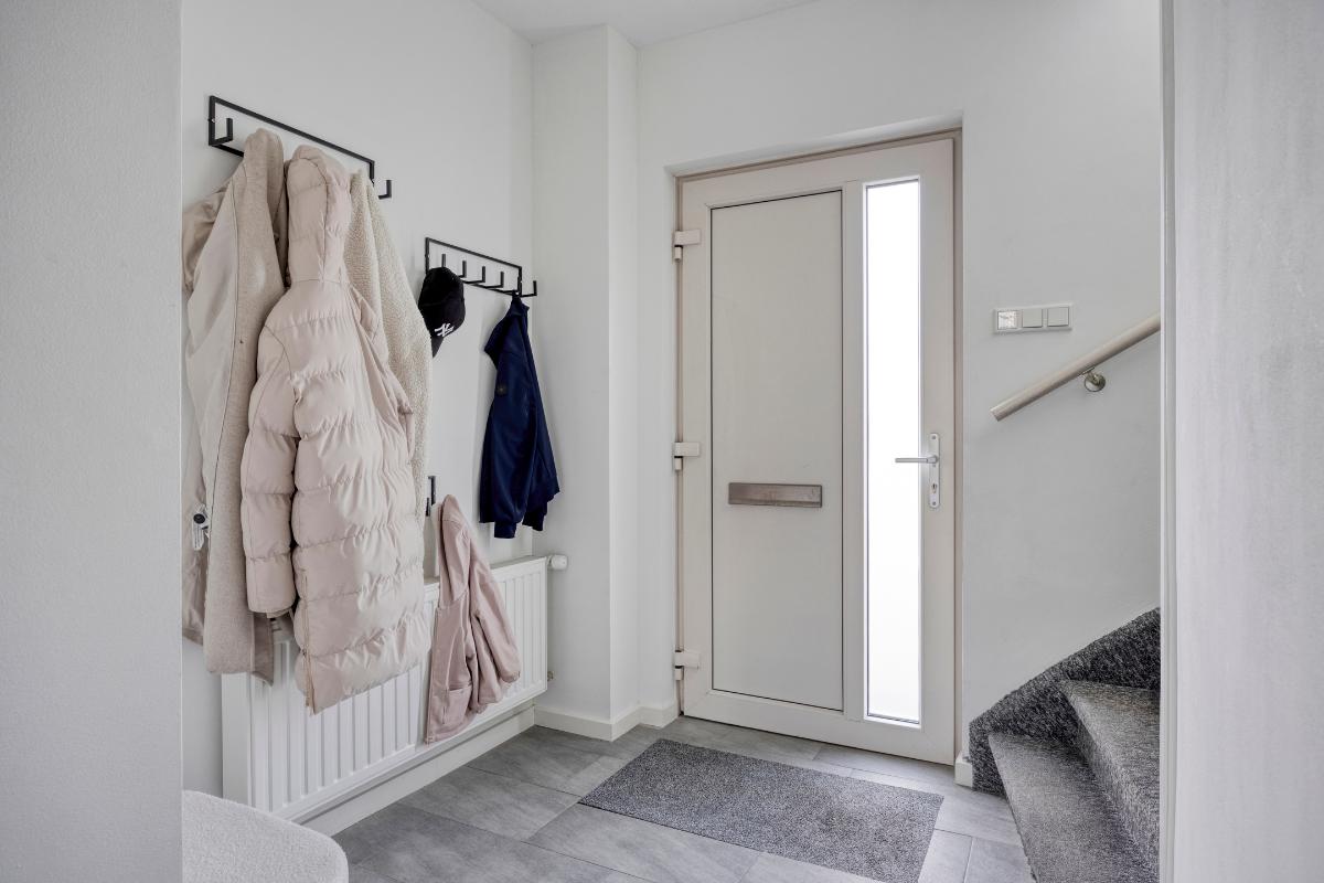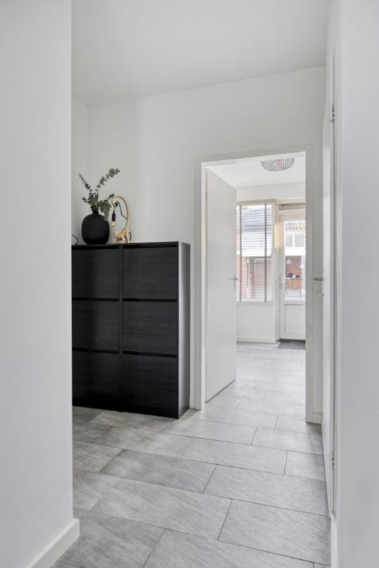 Deze ruime, Z-vormige hal is afgewerkt met een fraaie, grijs gemêleerde tegelvloer (welke is doorgelegd in de keuken) en voorzien van een put met de watermeter, de vernieuwde meterkast en een praktische, koele en geventileerde trap-/kelderkast met legplanken en een lichtpunt. Daarnaast bevindt zich in deze hal de toiletruimte, de bekleedde trapopgang naar de verdieping en de deur naar de keuken.
