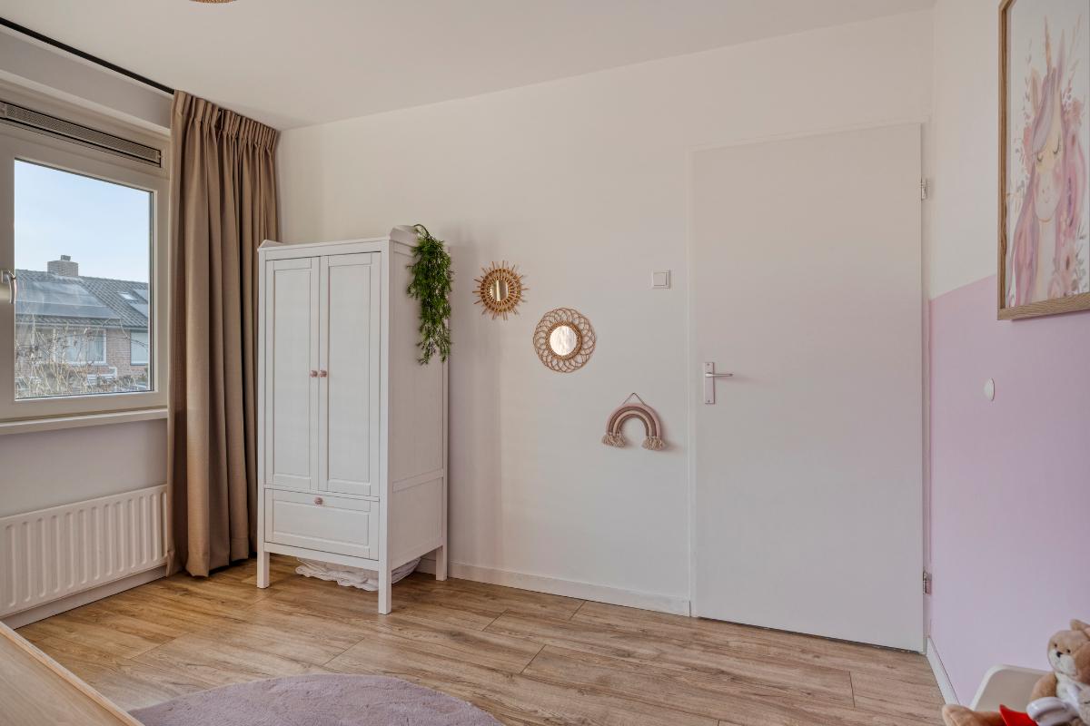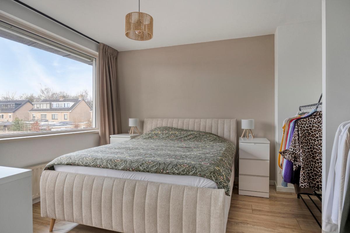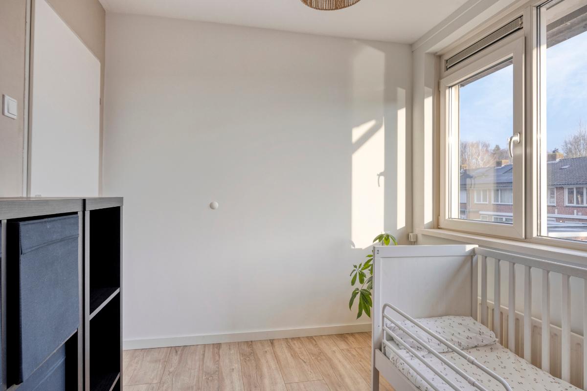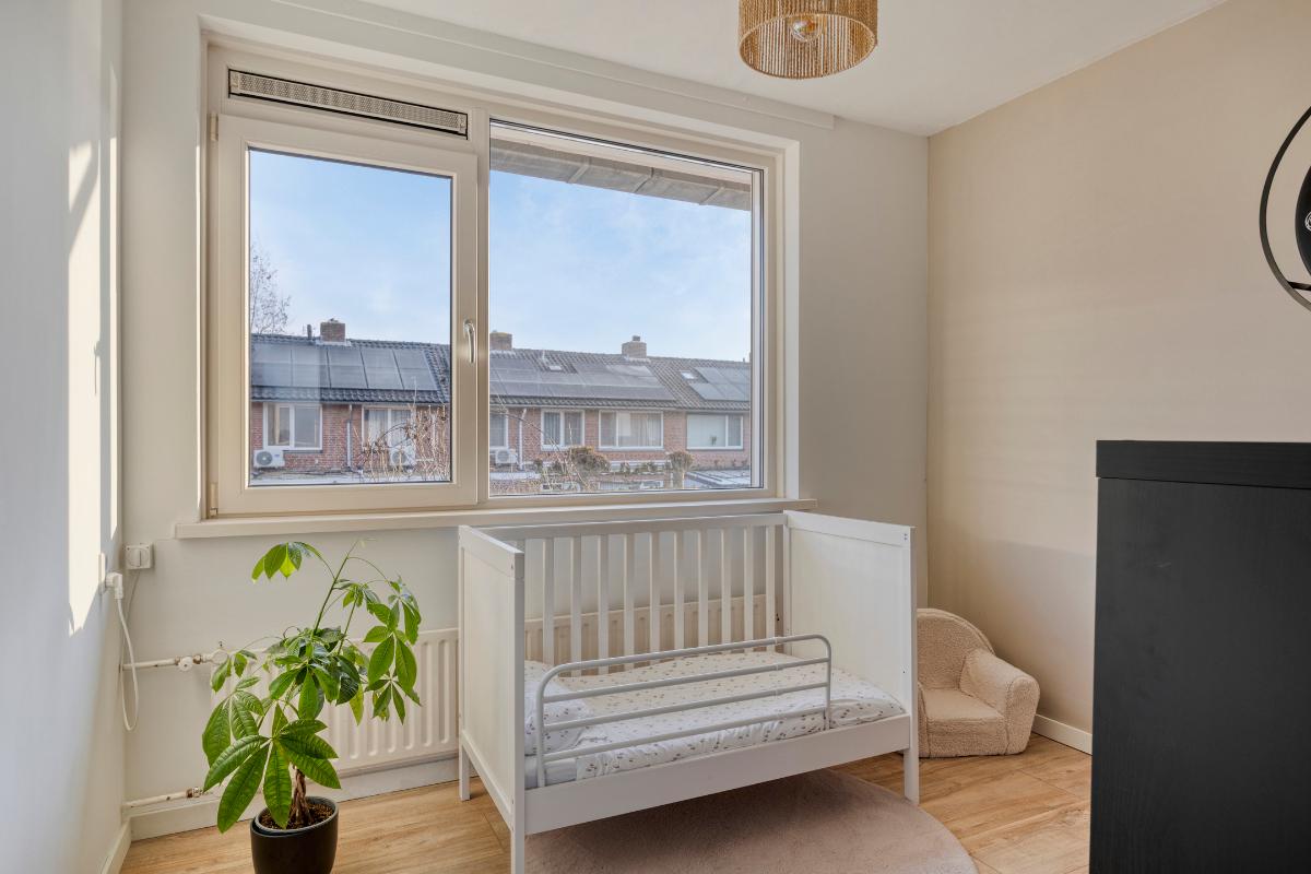 De 3 ruime slaapkamers zijn allen voorzien van laminaatvloeren en kunststof kozijnen met draai-/kiepramen en rolluiken, waarvan die op de achterkamers elektrisch bedienbaar. De ouderslaapkamer heeft 2 nissen, waarvan eenvoudig een vaste kastenwand zou kunnen worden gemaakt en een kunststof deur naar het kleine balkon aan de voorzijde.