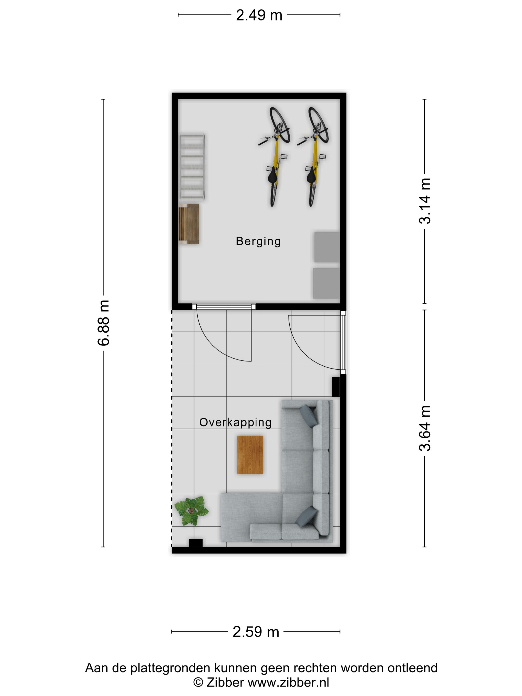 Van onder deze overkapping heeft u vervolgens toegang tot de halfsteens berging (van ± 8 m²) met een betonvloer, houten platdak, elektra en TL-verlichting, welke ideaal is voor bijvoorbeeld opslag, het stallen van fietsen en de mini-containers en/of het gebruik als werk-/hobbyruimte.