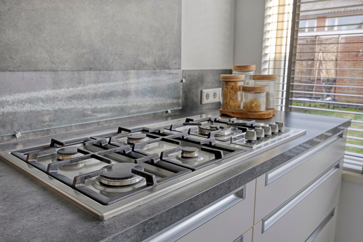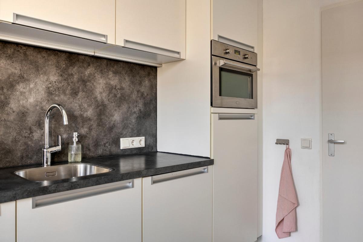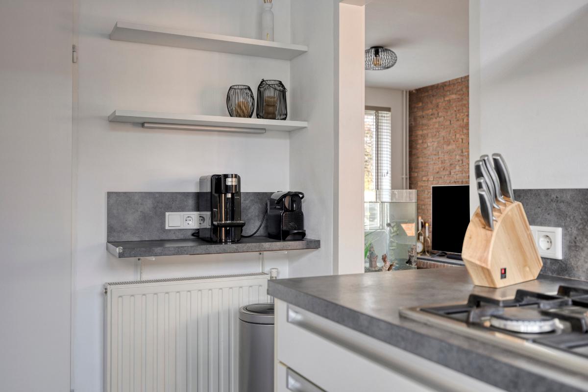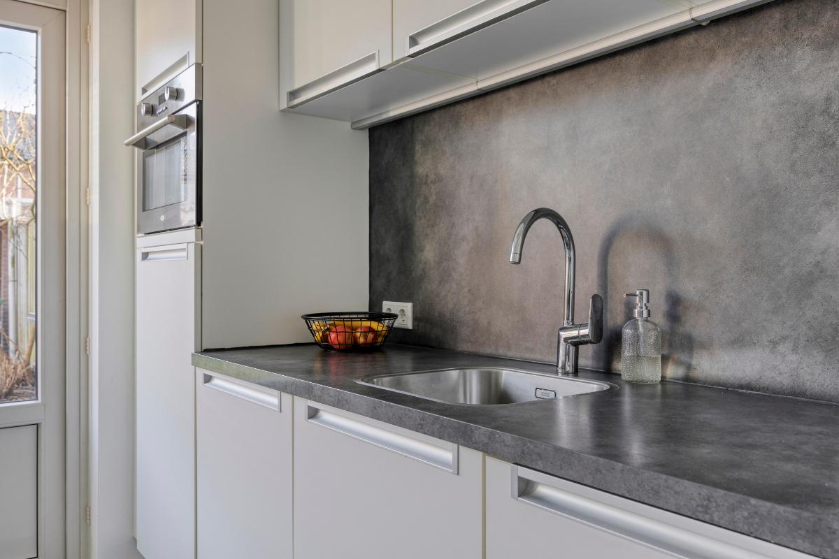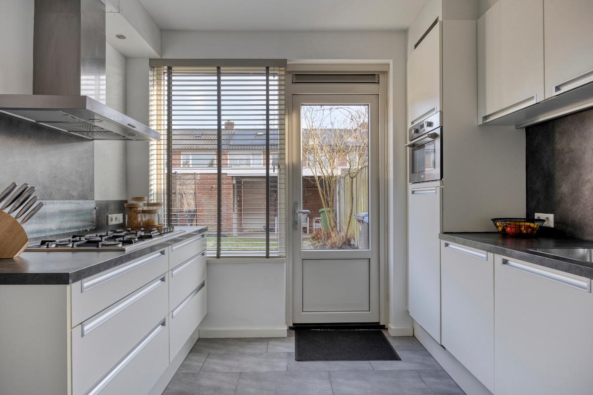 De ruime keuken bevindt zich aan de achterzijde van de woning, met een kunststof deur naar de achtertuin. Deze keuken is modern en praktisch ingericht, met enerzijds een recht keukenblok met onder- en bovenkasten met laden, een houten aanrechtblad en achterwand met een RVS spoelbak met éénhendelmengkraan en LED-strips onder de bovenkasten en een ingebouwde vaatwasser, combimagnetron, oven, vriezer en koelkast. Aan de andere zijde bevindt zich een 2e keukenblok met laden en een houten blad met plint en achterwand en een 5-pits RVS gaskookplaat met wokbrander met daarboven een brede RVS afzuigkap en een plafondkoof met LED-inbouwspots.