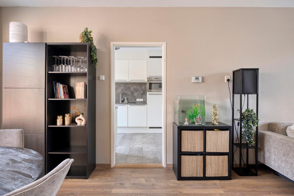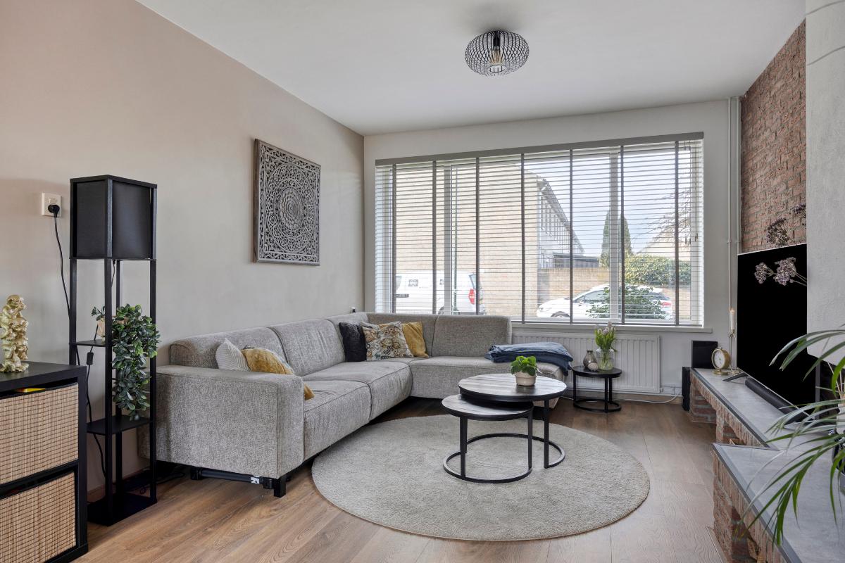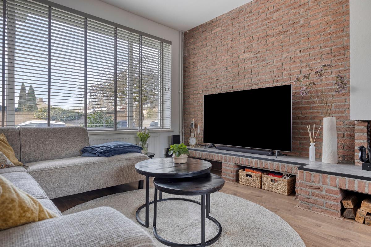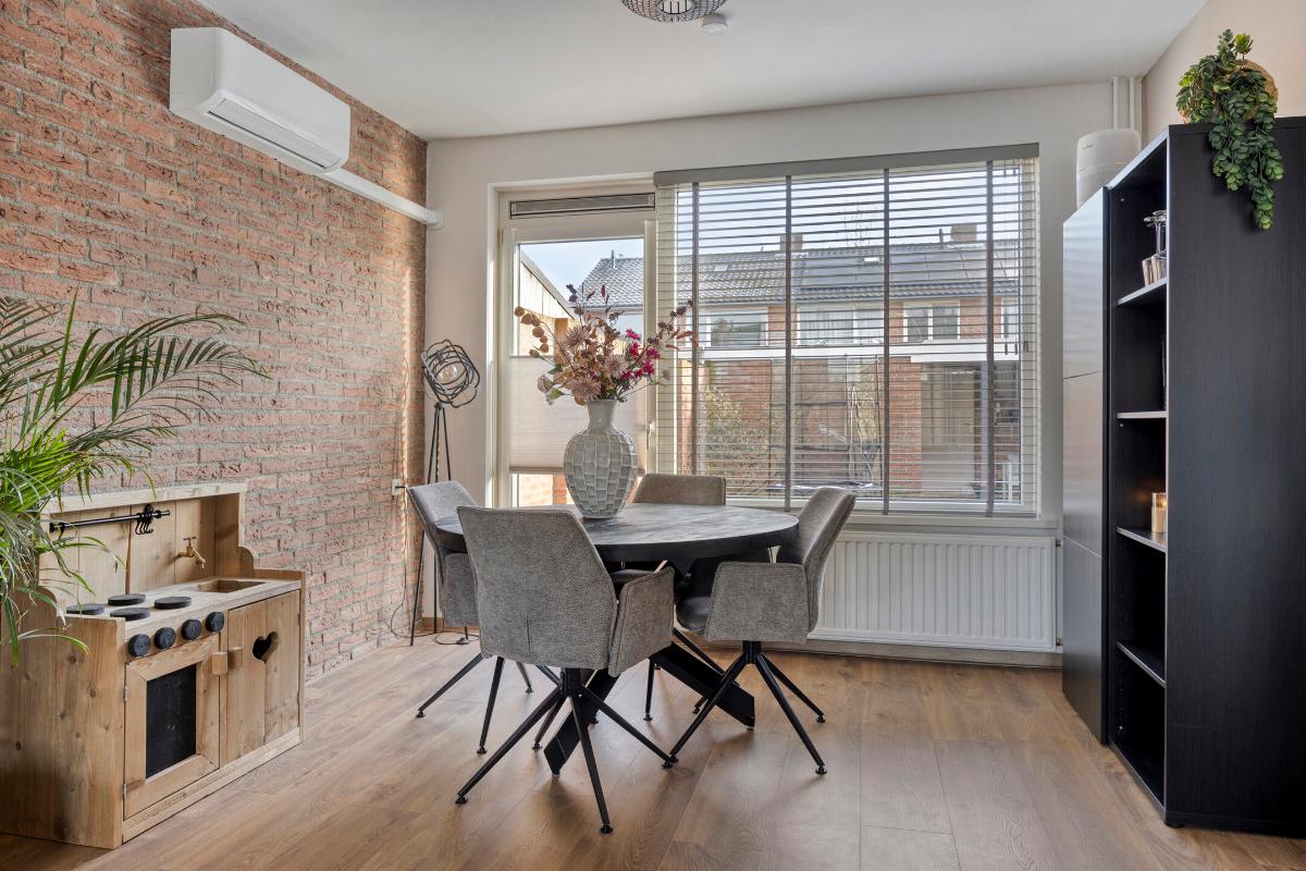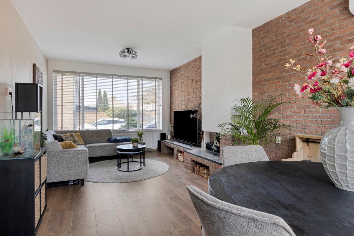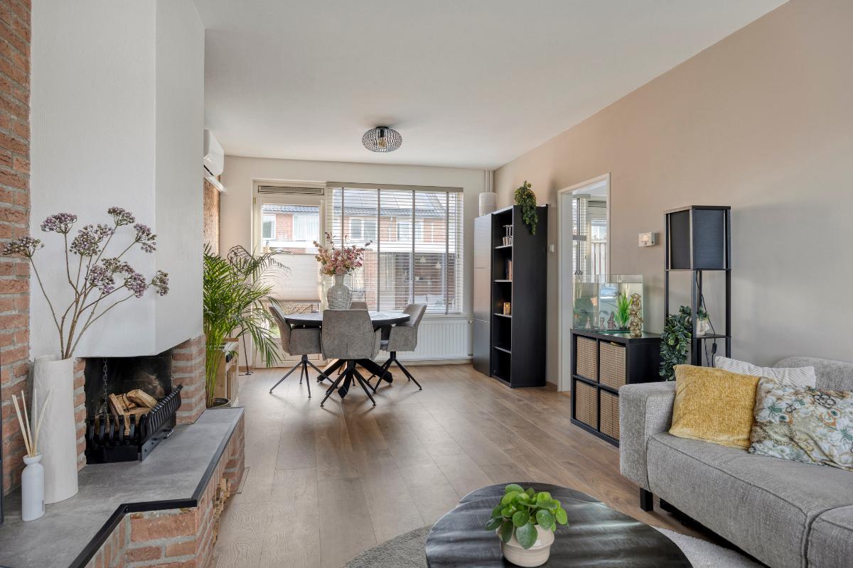 Vanuit de keuken heeft u vervolgens toegang tot de sfeervolle, lichte doorzon-woonkamer, met grote kunststof raampartijen aan zowel de voor- als achterzijde, welke zorgen voor veel directe daglichttoetreding. Deze woonkamer is voorzien van een laminaatvloer over de houten vloer, een sfeervolle open haard met een betegeld plateau, de glasvezelaansluiting en een in 2022 geplaatste airco, die zowel kan koelen als verwarmen. T.p.v. het raam aan de voorzijde bevindt zich een elektrisch bedienbaar rolluik en in het eetgedeelte een kunststof deur naar de achtertuin.