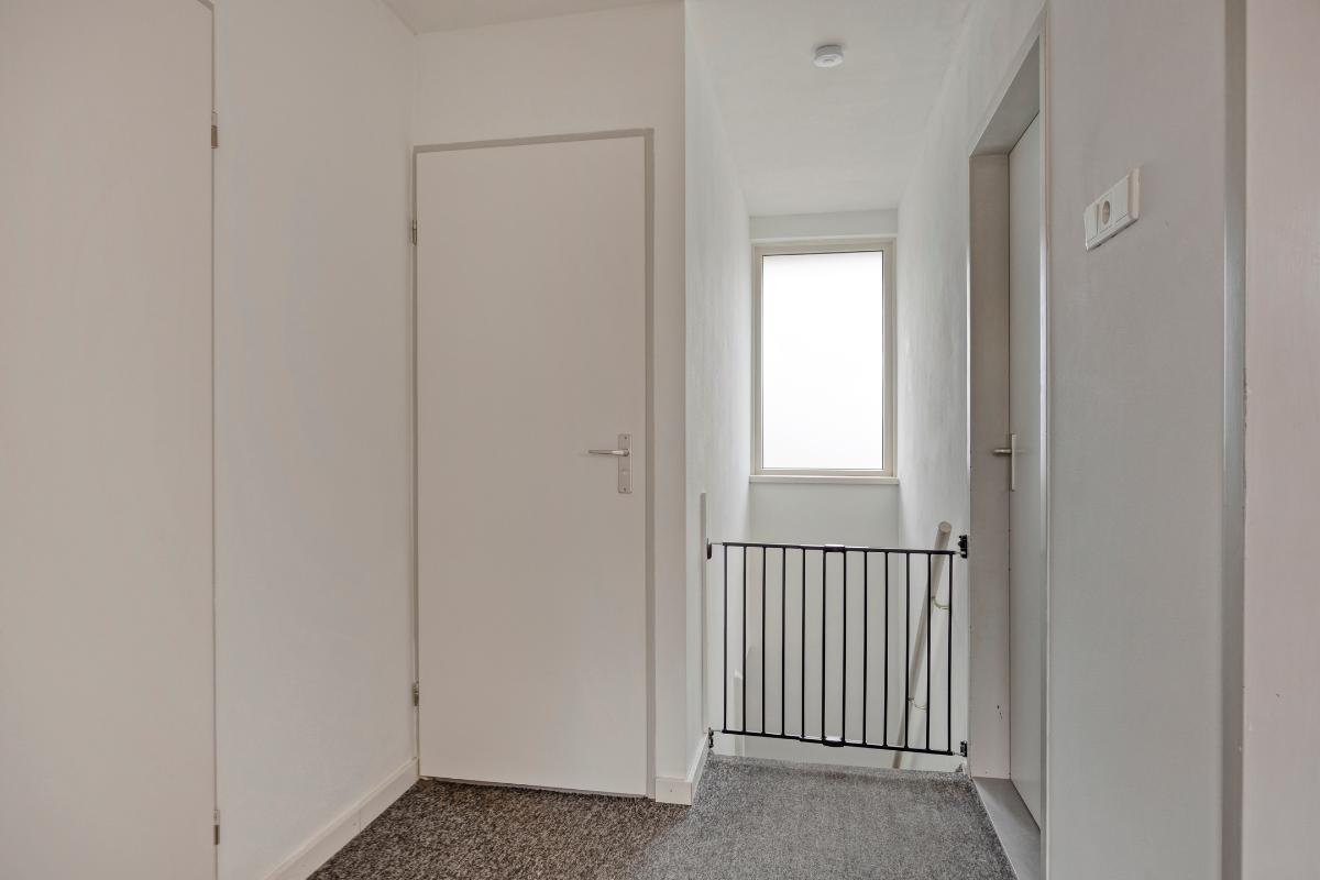 1e VERDIEPING: De overloop op deze verdieping, met vloerbedekking en een raam in de voorgevel boven de trapopgang, geeft toegang tot de badkamer, de wasruimte en de 3 drie slaapkamers. Tevens bevindt zich hier een plafondluik met aluminium schuiftrap naar de zolder.