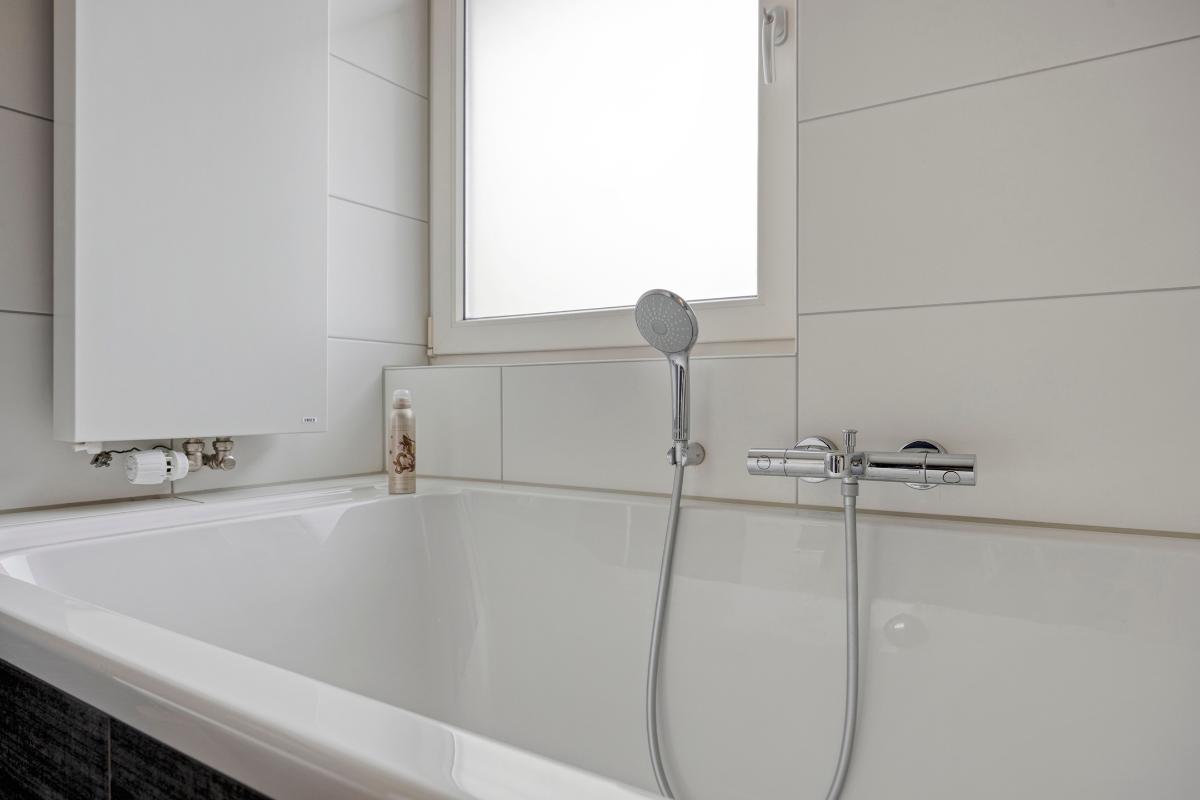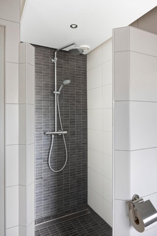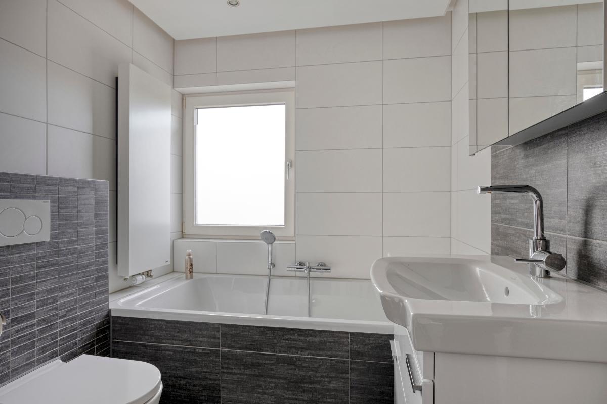 De luxe gerenoveerde badkamer is volledig betegeld en voorzien van een verlaagd plafond met indirecte LED-verlichting en halogeen inbouwspots op dimmer, alsmede een kunststof draai-/kiepraam t.b.v. de daglichttoetreding en extra ventilatie. Deze badkamer is ingericht met een groot kunststof ligbad met handdouche en een thermostaatkraan, een royale inloopdouche met een hand- én regendouche met thermostaatkraan en een RVS douchegootje, een 2e wandcloset, een wastafelmeubel met een designkraan en 2 laden en een spiegelkastje met verlichting en een stopcontact, alsmede een designradiator.