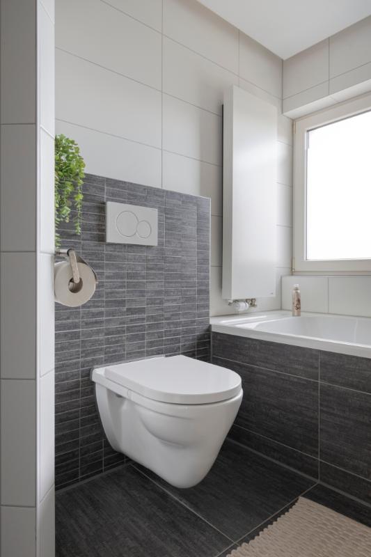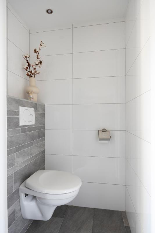 De keurige, gemoderniseerde en volledig betegelde toiletruimte is voorzien van een verlaagd plafond met LED-inbouwspots en een wandcloset.