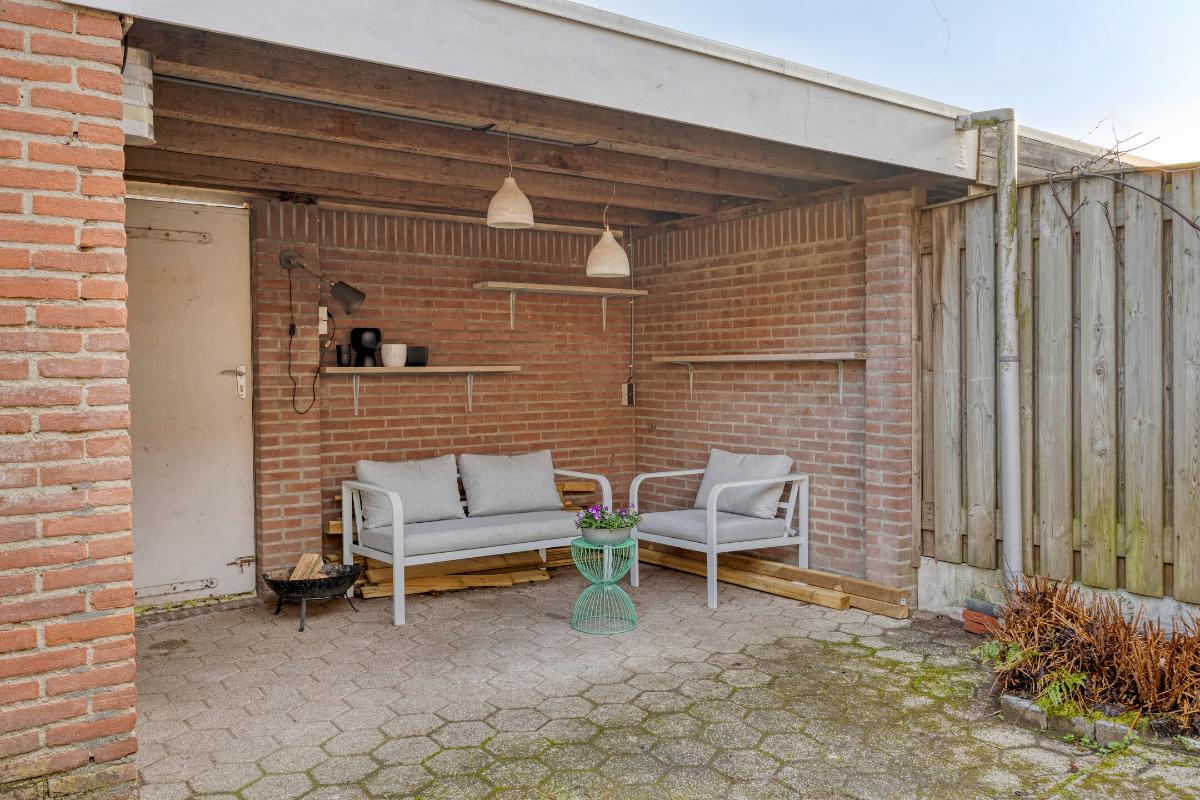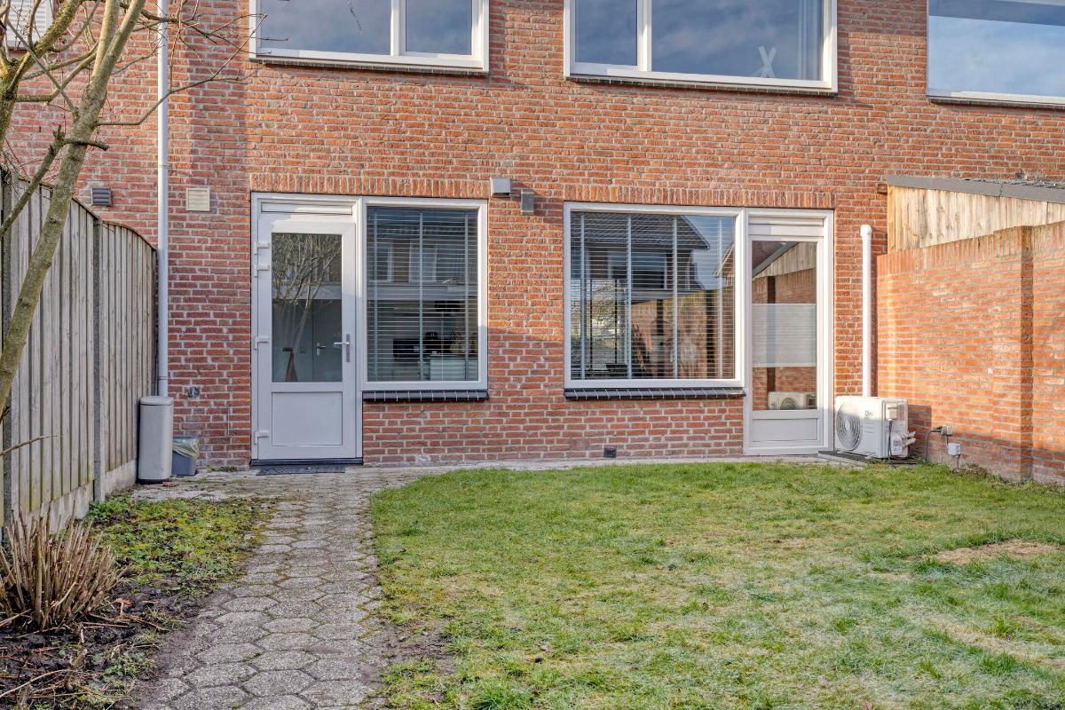 De ca. 11 meter diepe, op het noord-oosten gesitueerde achtertuin is volledig omsloten, met aan de ene zijde een houten en aan de andere zijde een gemetselde schutting en is aangelegd met beton-/grindtegels, een gazon en plantenborder. Tegen de achtergevel van de woning bevindt zich een lichtpunt en een buitenkraantje met afvoerputje, alsmede de buitenunit van de airco. Achterin de tuin bevindt zich een overdekt terras annex loungehoek, met enkele wandplankjes, elektra en een stopcontact, alsmede de afsluitbare poort naar het achtergelegen, niet-doorgaande buurpad.