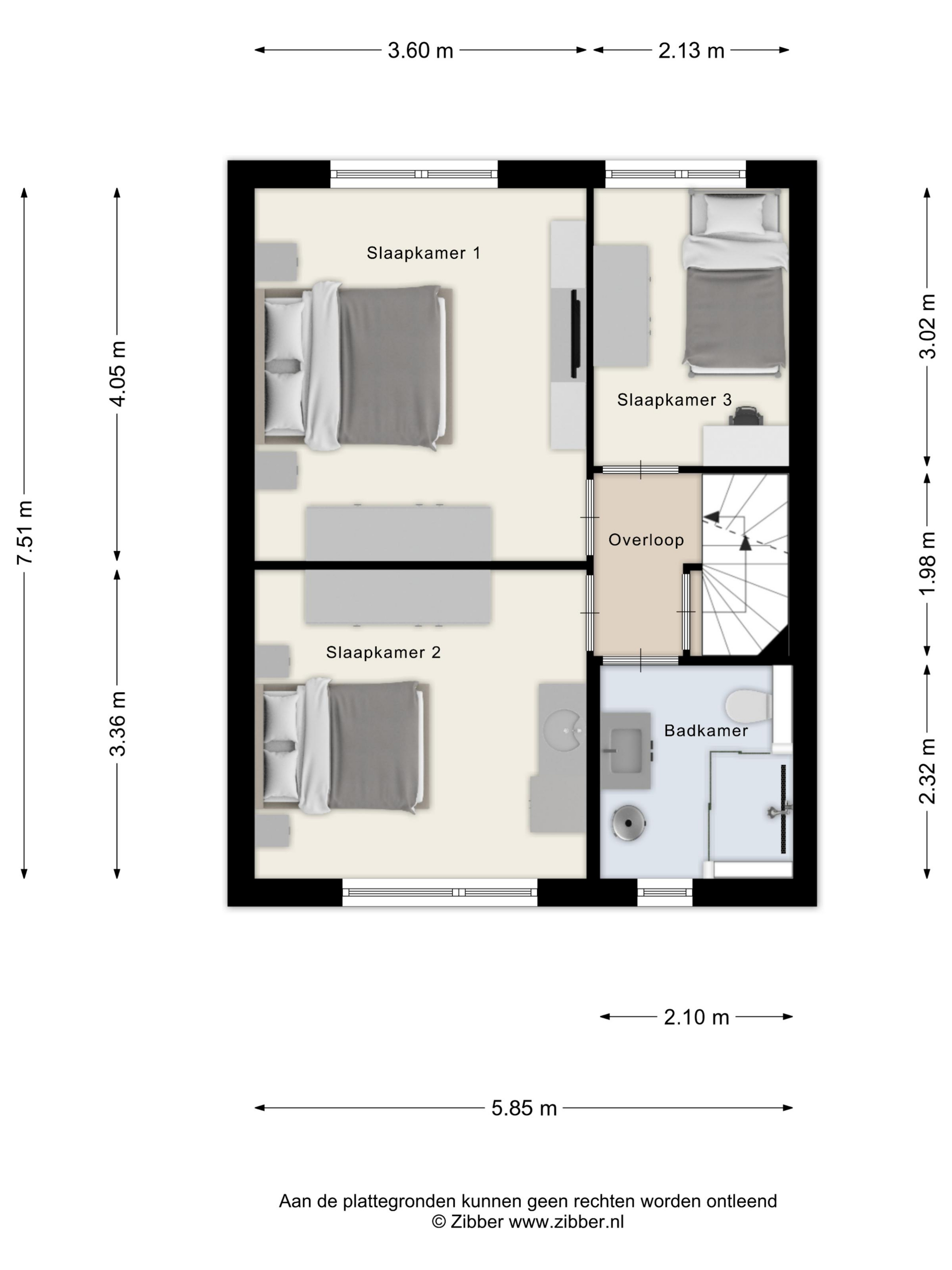 Via de beklede trapopgang betreedt u de overloop op deze verdieping, welke is voorzien van tapijttegels (welke grotendeels - over de bestaande parketvloer - zijn doorgelegd in de slaapkamers aan de achterzijde) en spachtelputz wanden, alsmede een deur naar de trapopgang naar de 2e verdieping. Vanaf deze overloop heeft u toegang tot de badkamer en de 3 slaapkamers op deze verdieping.