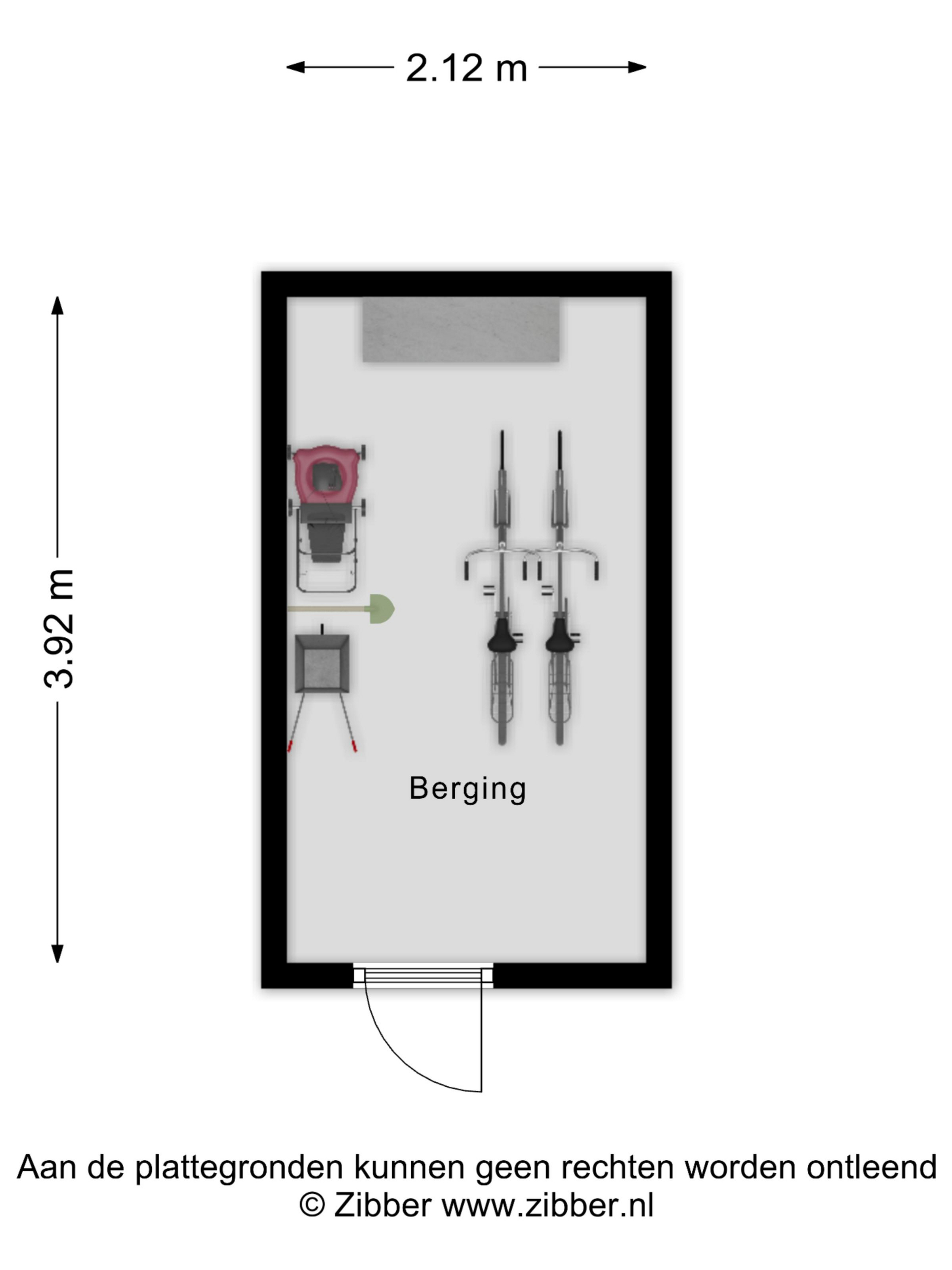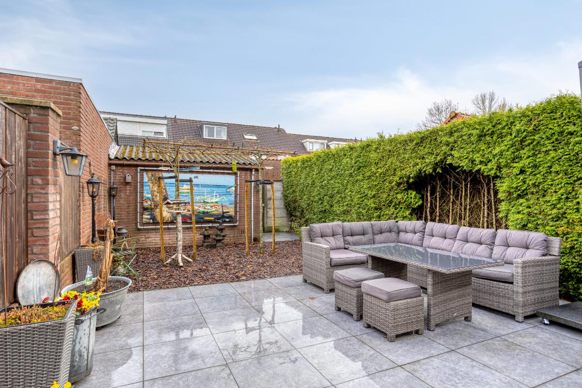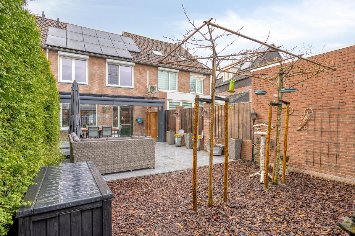 De eveneens keurig aangelegde, ca. 12 meter diepe en geheel omsloten achtertuin is gesitueerd op het zuidoosten en voorzien van een afsluitbare poort naar het achtergelegen buurpad. Deze tuin met tuinverlichting is grotendeels betegeld, met een border met boomschors tegen de berging achterin. Deze halfsteens berging (van ± 2.12. x 3.92 m.) is eveneens voorzien van een kunststof deur met HR++ glas, een tegelvloer, elektra en lichtpunten en een (naar alle waarschijnlijkheid asbesthoudend) golfplaten dak.