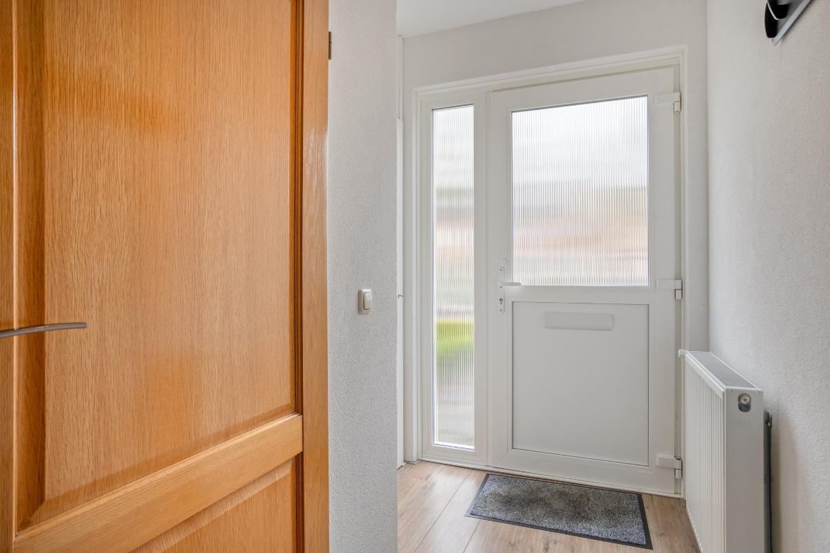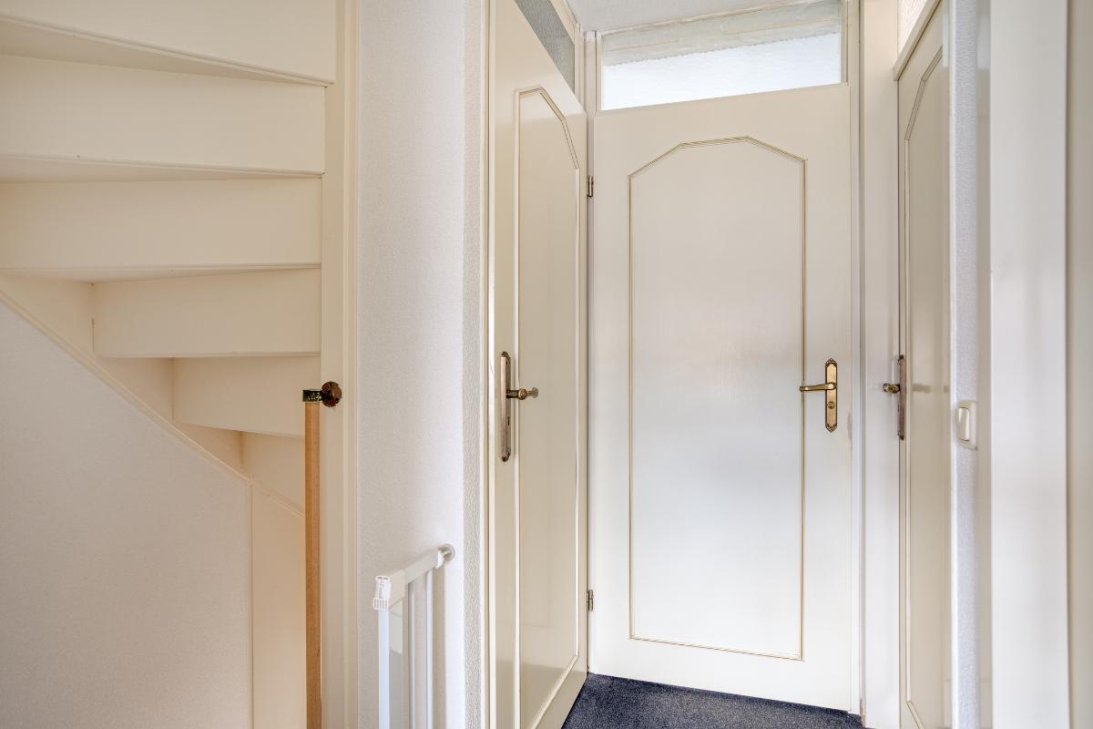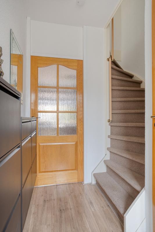 Via de kunststof voordeur betreedt u de hal van deze woning, welke is voorzien van een laminaatvloer (welke - over de oorspronkelijke plavuizenvloer - is doorgelegd over nagenoeg de gehele begane grond) en met spachtelputz afgewerkte wanden. In deze hal bevinden zich de meterkast, de toiletruimte en de beklede trapopgang naar de verdieping.