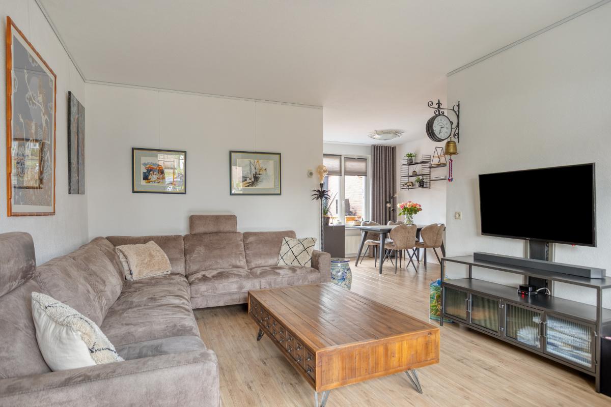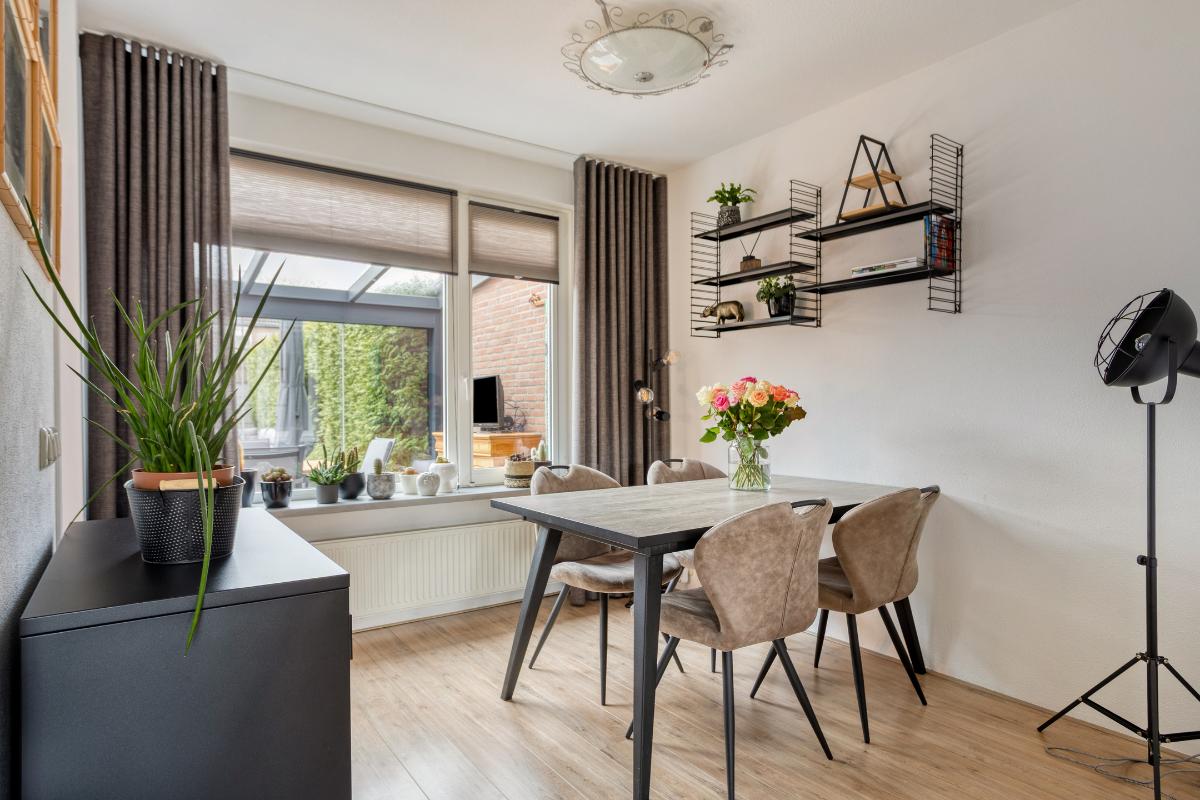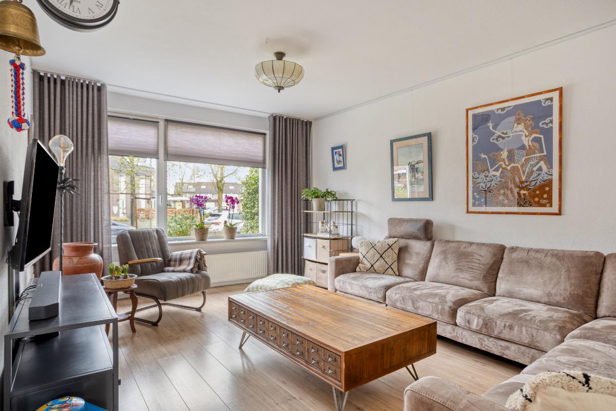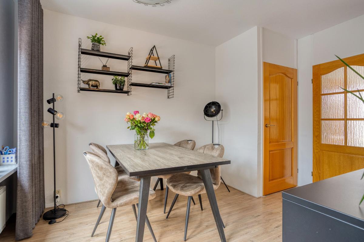 Vanuit de hal heeft u toegang tot de gezellige, Z-vormige woon-/eetkamer (van ± 29 m²), met kunststof kozijnen met draai-/kiepramen, welke naast de voormelde laminaatvloer eveneens is voorzien van met spachtelputz afgewerkte wanden. In dit woongedeelte bevinden zich de glasvezelaansluiting en een schilderij ophangsysteem, alsmede een praktische trapkast met de voormelde laminaatvloer, legplanken en een lichtpunt. Vervolgens heeft u vanuit de woon-/eetkamer toegang tot de semi-open keuken aan de achterzijde van de woning, met vinyl vloerbedekking, een verlaagd plafond met inbouwspots en de kunststof achterdeur met hordeur naar de aangebouwde tuinkamer.