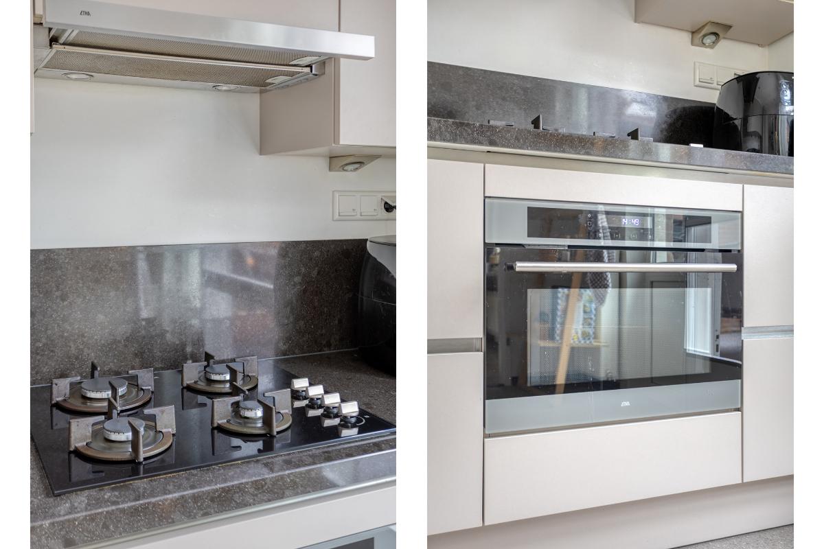 Deze keuken is in 2018 gerenoveerd en voorzien van een moderne, hoekopgestelde keukeninstallatie met diverse onder- en bovenkasten en laden (incl. een ‘Le Mans’ hoekkastsysteem), halogeen spots onder de bovenkasten en diverse stopcontacten, een composiet aanrechtblad met achterwand en een RVS spoelbak met een éénhendelmengkraan en een 4-pits glazen gaskookplaat, een vlakscherm-afzuigkap, een combi-oven/magnetron, vaatwasser (uit november 2023), koelkast en vriezer.