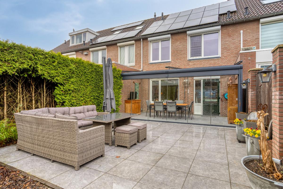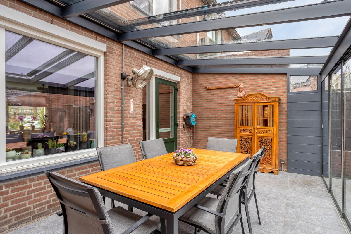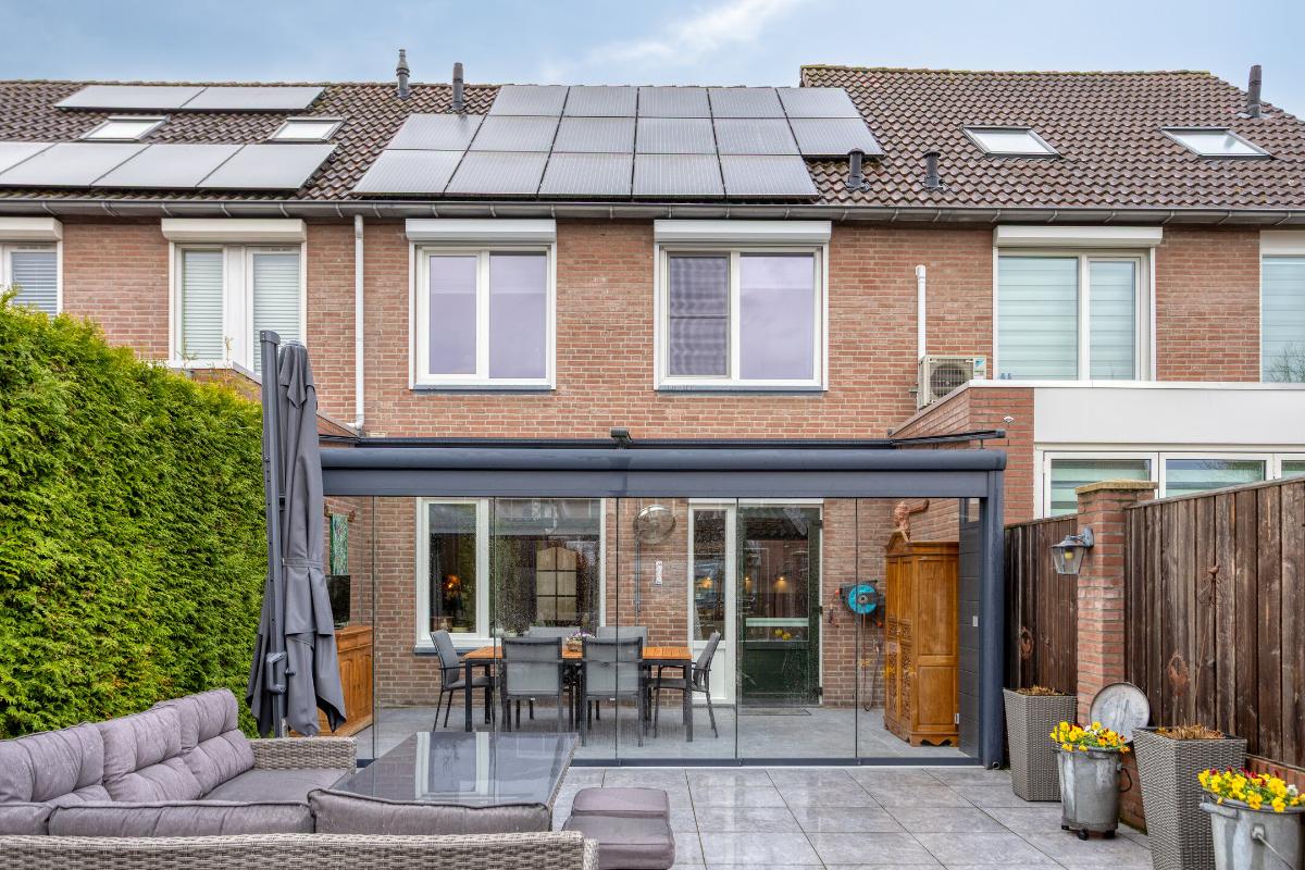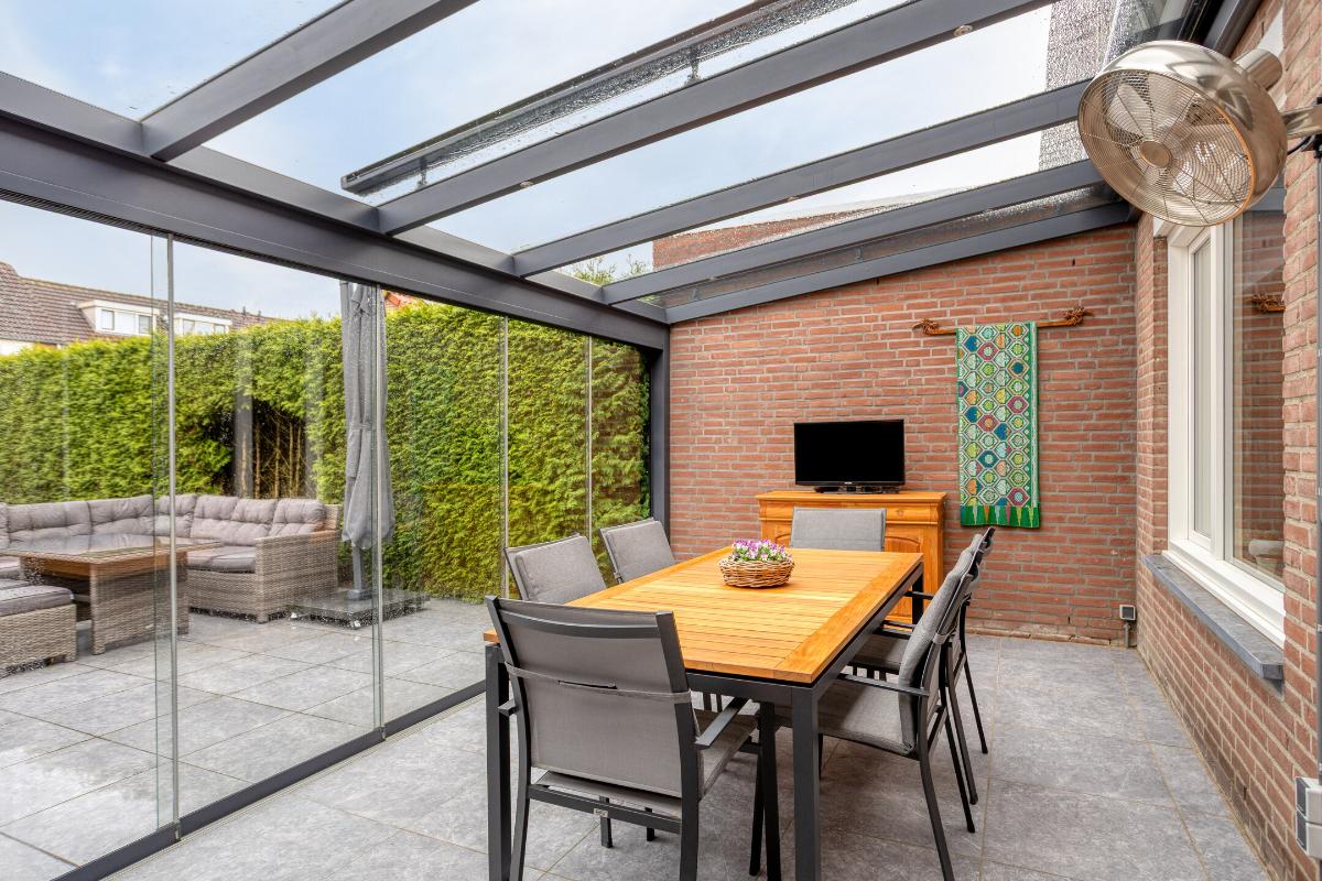 Tegen de achtergevel van de woning is in 2022 over de volle breedte een fraaie, aluminium tuinkamer geplaatst, welke is voorzien van glazen dakplaten met elektrische, op afstand bedienbare zonwering, eveneens op afstand bedienbare inbouwspots en 6 hardglazen schuifwanden. In deze tuinkamer bevinden zich een buitenkraantje met afvoerputje tegen de achtergevel van de keuken en diverse stopcontacten.
