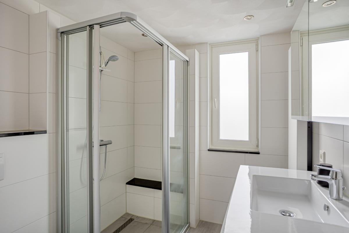 De gemoderniseerde en volledig betegelde badkamer, met een kunststof draai-/kiepraam in de voorgevel t.b.v. de daglichttoetreding en extra ventilatie en een verlaagd plafond met inbouwspots, is ingericht met een inloopdouche met aluminium douchewanden met schuifdeuren met hardglas, een klein plateau, een handdouche met thermostaatkraan en een RVS douchegootje, een 2e wandcloset en een wastafelmeubel met 2 laden en een éénhendelmengkraan, alsmede een dubbel bovenkastje met spiegeldeurtjes, verlichting en een stopcontact. Daarnaast bevindt zich in deze badkamer een designradiator en een elektrische afzuiging.