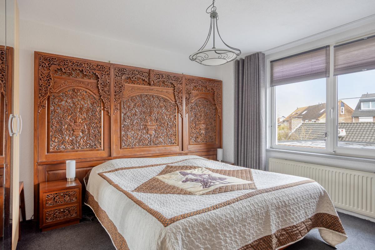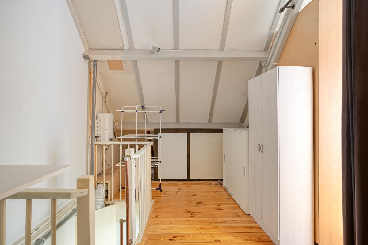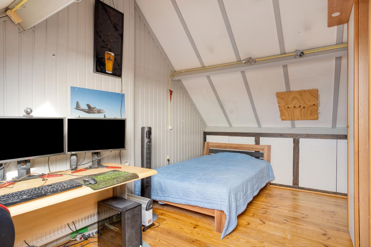 Vanaf de voorzolder betreedt u vervolgens de ruime zolderkamer annex 4e slaapkamer (van ± 15 m²), met de voornoemde grenen plankenvloer en de met kunststof schroten afgewerkte woningscheidende wand. Deze kamer is verwarmd en voorzien van een (in 2024 vernieuwd) ‘Velux’ dakraam met een verduisteringsgordijn/zonwering, alsmede van eveneens afgesloten bergruimtes onder de kaphelling aan de voor- en achterzijde en een enkele en een 2-deurs vaste kast.
