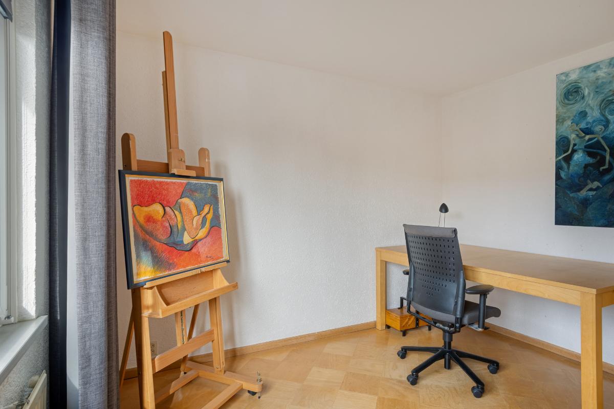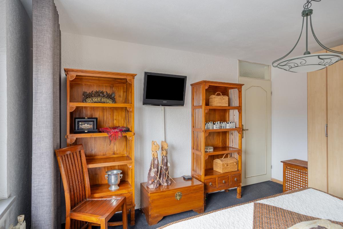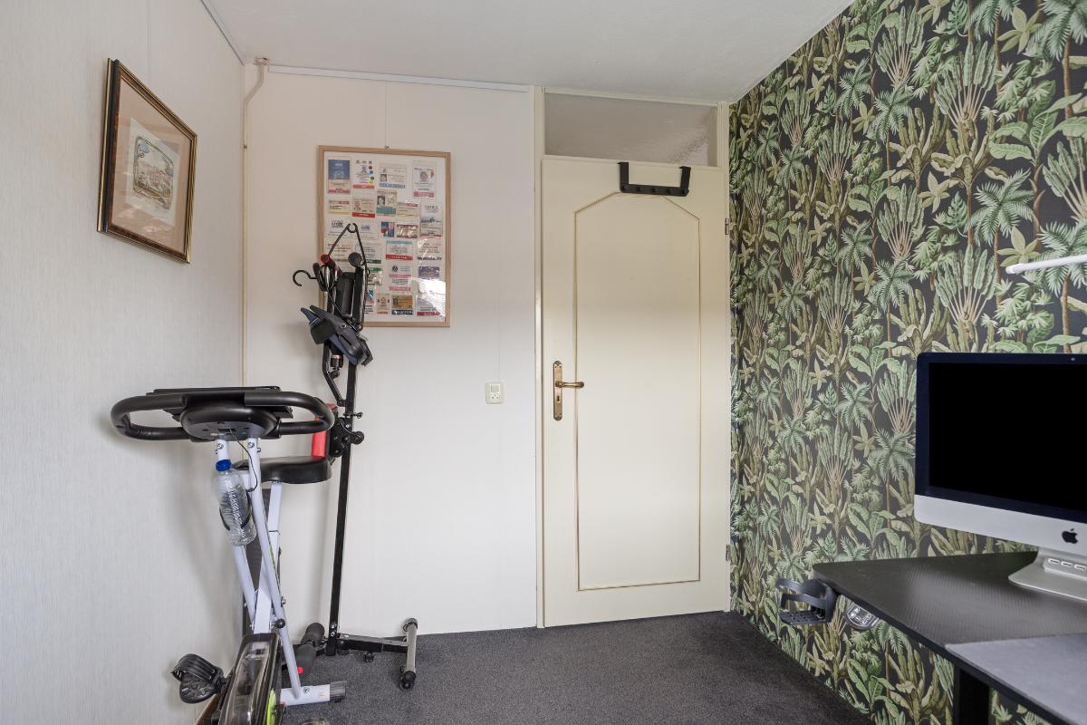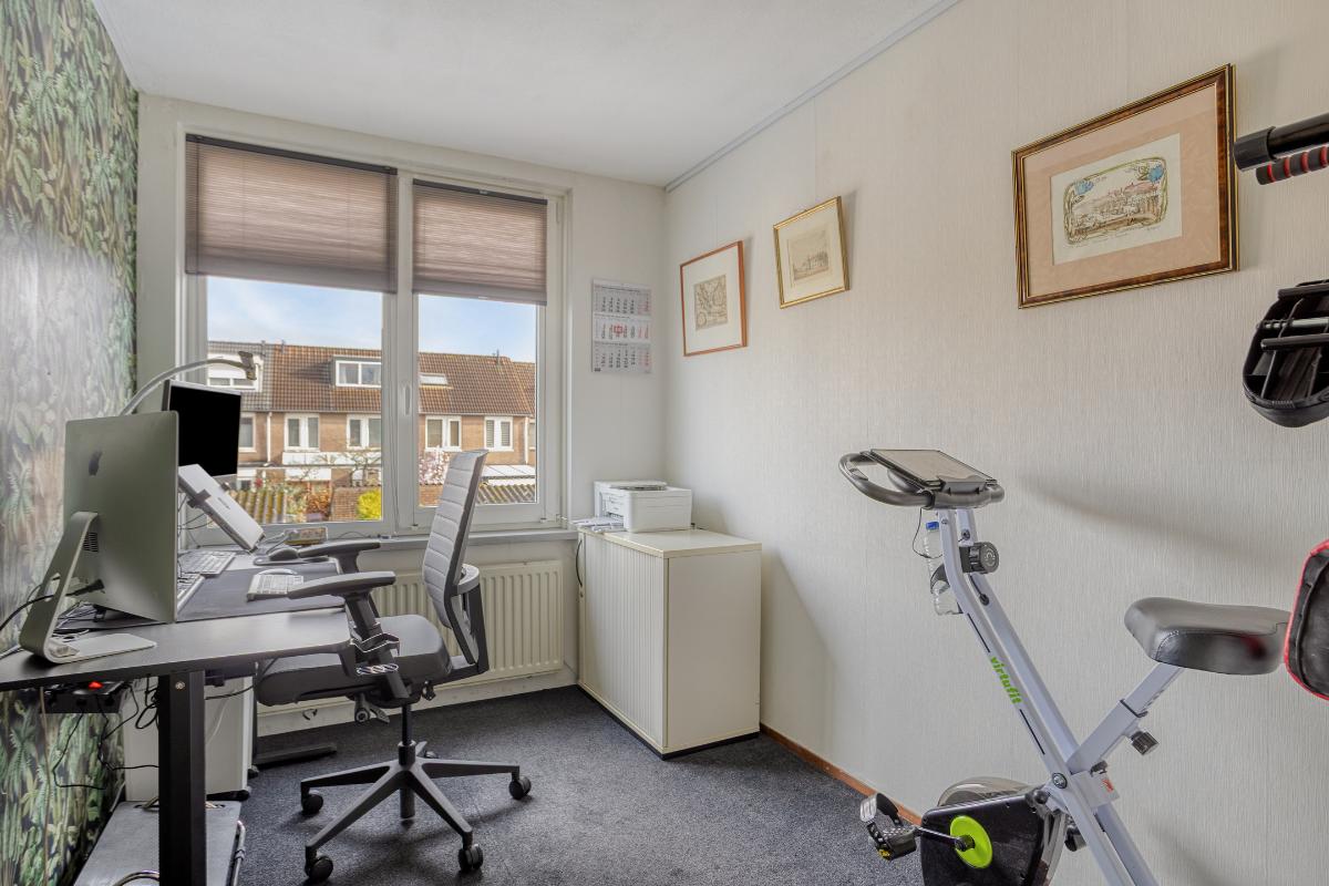Vanaf de voorzolder betreedt u vervolgens de ruime zolderkamer annex 4e slaapkamer (van ± 15 m²), met de voornoemde grenen plankenvloer en de met kunststof schroten afgewerkte woningscheidende wand. Deze kamer is verwarmd en voorzien van een (in 2024 vernieuwd) ‘Velux’ dakraam met een verduisteringsgordijn/zonwering, alsmede van eveneens afgesloten bergruimtes onder de kaphelling aan de voor- en achterzijde en een enkele en een 2-deurs vaste kast.