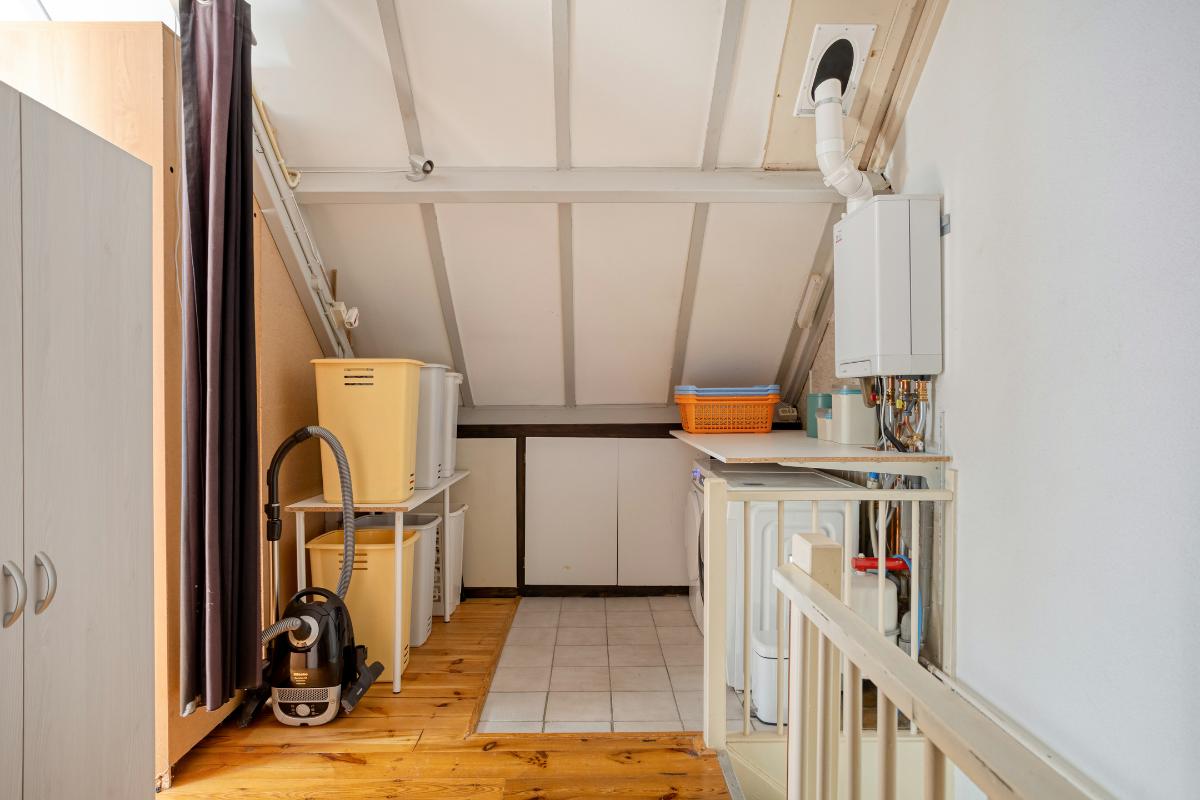 Via de vaste, beklede trap achter de deur op de 1e verdieping bereikt u de voorzolder op deze verdieping, welke grotendeels is afgewerkt met een grenen plankenvloer (welke is doorgelegd in de zolderkamer) en een deels betegelde vloer aan de achterzijde, met aldaar de aansluitingen t.b.v. de wasapparatuur en de opstelling van de in januari 2024 geïnstalleerde ‘Intergas Kompakt’ H.R.-combiketel (met bouwjaar: 2023). Daarnaast bevinden zich op deze voorzolder, aan zowel de voor als achterzijde, grotendeels afgesloten bergruimtes onder de kaphelling, de ‘Solar Edge’ omvormer t.b.v. de zonnepanelen en diverse stopcontacten.