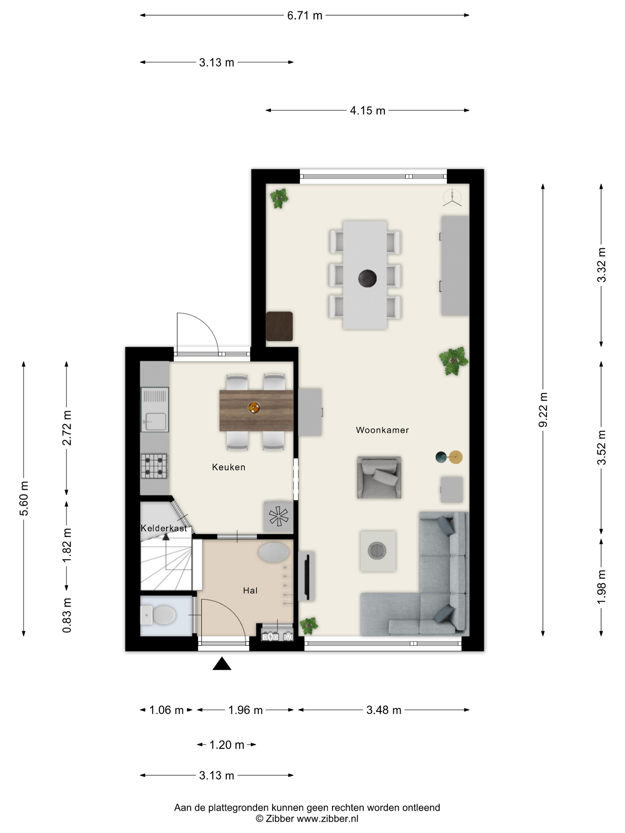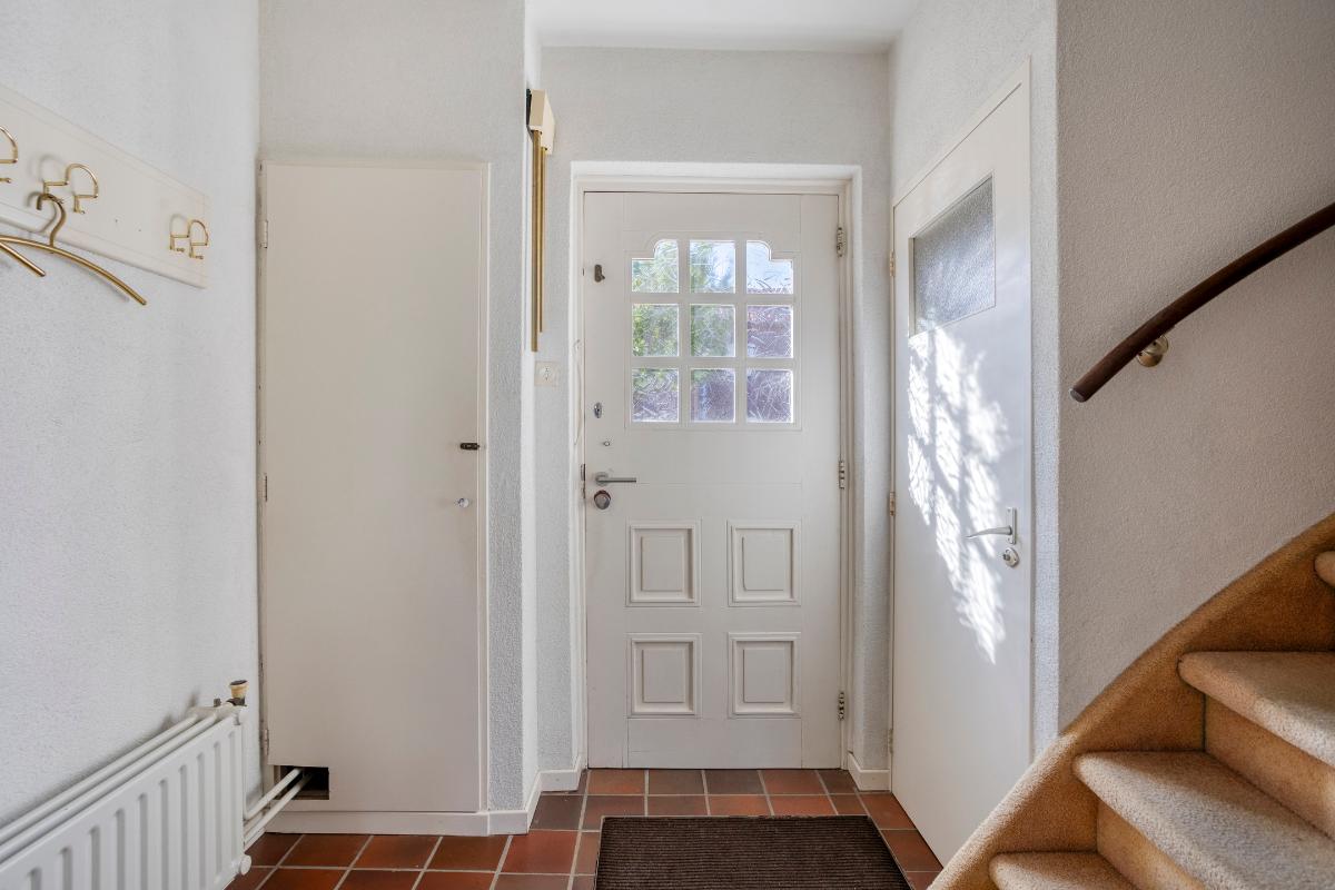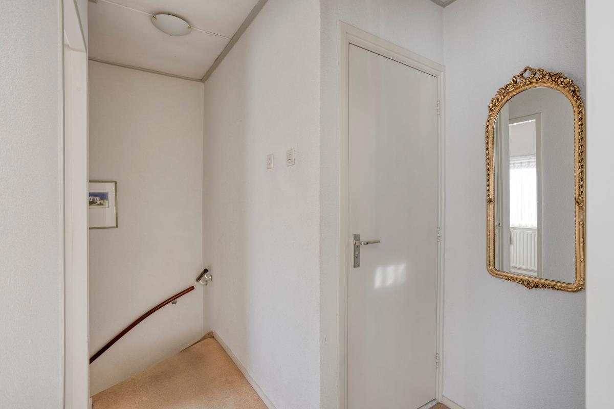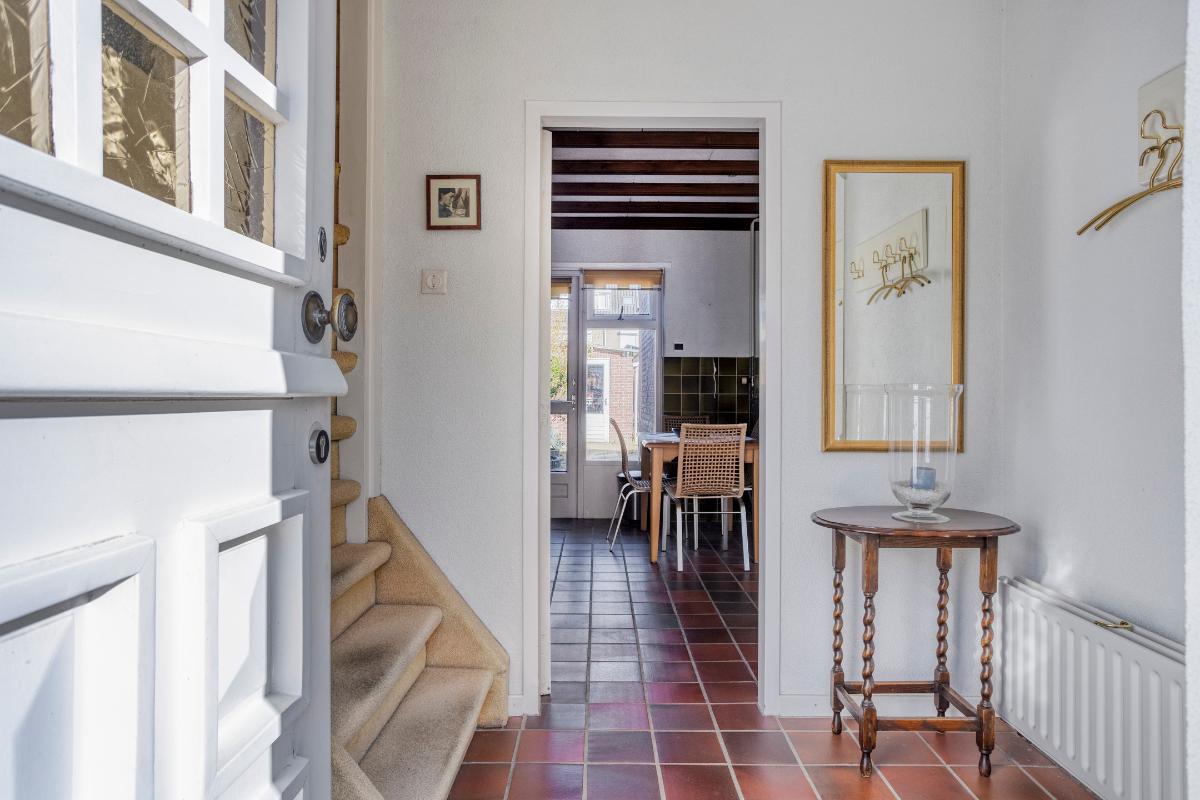 In deze hal, met ‘boeren’ tegelvloer (welke is doorgelegd in de keuken en woonkamer) met watermeterput met een droogloopmat en met spachtelputz afgewerkte wanden en een gestuct plafond, bevindt zich de meterkast (met 4 groepen en een aardlekschakelaar en de ‘slimme’ elektra- en gasmeter), het toilet en de beklede trapopgang naar de verdieping.