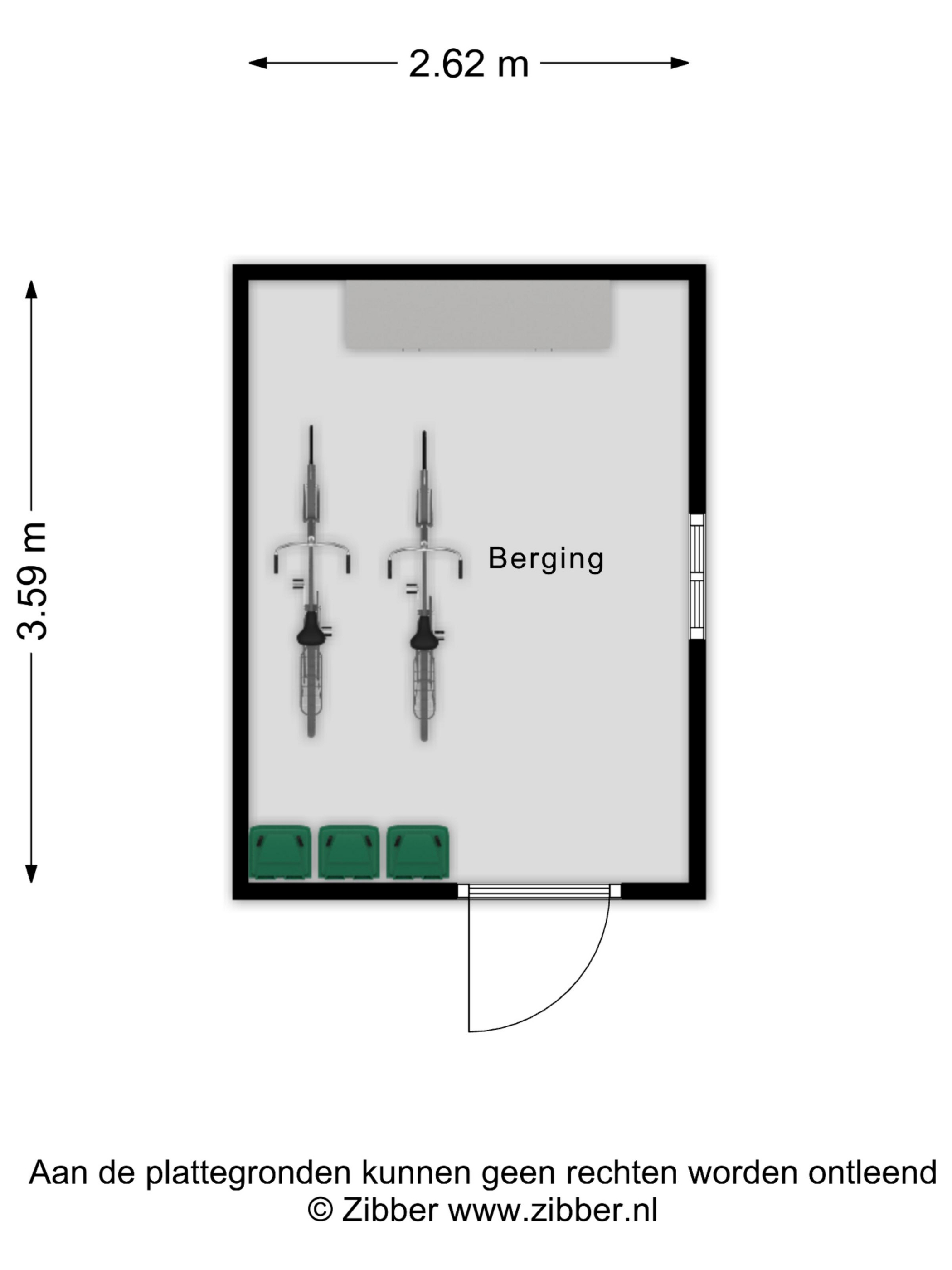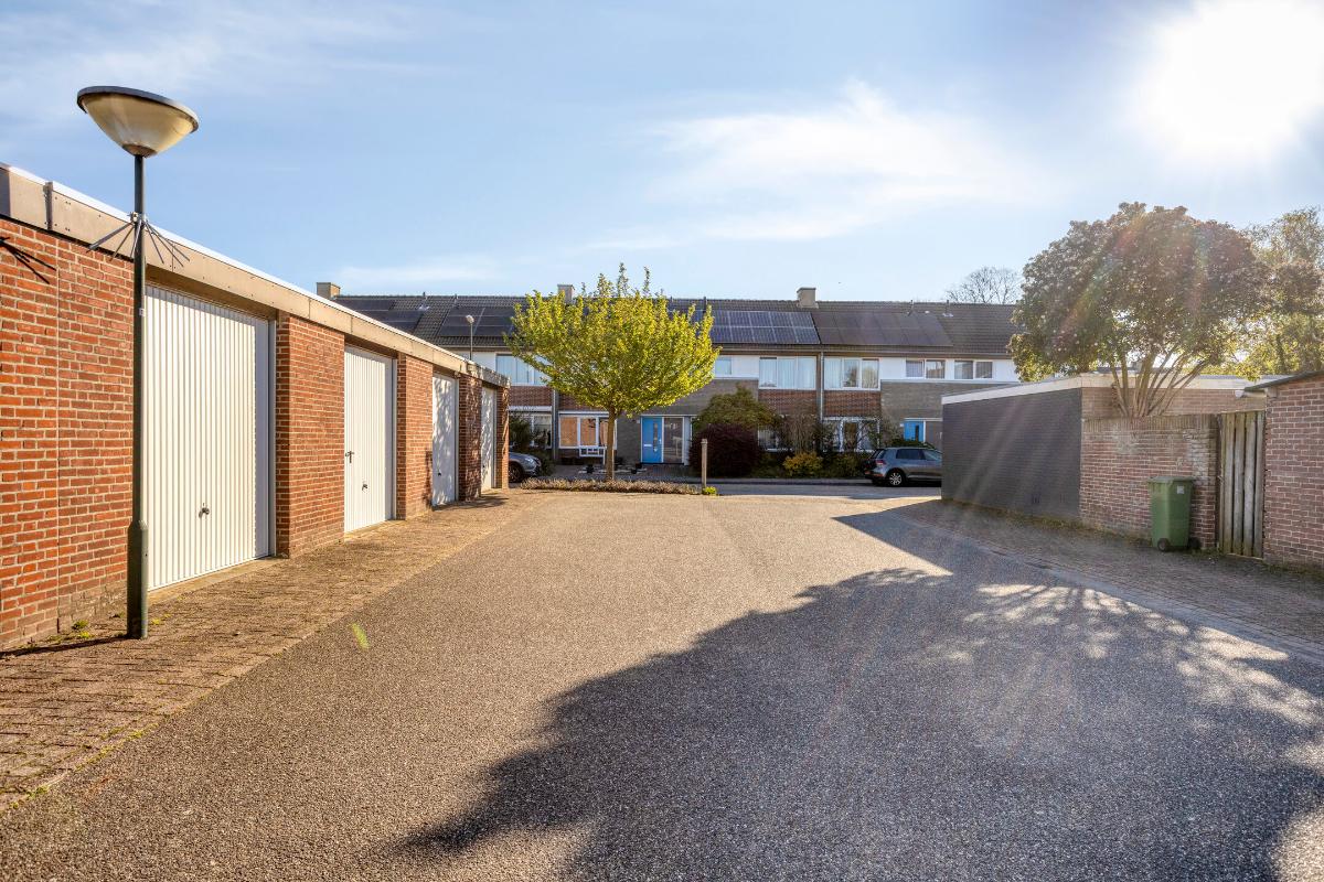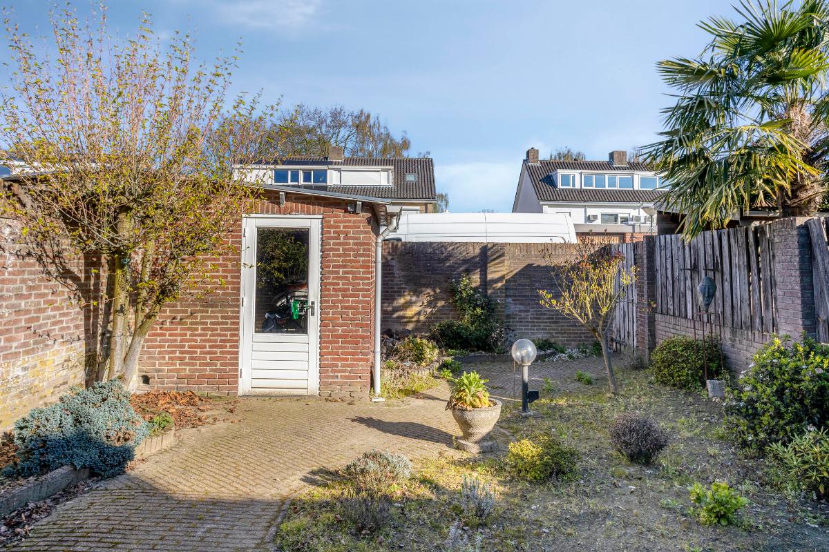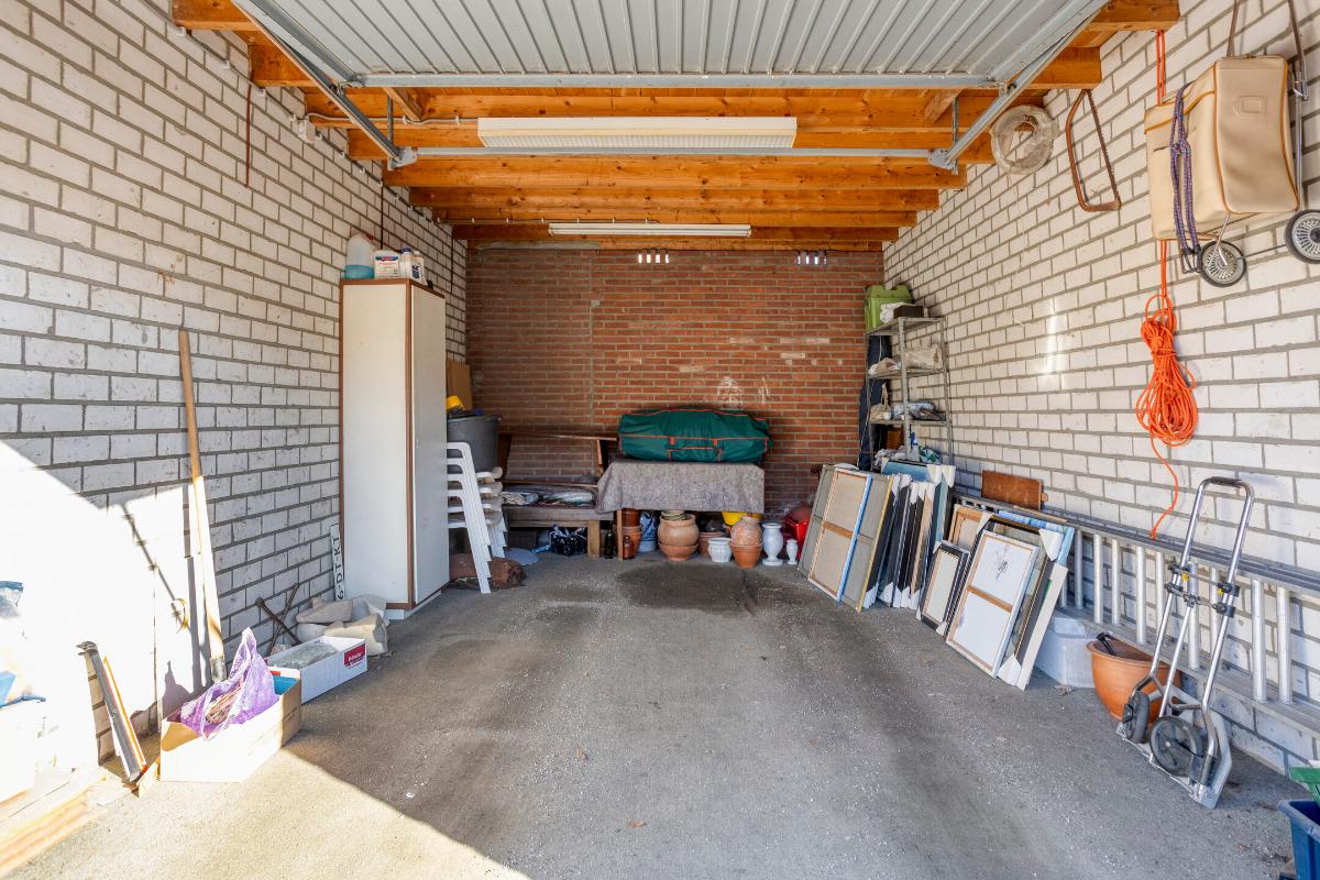 Achter in de tuin bevindt zich een ruime, halfsteens berging (van ± 2.62 x 3.59 m.), met een iets aflopend houten dak, een tegelvloer, een houten loopdeur en dubbel raamkozijntje in de zijgevel. Deze berging is daarnaast voorzien van elektra en T.L.-verlichting, een losse kast en legplanken.