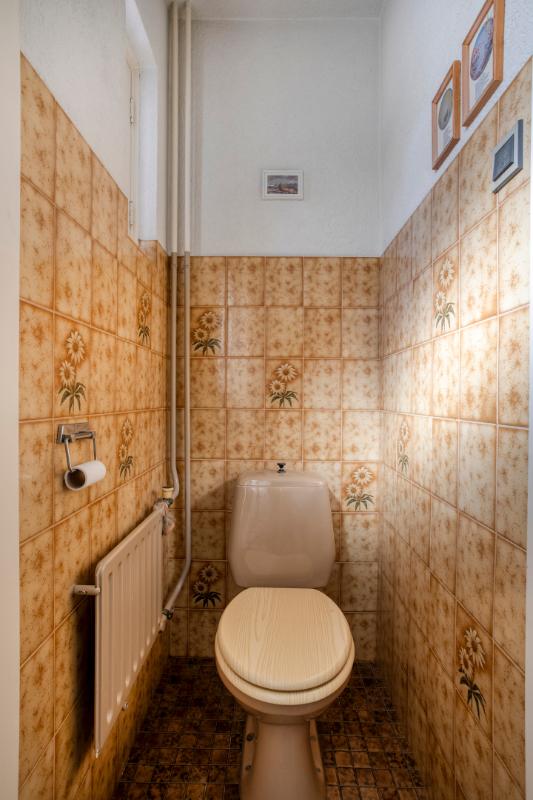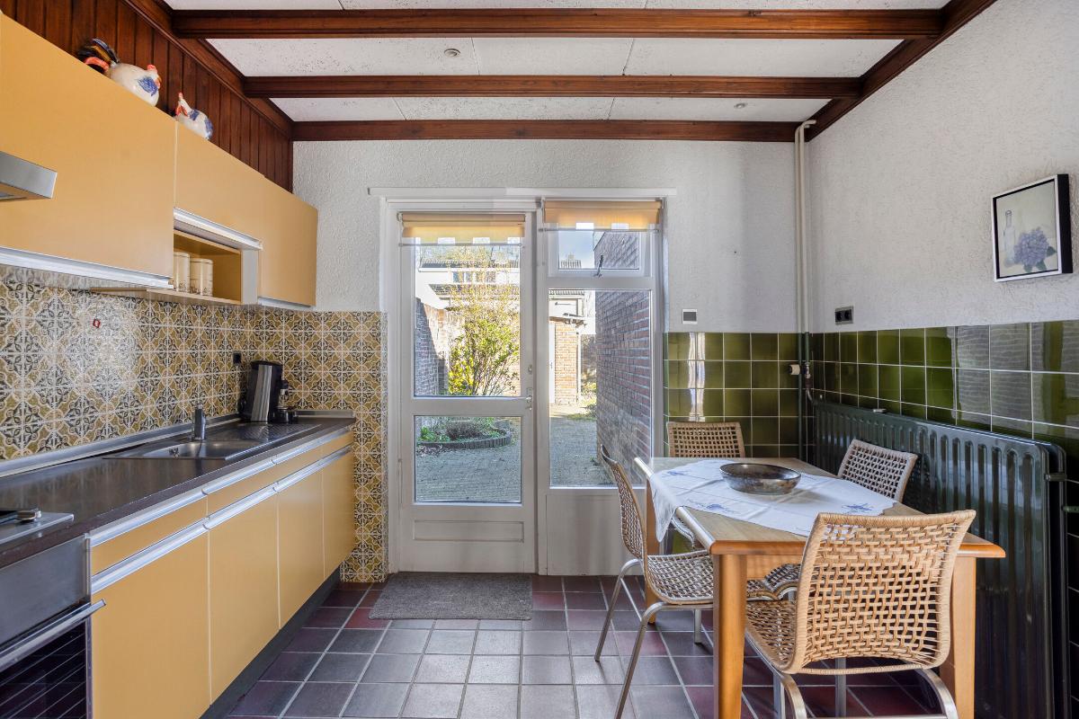 De gedeeltelijk betegelde toiletruimte, met een draairaampje in de voorgevel, is voorzien van een duoblokcloset en verwarming. Vanuit de hal betreed je de woonkeuken (van ± 10 m²), welke is voorzien van de voornoemde tegelvloer, rondom gedeeltelijk betegelde wanden en een verlaagd houten balkenplafond met HWC-platen met halogeen inbouwspots, alsmede de deur naar de achtertuin.