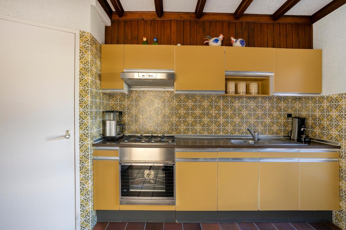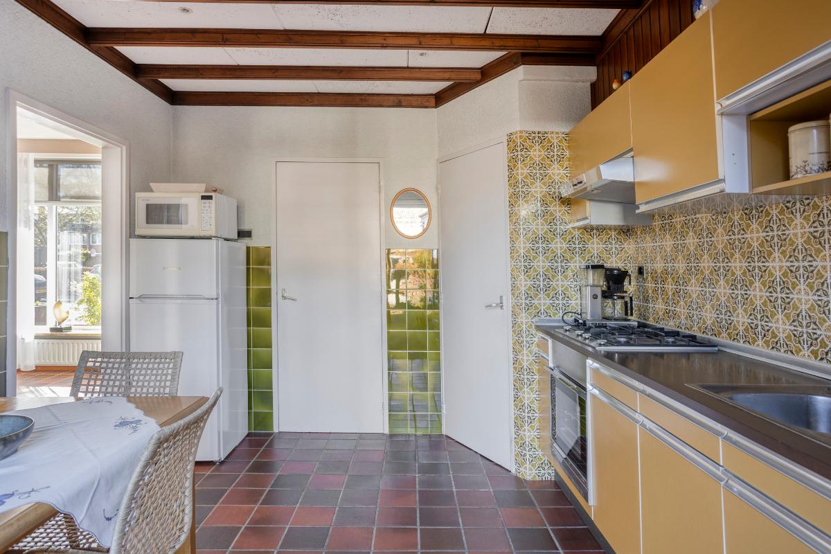In deze keuken bevindt zich een eenvoudige, rechte keukeninstallatie met onder- en bovenkasten en laden, een houten aanrechtblad met een RVS spoelbak met afdruipplateau en een éénhendelmengkraan, een 4-pits RVS gaskookplaat, een RVS afzuigkap en een oven. In deze keuken bevindt zich tevens een praktische, verdiepte trap-/kelderkast welke volledig is betegeld en voorzien van legplanken en een lichtpunt.