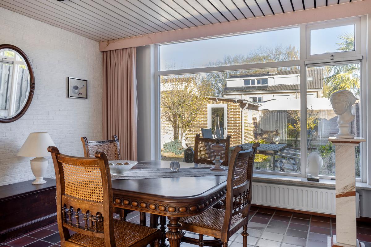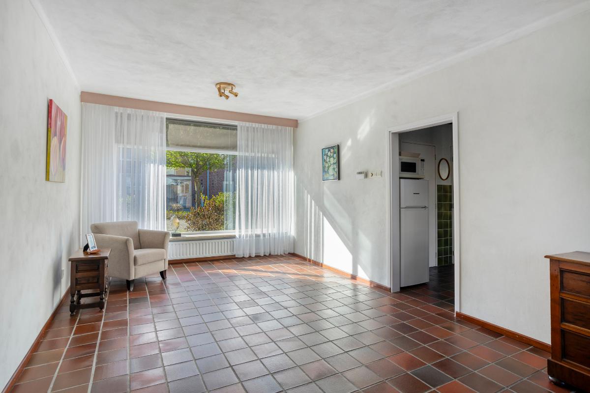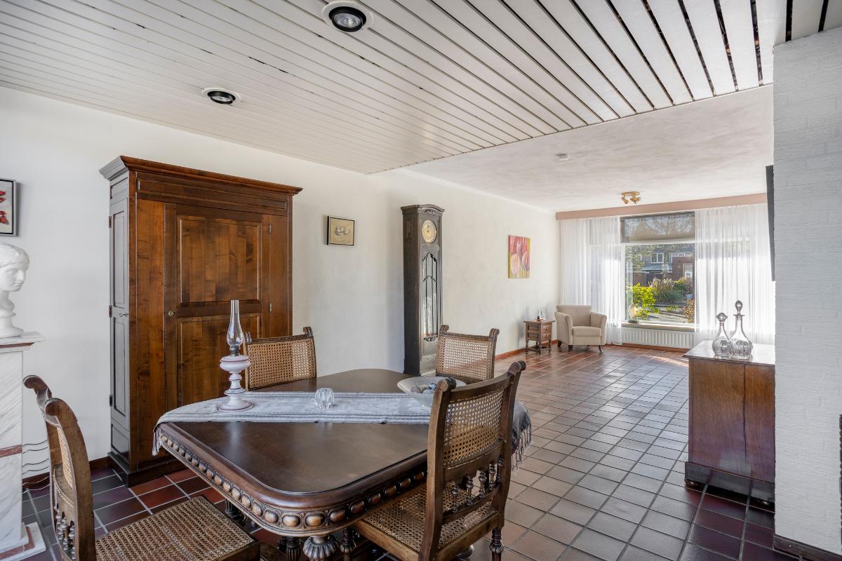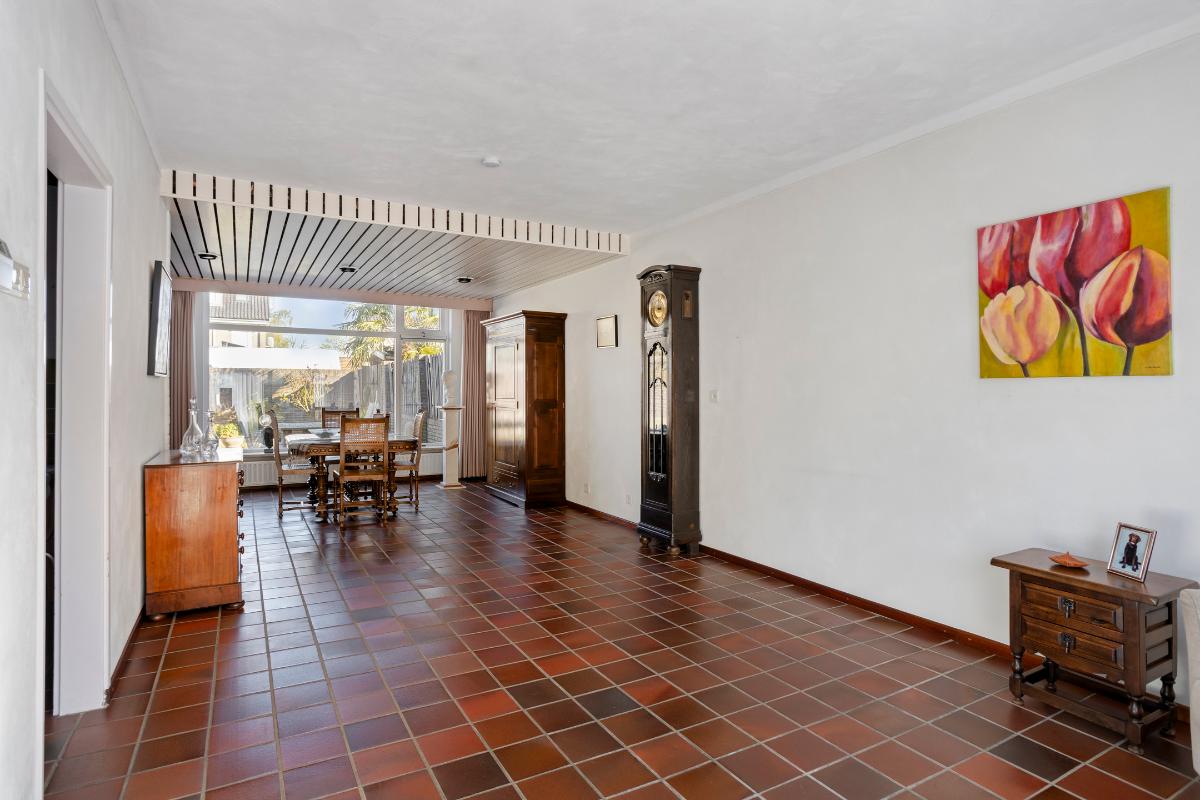 Vanuit de keuken heeft u vervolgens toegang tot de aan de achterzijde uitgebouwde doorzon-woonkamer (van ± 34 m²), met grote raampartijen met travertin vensterbanken aan zowel de voor- als achterzijde, welke zorgen voor veel daglichttoetreding. Deze kamer is voorzien van de voornoemde tegelvloer, grotendeels gestucte wanden en een grotendeels gestuct plafond en in de voorkamer bevindt zich de glasvezelaansluiting. De uitbouw is deels afgewerkt met licht getexte steenstrips en een verlaagd houten plafond met inbouwverlichting op een dimmer.