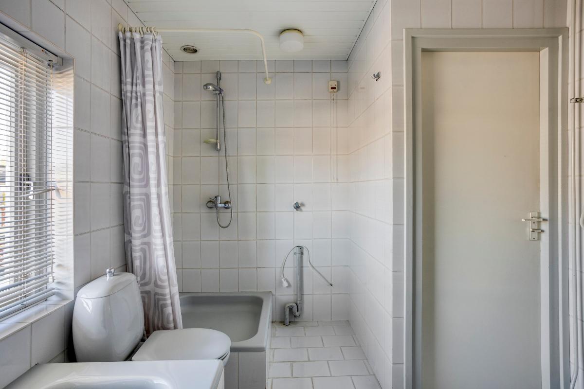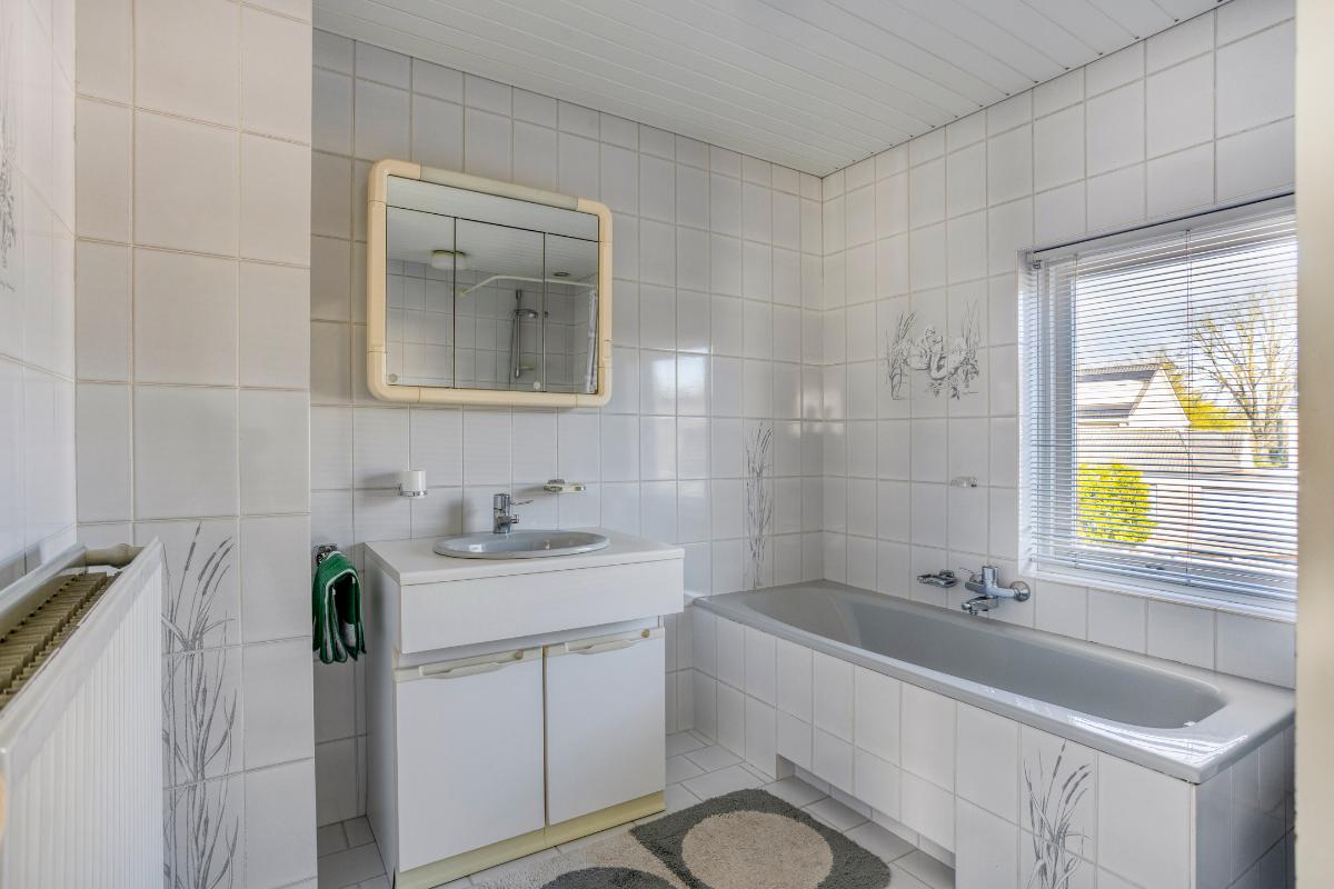 De ruime badkamer is ooit ontstaan door de samenvoeging van de voormalige douchecel en 4e slaapkamer. Deze badkamer is volledig betegeld en voorzien van een kunststof schroten plafondafwerking en een draairaam in de achtergevel t.b.v. de daglichttoetreding en ventilatie. In deze badkamer bevindt zich een kunststof ligbad, een kunststof douchebak met een éénhendelmengkraan en douchegordijn, een 2e duoblok-toilet, een wastafelmeubel met een éénhendelmengkraan en dubbel onderkastje met daarboven een spiegelkastje met verlichting en een stopcontact, alsmede de opstelplaats voor een wasmachine met veiligheidsschakelaar.
