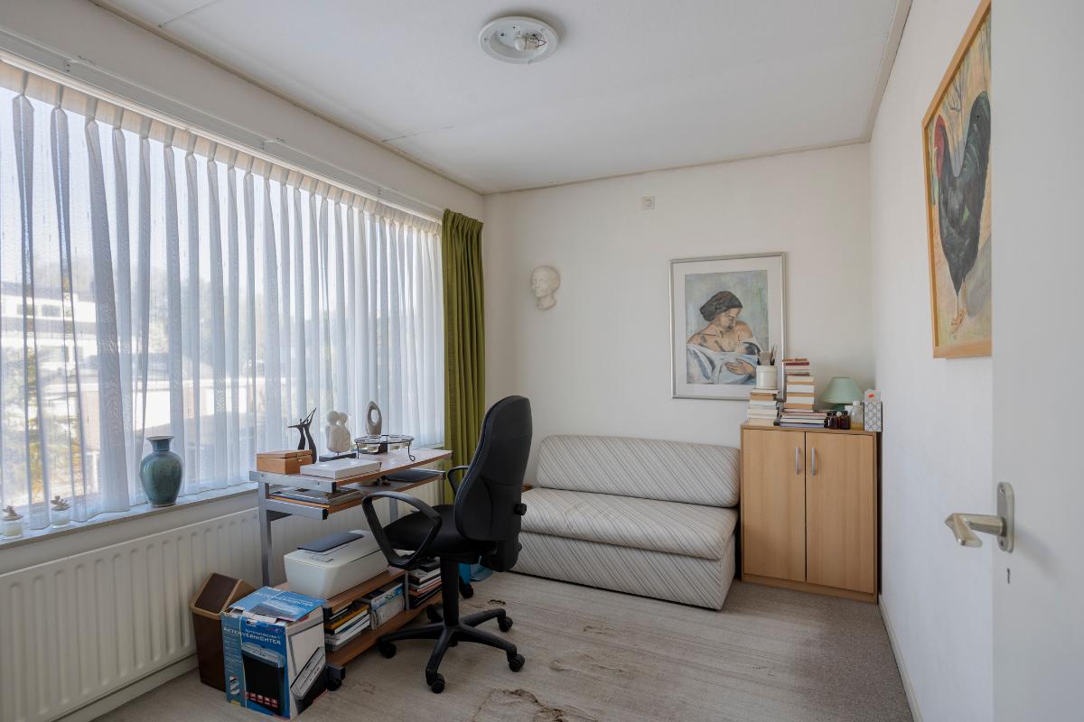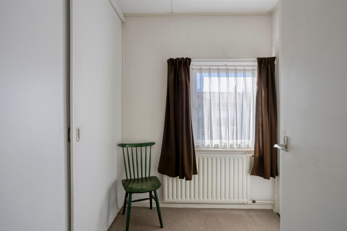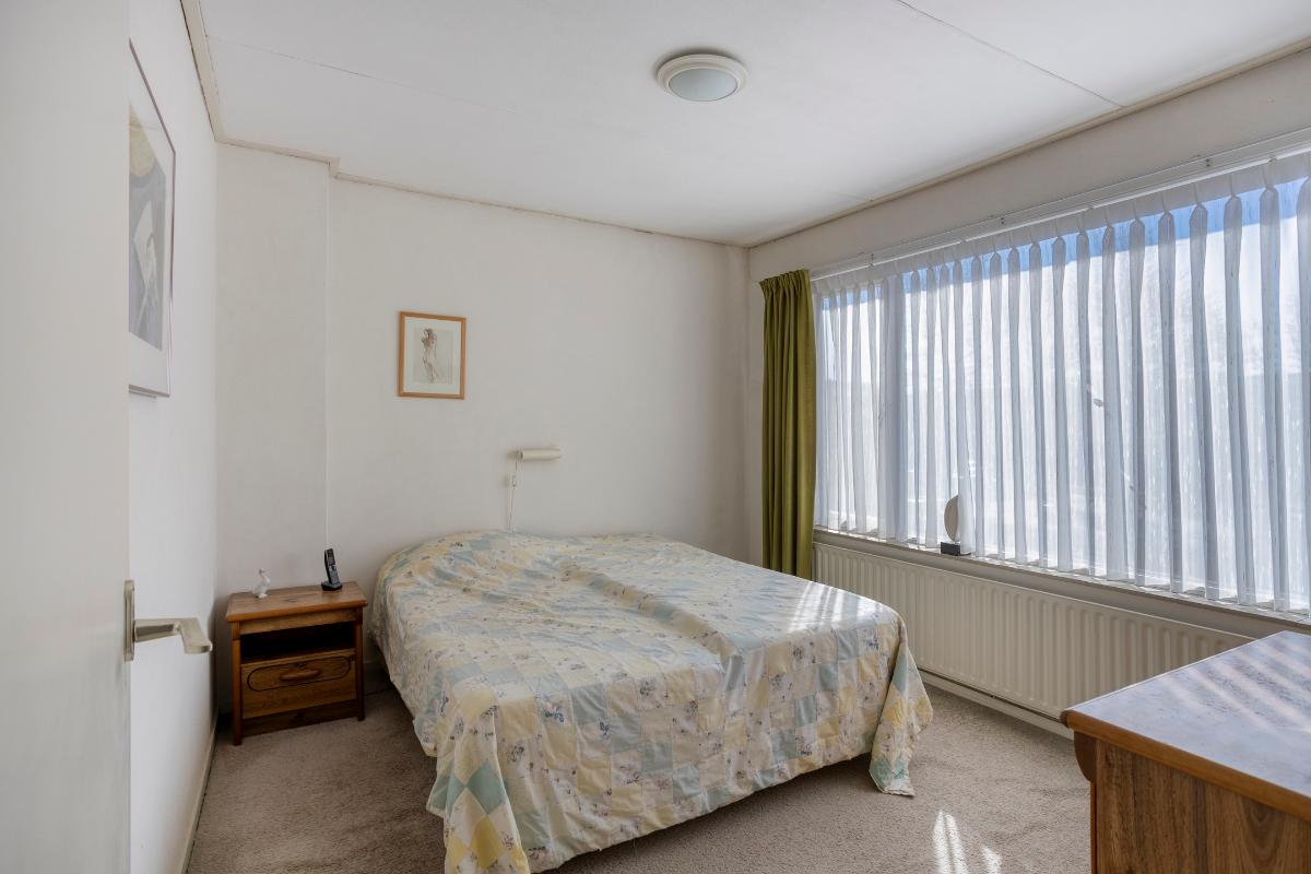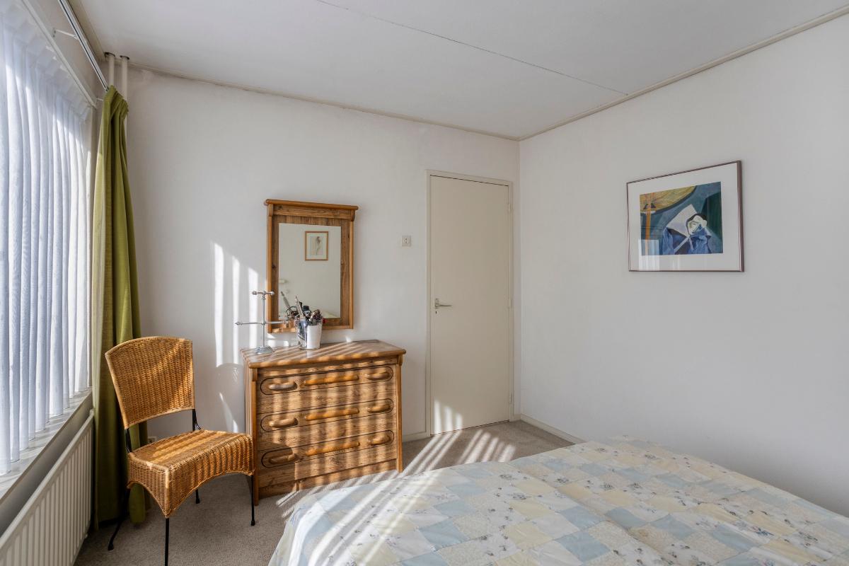 De 3 slaapkamers (van resp. ± 5, 9 en 10 m²) zijn allen voorzien van vloerbedekking, gestucte wanden en zachtboard plafonds. In de kleinste slaapkamer aan de voorzijde bevindt zich een vaste kastenwand met 2 schuifdeuren en een inbouwkast boven de trapopgang.