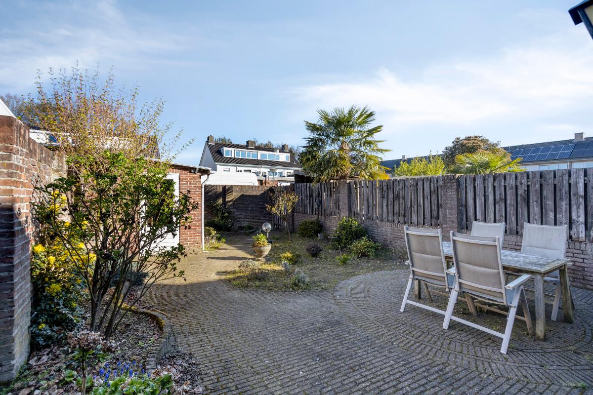ACHTERTUIN & BERGING: De achtertuin, van ± 11.35 m. diep, is gesitueerd op het noorden/noordwesten en is volledig omsloten d.m.v. grotendeels gemetselde schuttingen met een afsluitbare poort naar en vanaf het achtergelegen binnenterrein, met openbare parkeergelegenheid. Deze tuin is grotendeels verhard middels sier-/klinkerbestrating en voorzien van enkele plantenborders, een buitenlamp en een lichtpunt tegen de achtergevel van de woning.