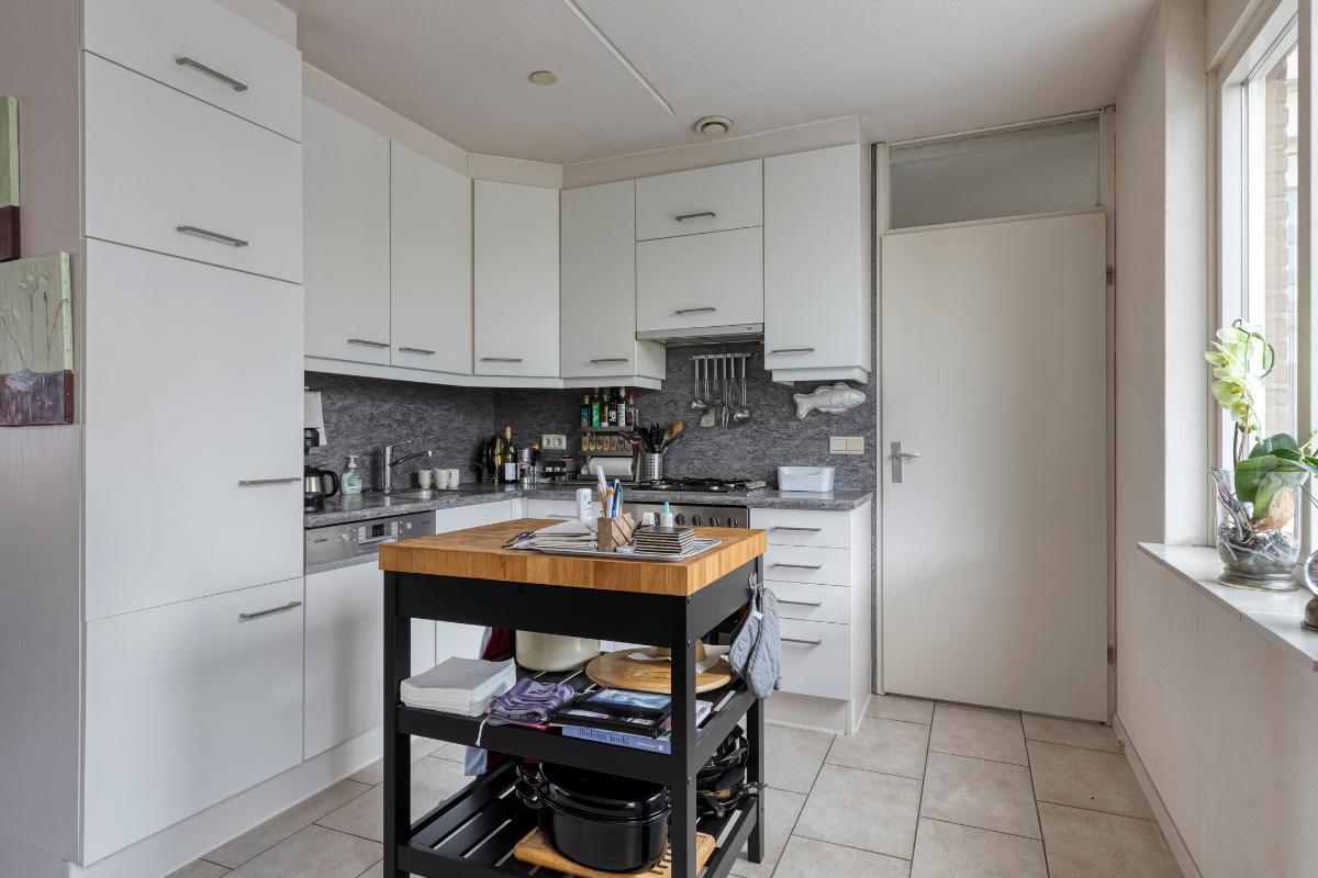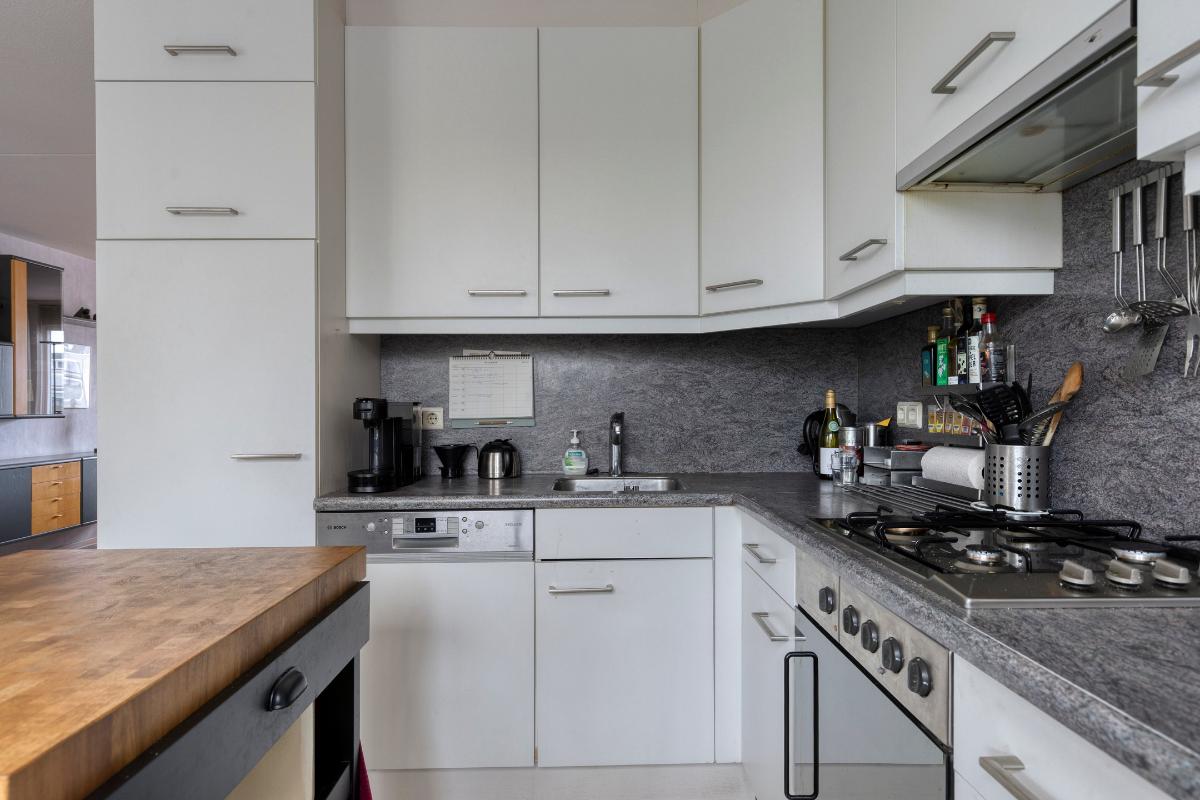 KEUKEN: Open keuken (1993) met hoekopstelling voorzien van diverse hoge kastjes en lades, gaskookplaat, inbouwafzuigkap, koel-/ vriescombinatie, kast en oven. Eveneens te bereiken vanuit de hal.
