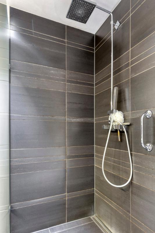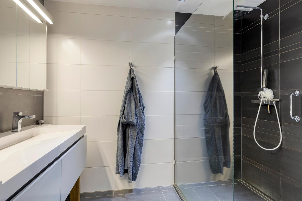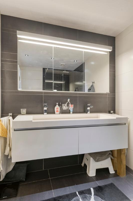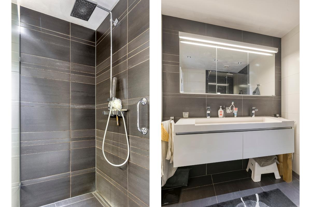 BADKAMER: Fraaie badkamer (ca. 2010) met luxe wand en vloertegels en geen dorpels (dus rolstoelvriendelijk) is voorzien van een grote inloopdouche en dubbele wastafelmeubel met veel bergruimte.