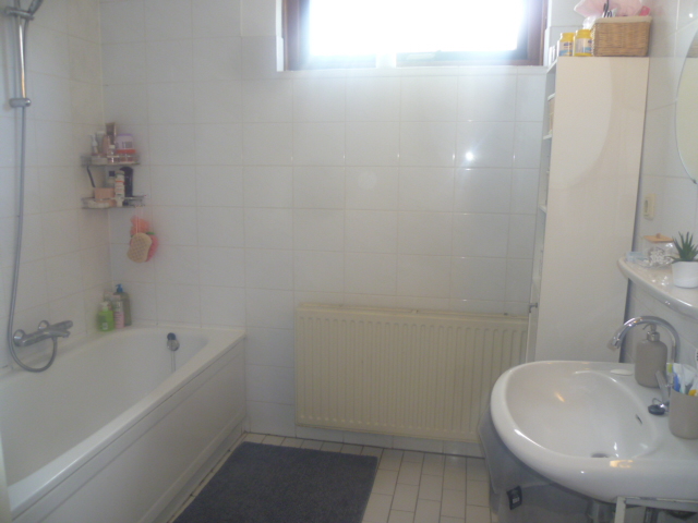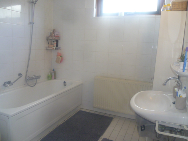De grotendeels betegelde badkamer met daglicht is voorzien van een ligbad met een handdouche en thermostaatkraan, een vaste wastafel, een 2e toilet en mechanische ventilatie.