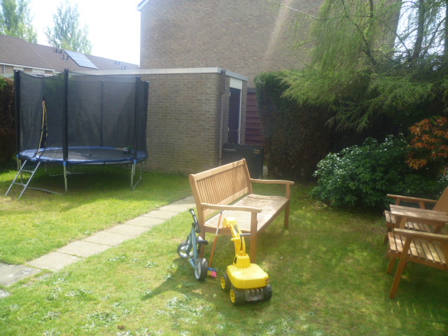 From the living room, a double door provides access to the attached, practical dining/play/study room (approx. 14 m²), situated against the side wall of the house, with a door to the back garden.