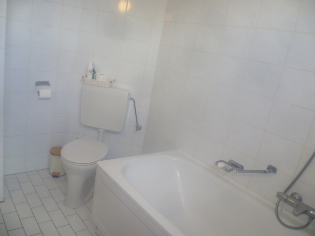 The largely tiled bathroom with natural light is equipped with a bathtub with a hand shower and thermostatic tap, a fixed washbasin, a second toilet, and mechanical ventilation.
