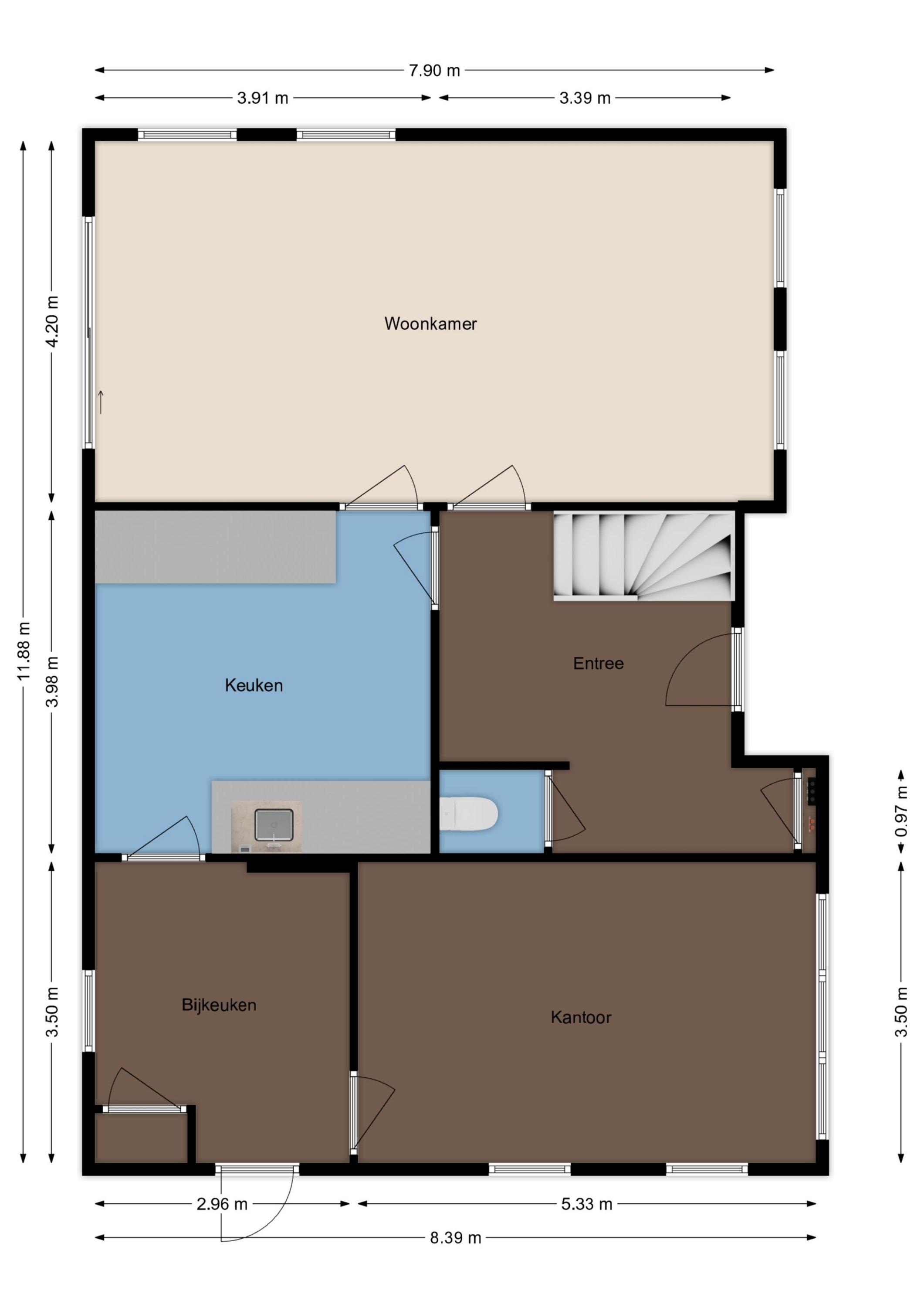 Entree en hal, toilet, ruime woonkamer, dichte keuken met luxe inbouwkeuken (2019) voorzien van moderne apparatuur, bijkeuken, kantoor / werkkamer.