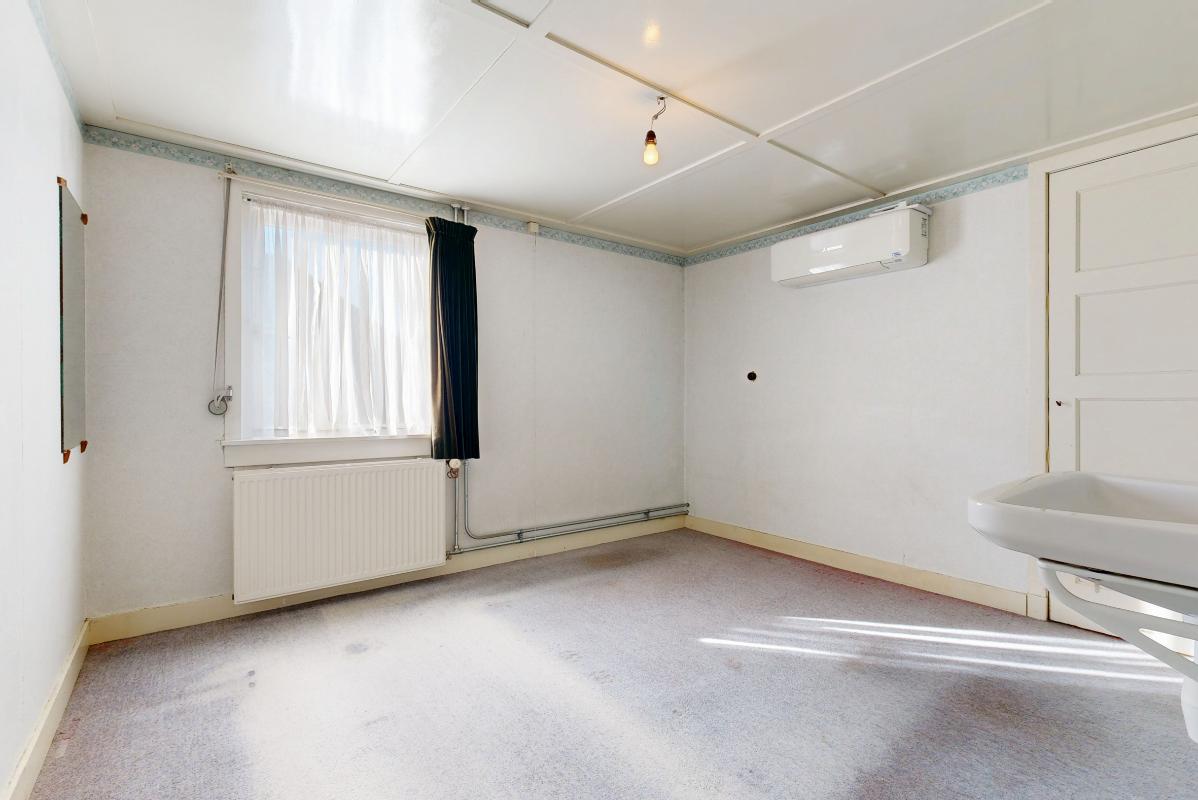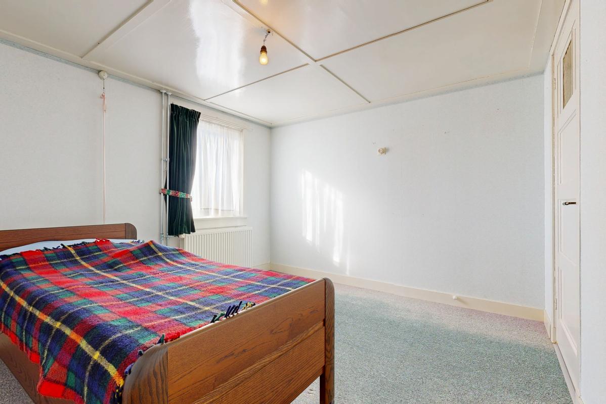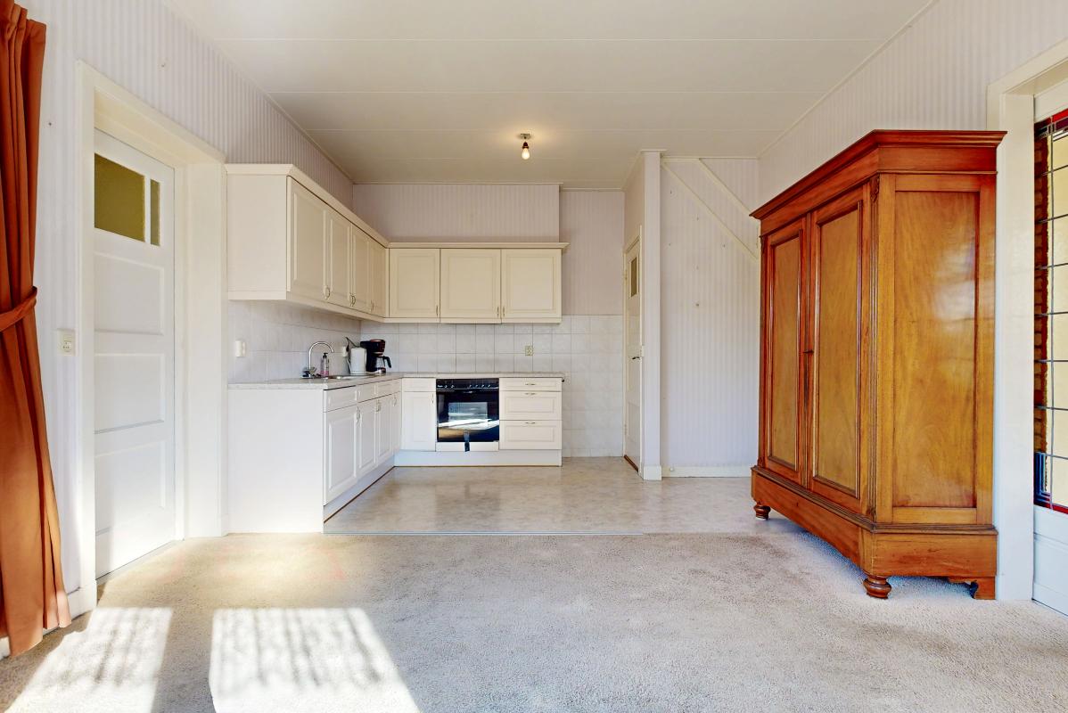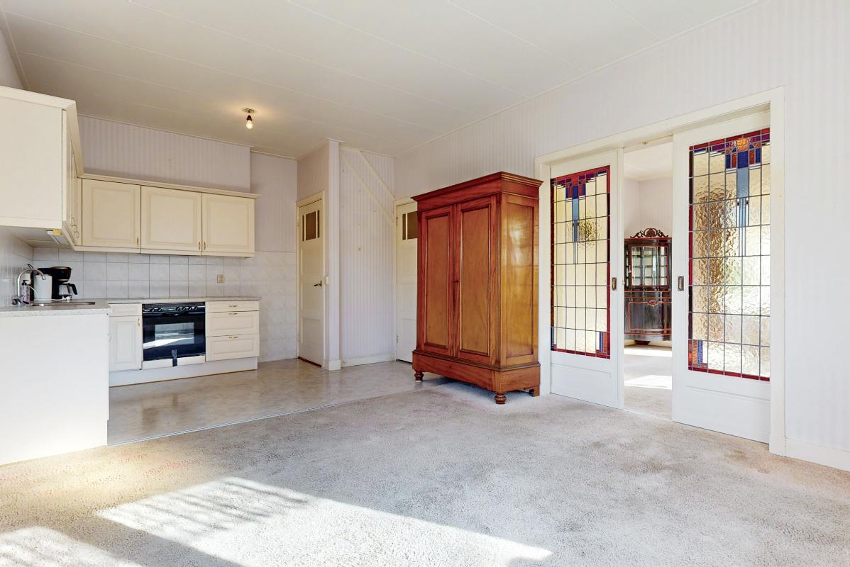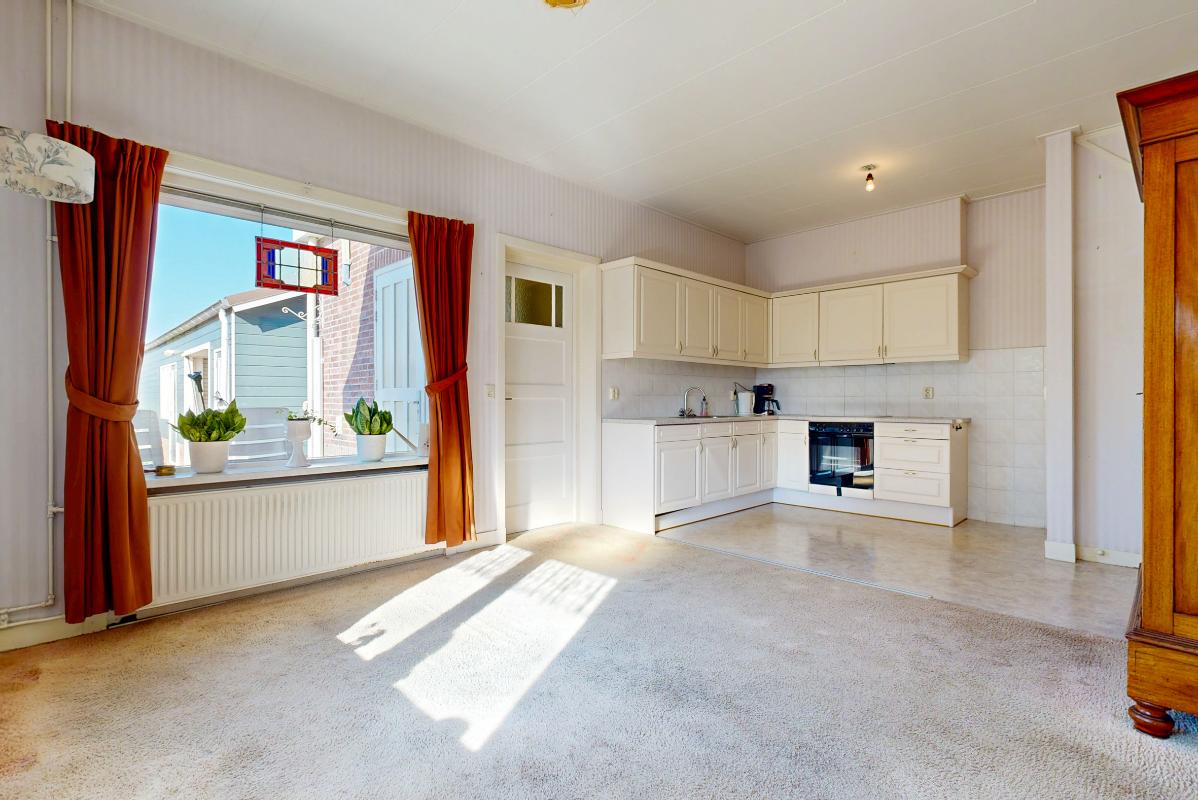 De woonkamer vormt het hart van de woning en profiteert van veel natuurlijk licht door de erker en de grote raampartijen. De open keuken sluit hier prettig op aan en is voorzien van een praktische trapkast voor extra bergruimte. Aan de achterzijde van de woning bevindt zich een bijkeuken met een doucheaansluiting, een toiletruimte en een vaste kast.