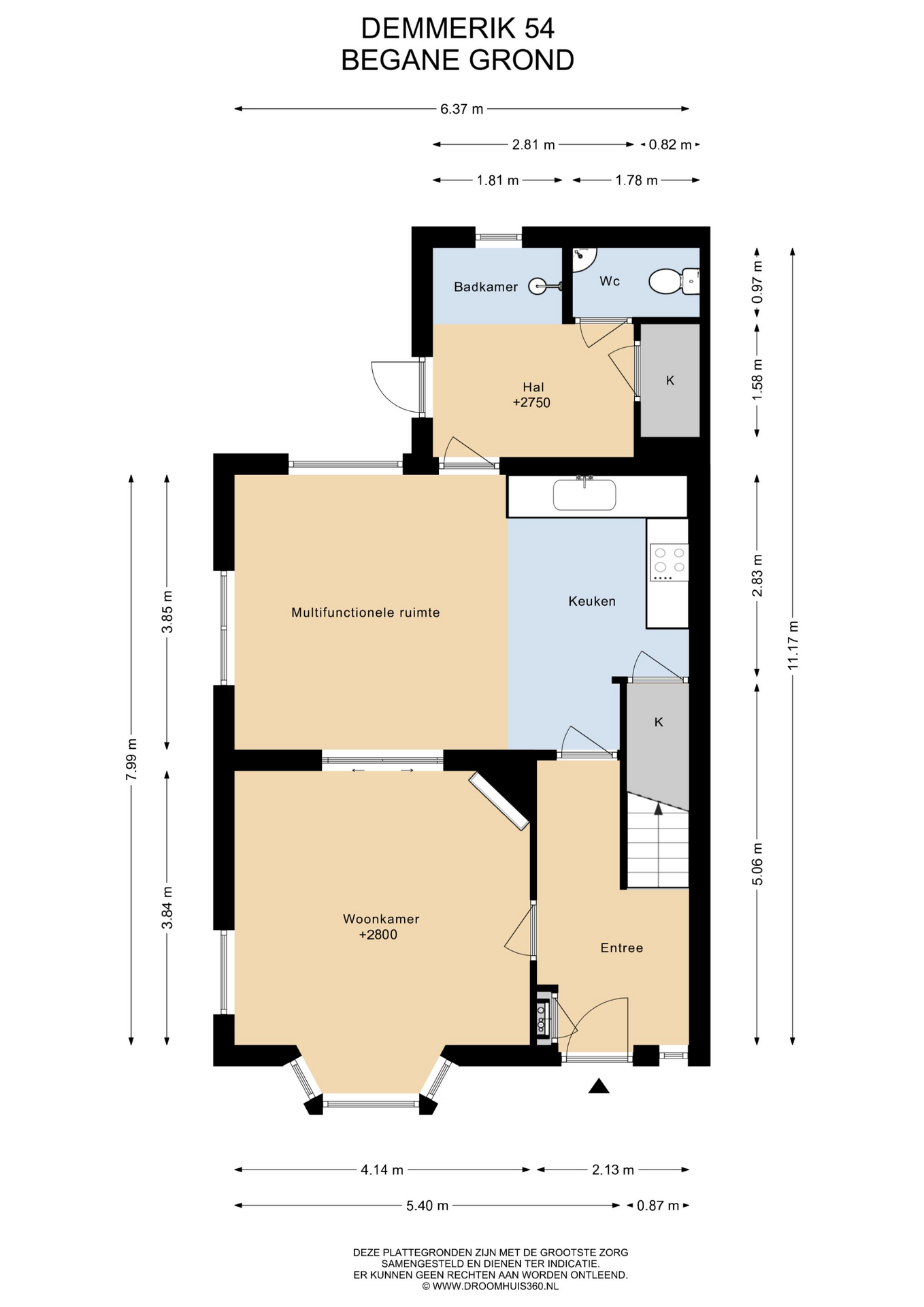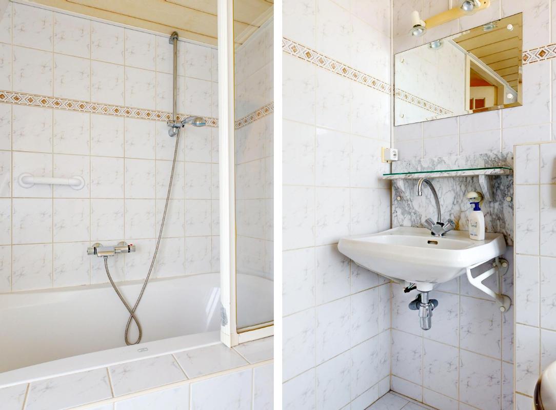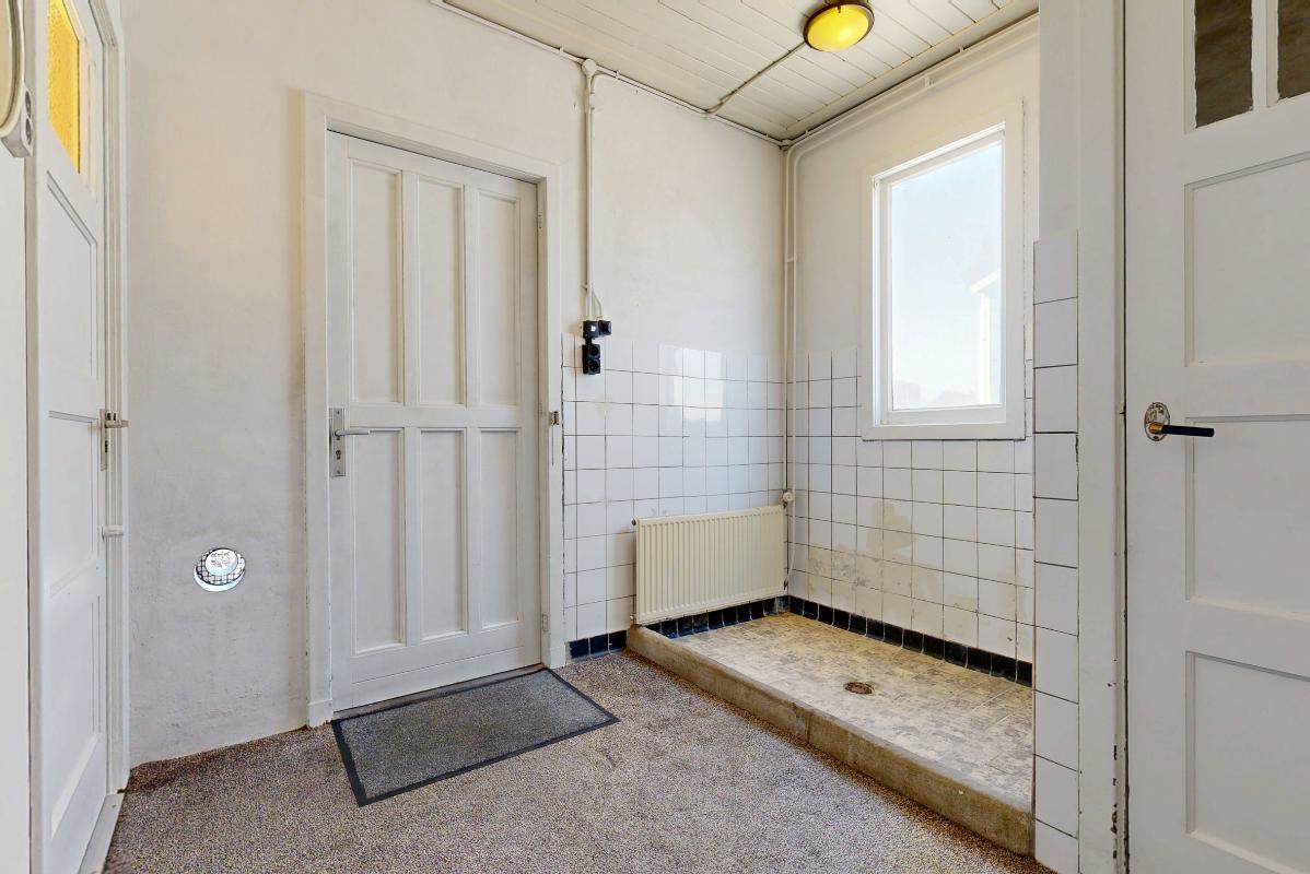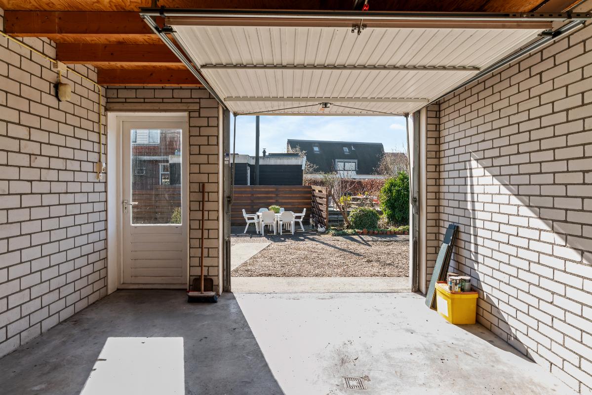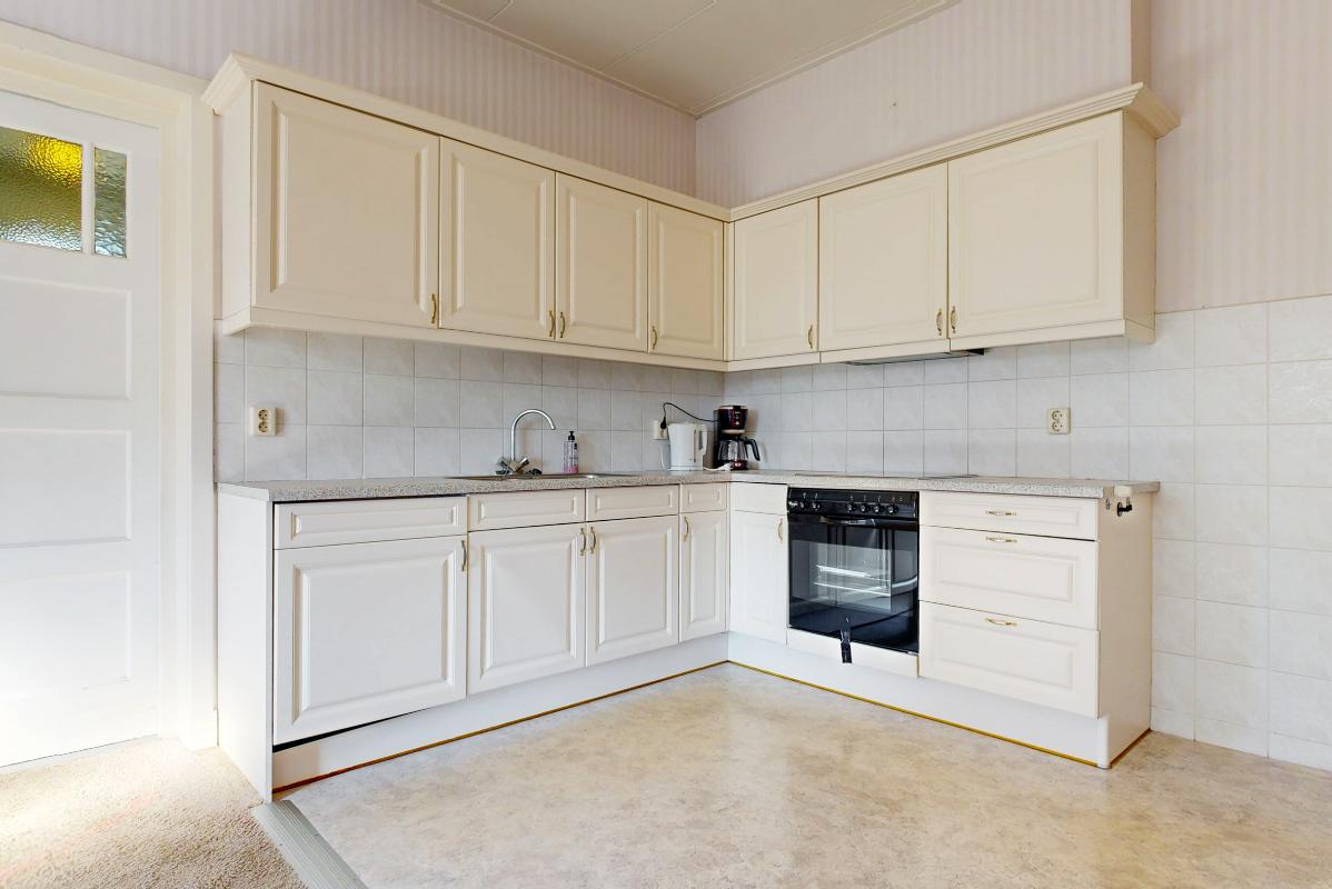 De woonkamer vormt het hart van de woning en profiteert van veel natuurlijk licht door de erker en de grote raampartijen. De open keuken sluit hier prettig op aan en is voorzien van een praktische trapkast voor extra bergruimte. Aan de achterzijde van de woning bevindt zich een bijkeuken met een doucheaansluiting, een toiletruimte en een vaste kast.