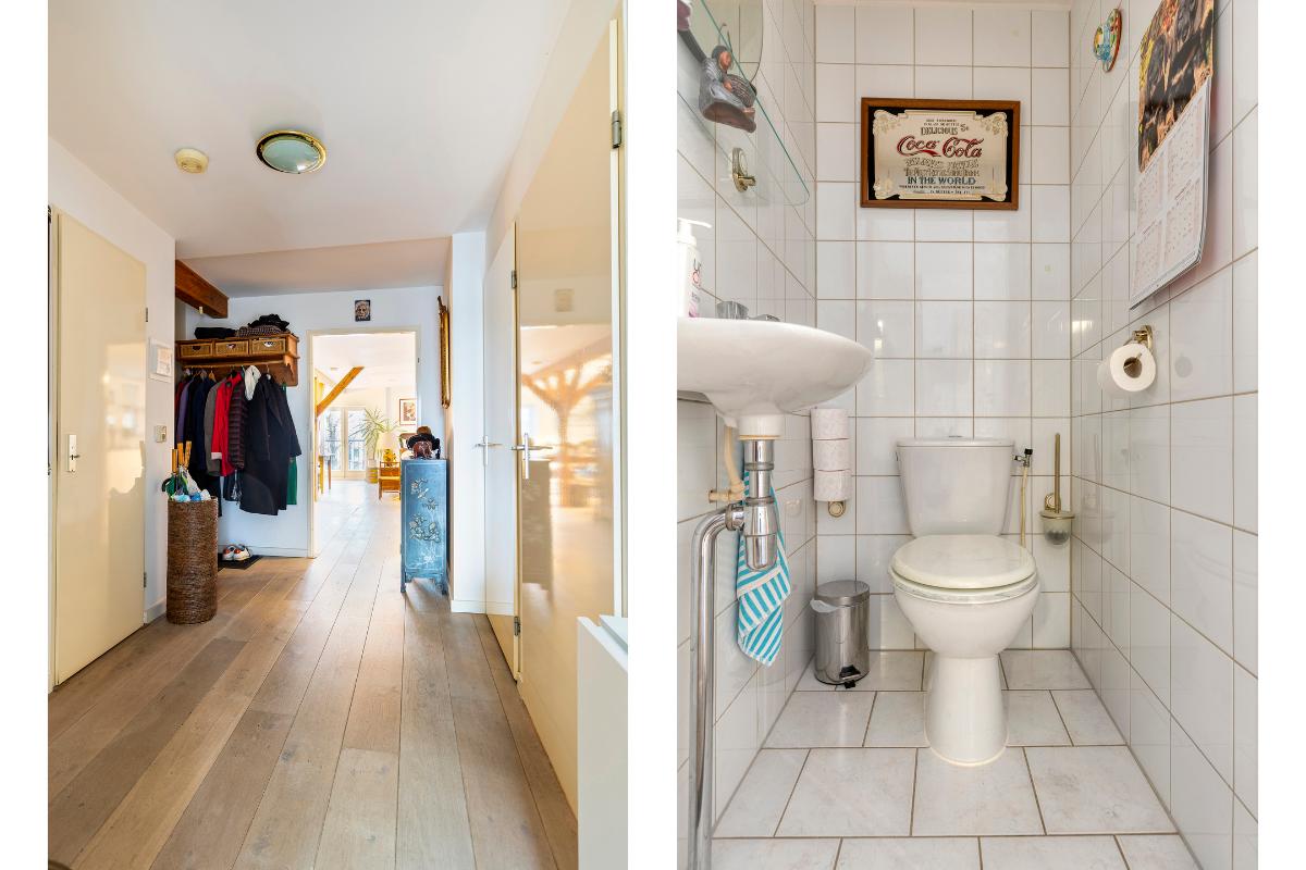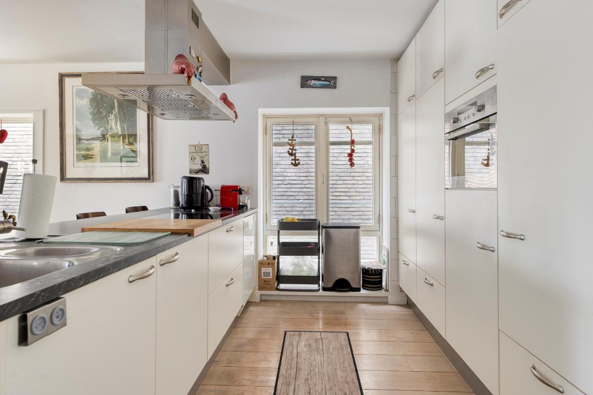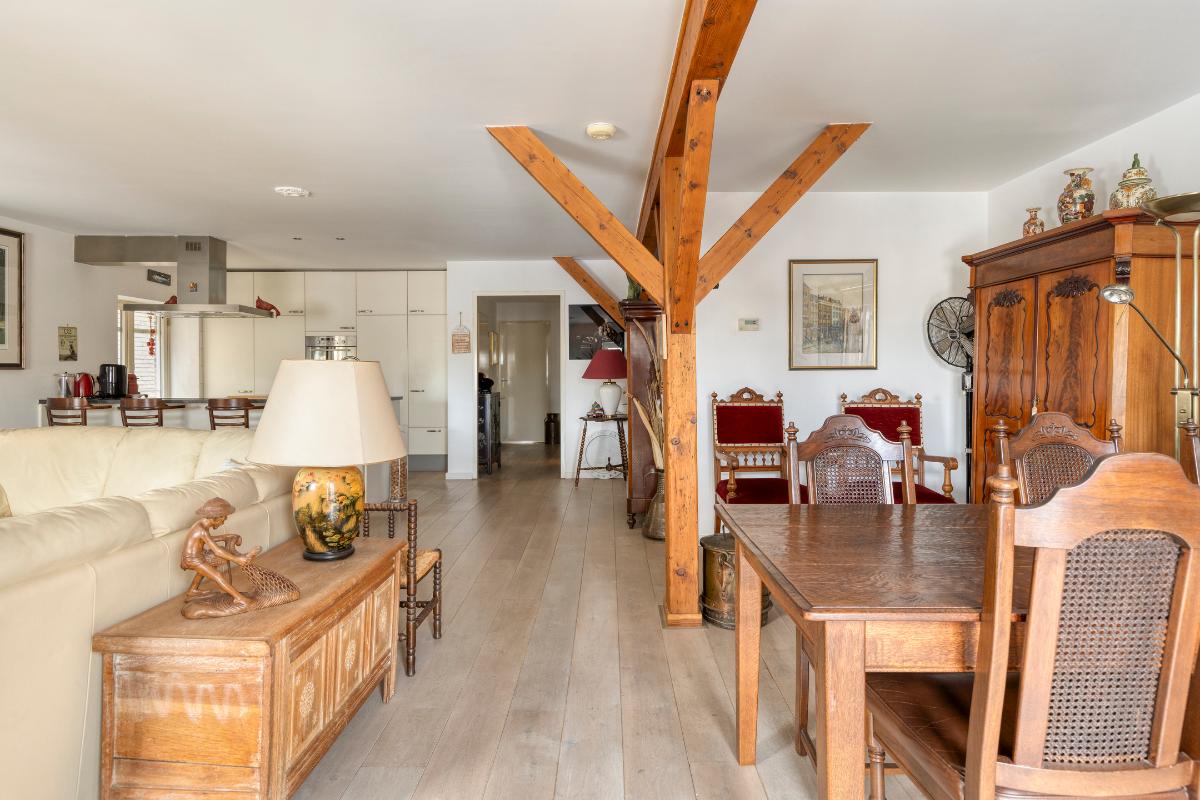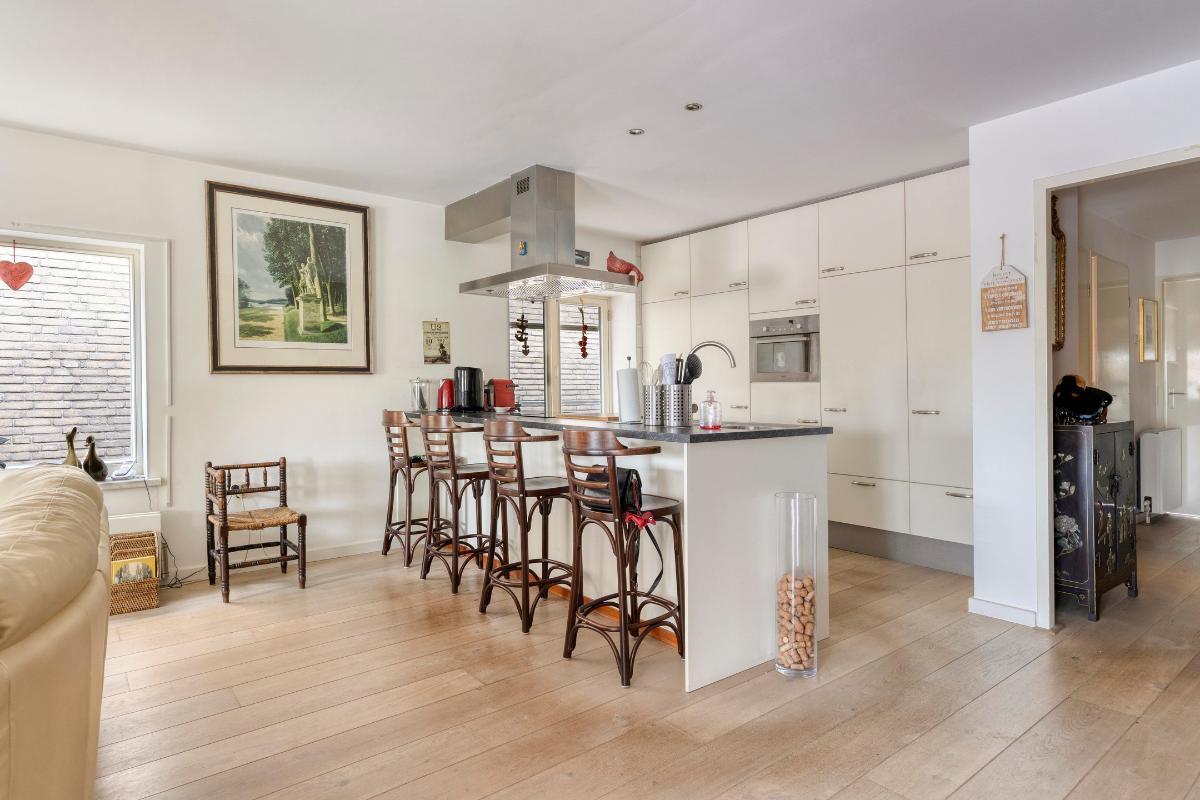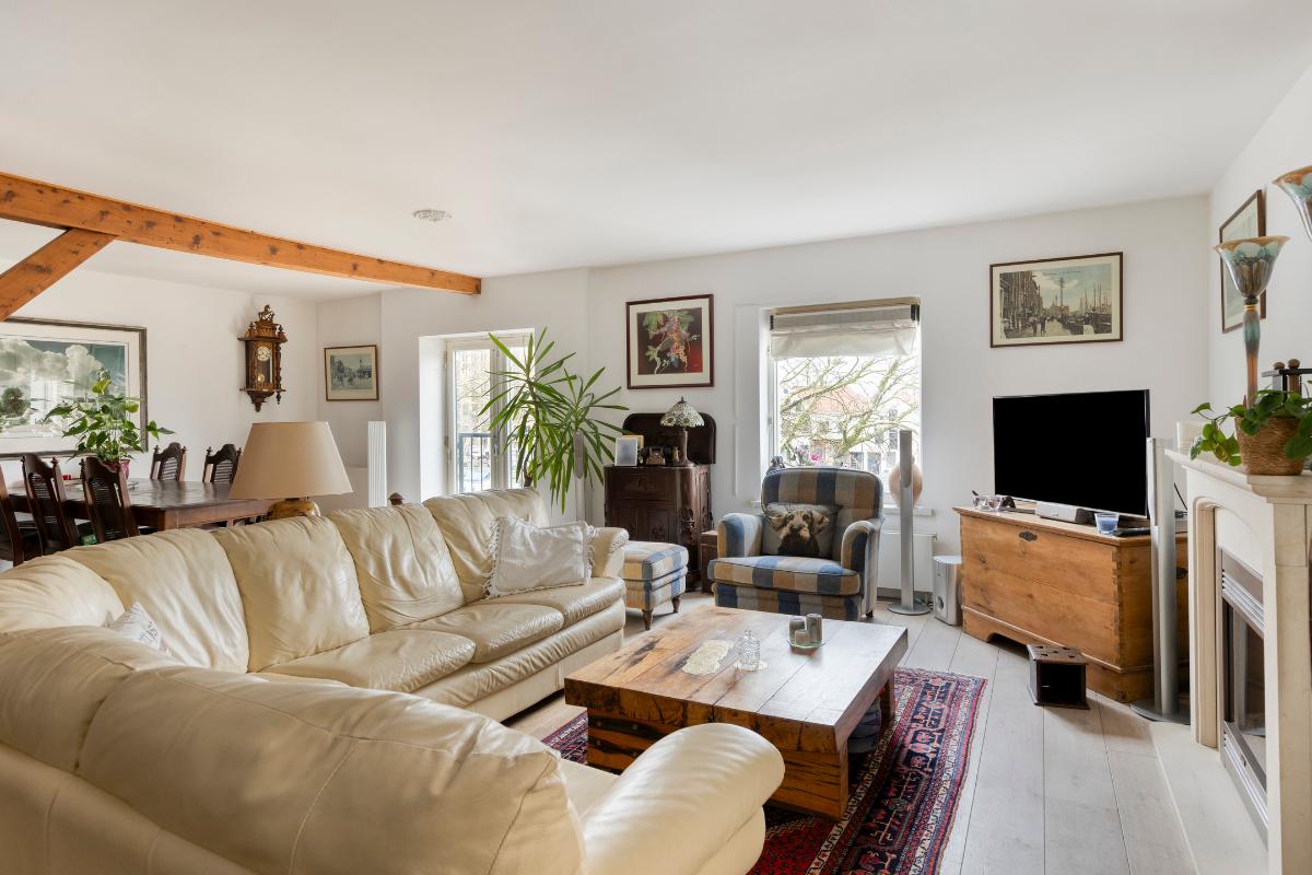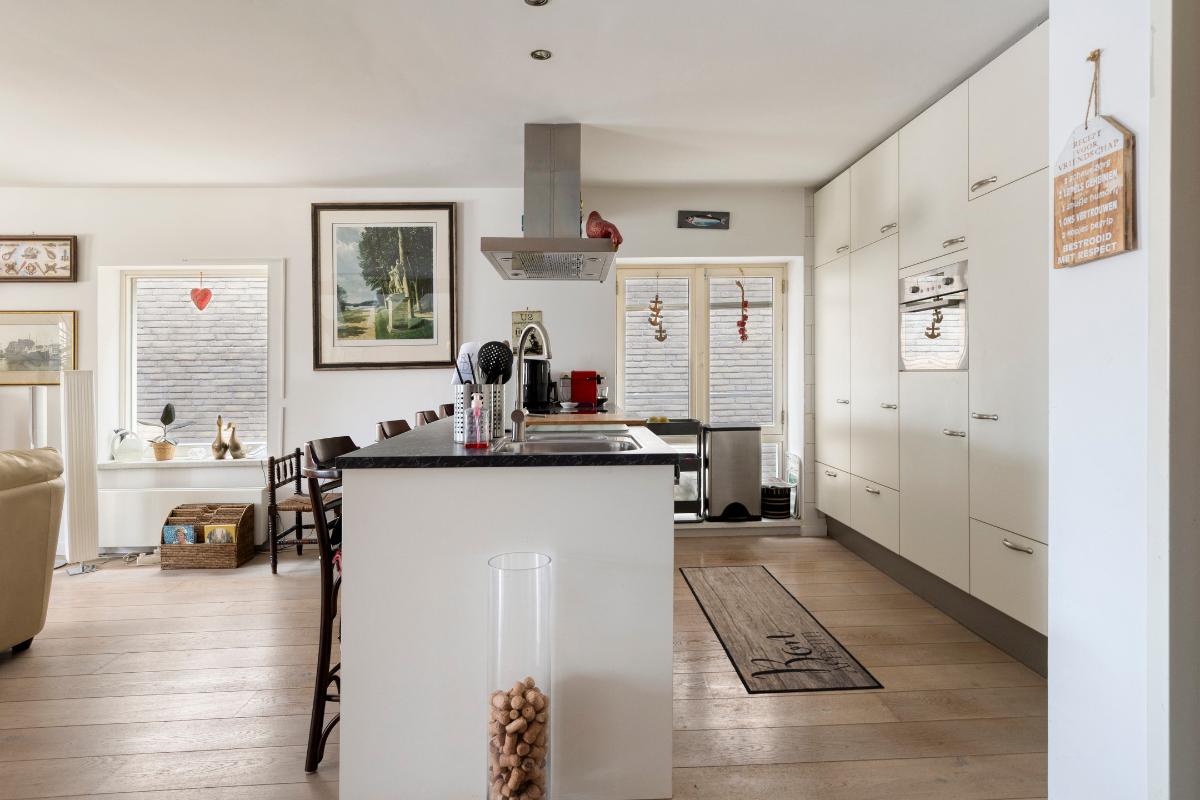 Tweede verdieping: Aan de lift ligt gelijk de toegangsdeur tot de ruime hal met toiletruimte en meterkast. De riante woonkamer van ca. 55 m² voorzien van authentieke spanten, houten vloerdelen en stolpdeuren naar het Franse balkon met het fraaie uitzicht over de binnenhaven. Luxe open keuken voorzien van kook- en spoeleiland, kastenwand en inbouwapparatuur zoals koelkast, vriezer, afzuigkap, inductiekookplaat en vaatwasmachine. Aan de achterzijde van de woning bevinden zich twee slaapkamers van respectievelijk ca. 12 en 13 m² waarvan de eerste voorzien is van een schuifkastenwand/inloopkast en van stolpdeuren die toegang geven tot het balkon. De geheel betegelde badkamer is uitgerust met een douchecabine, een badkamermeubel met wastafel, een urinoir en de wasmachineaansluiting.