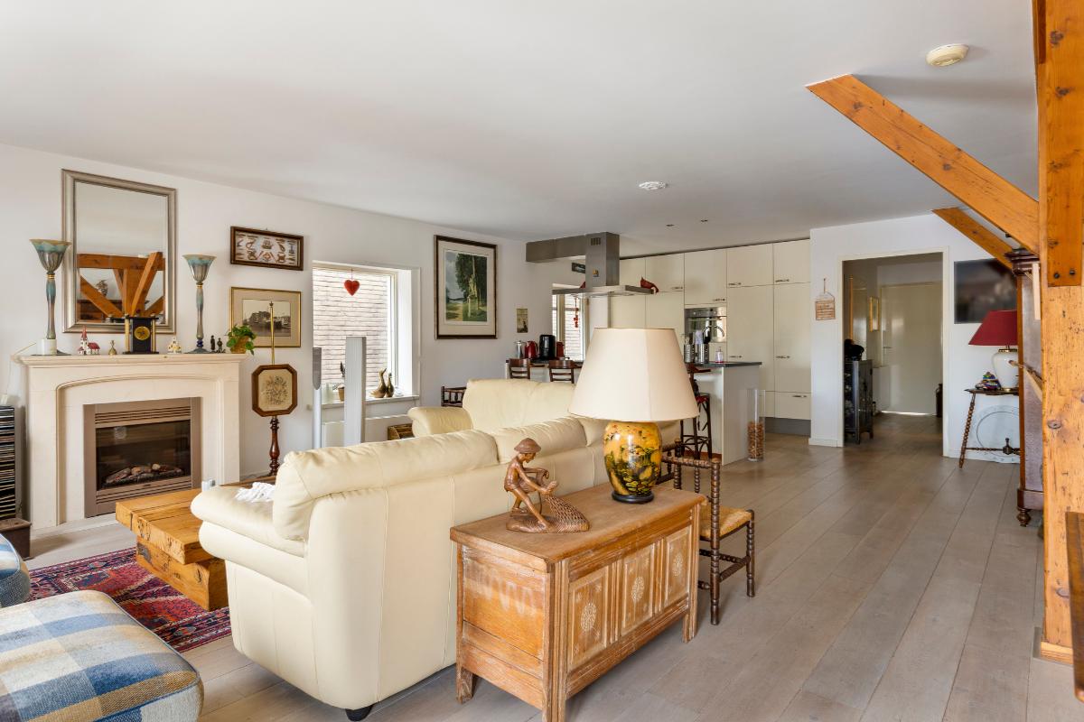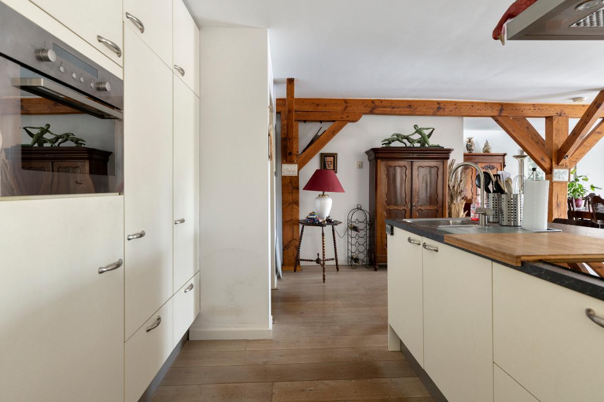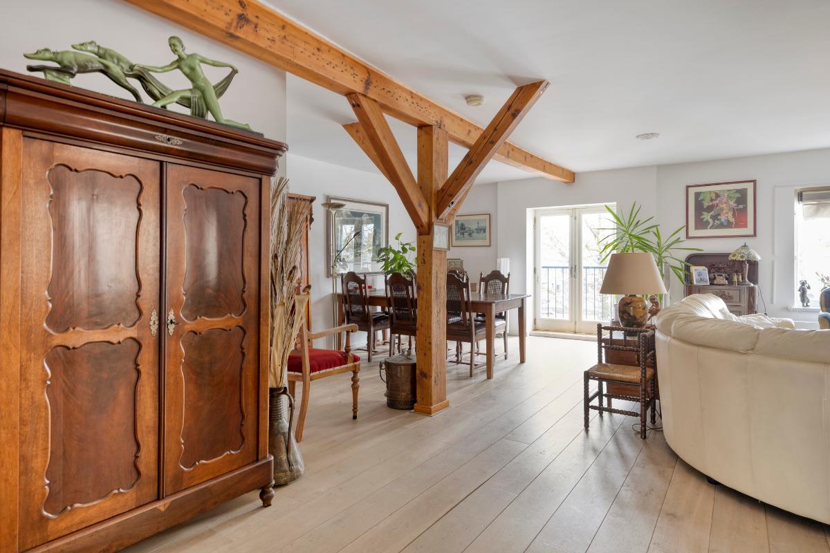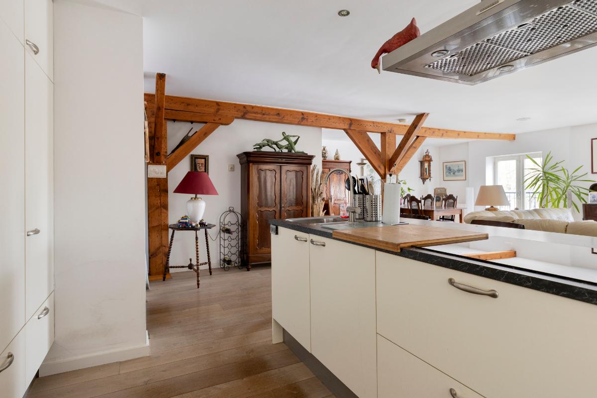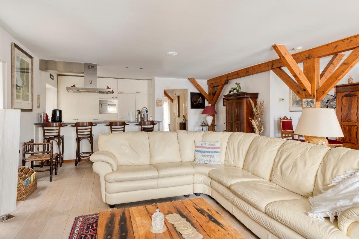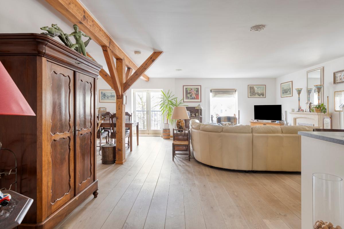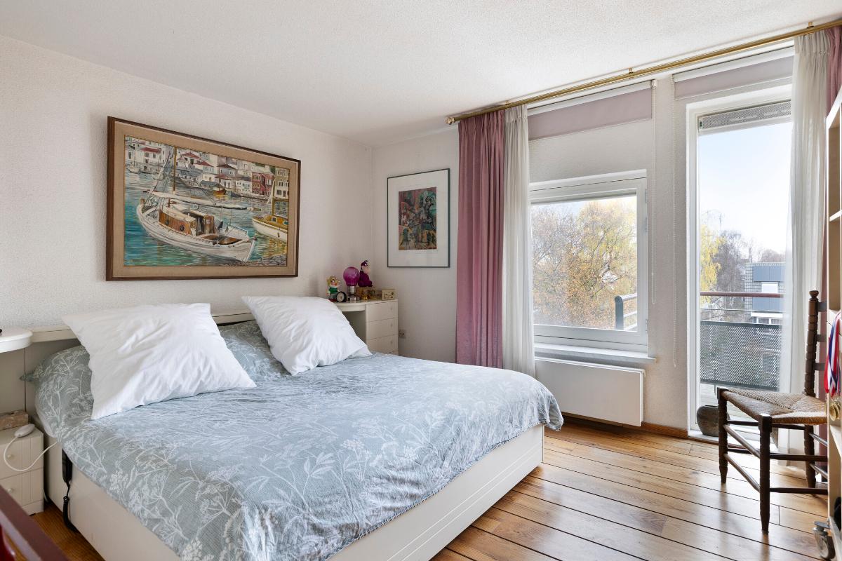 Tweede verdieping: Aan de lift ligt gelijk de toegangsdeur tot de ruime hal met toiletruimte en meterkast. De riante woonkamer van ca. 55 m² voorzien van authentieke spanten, houten vloerdelen en stolpdeuren naar het Franse balkon met het fraaie uitzicht over de binnenhaven. Luxe open keuken voorzien van kook- en spoeleiland, kastenwand en inbouwapparatuur zoals koelkast, vriezer, afzuigkap, inductiekookplaat en vaatwasmachine. Aan de achterzijde van de woning bevinden zich twee slaapkamers van respectievelijk ca. 12 en 13 m² waarvan de eerste voorzien is van een schuifkastenwand/inloopkast en van stolpdeuren die toegang geven tot het balkon. De geheel betegelde badkamer is uitgerust met een douchecabine, een badkamermeubel met wastafel, een urinoir en de wasmachineaansluiting.
