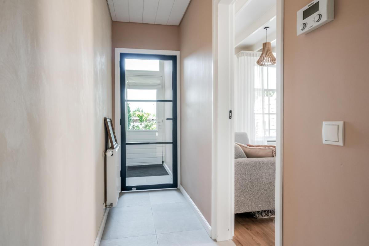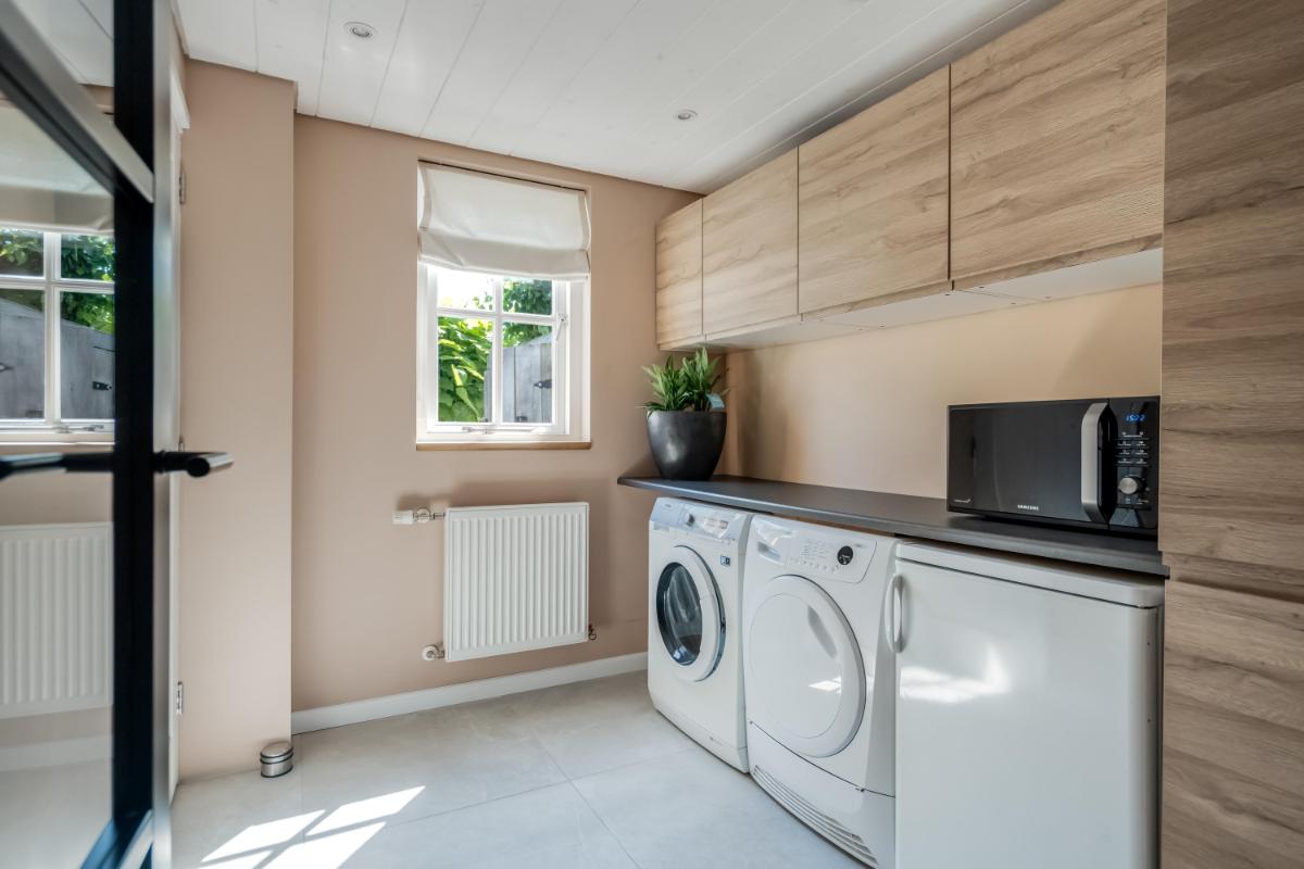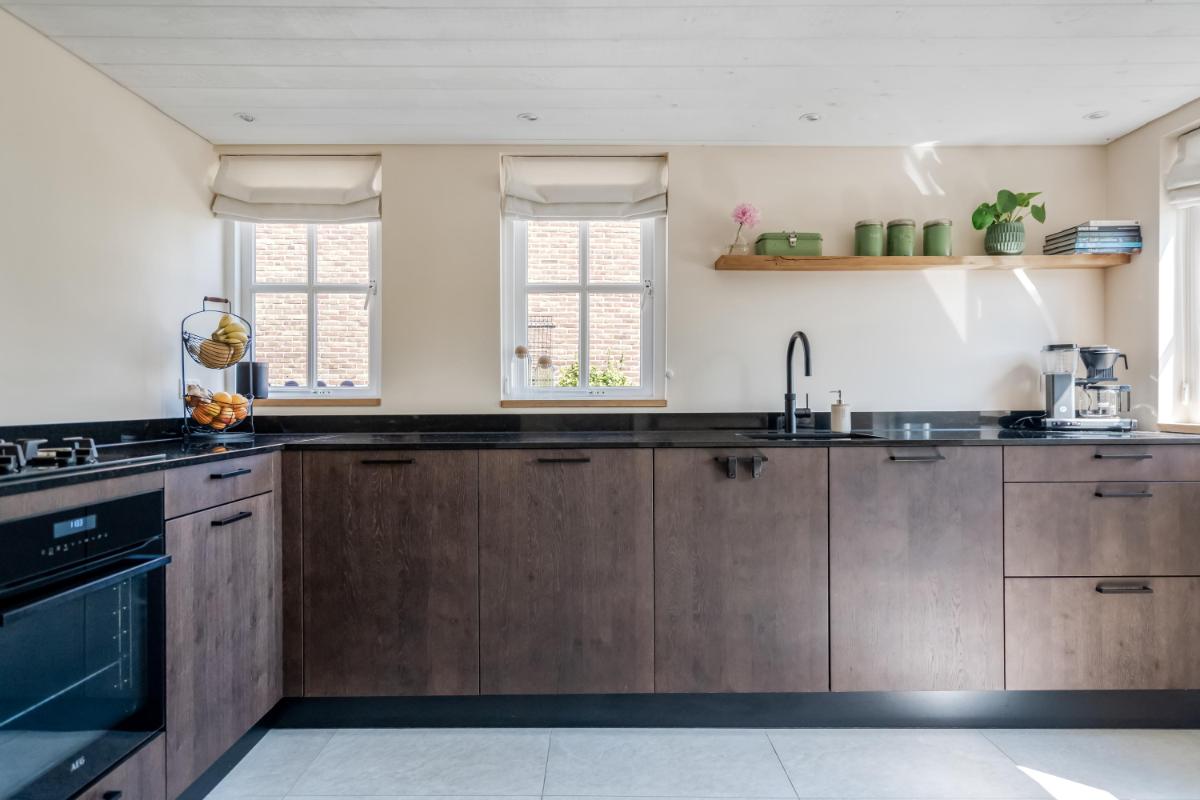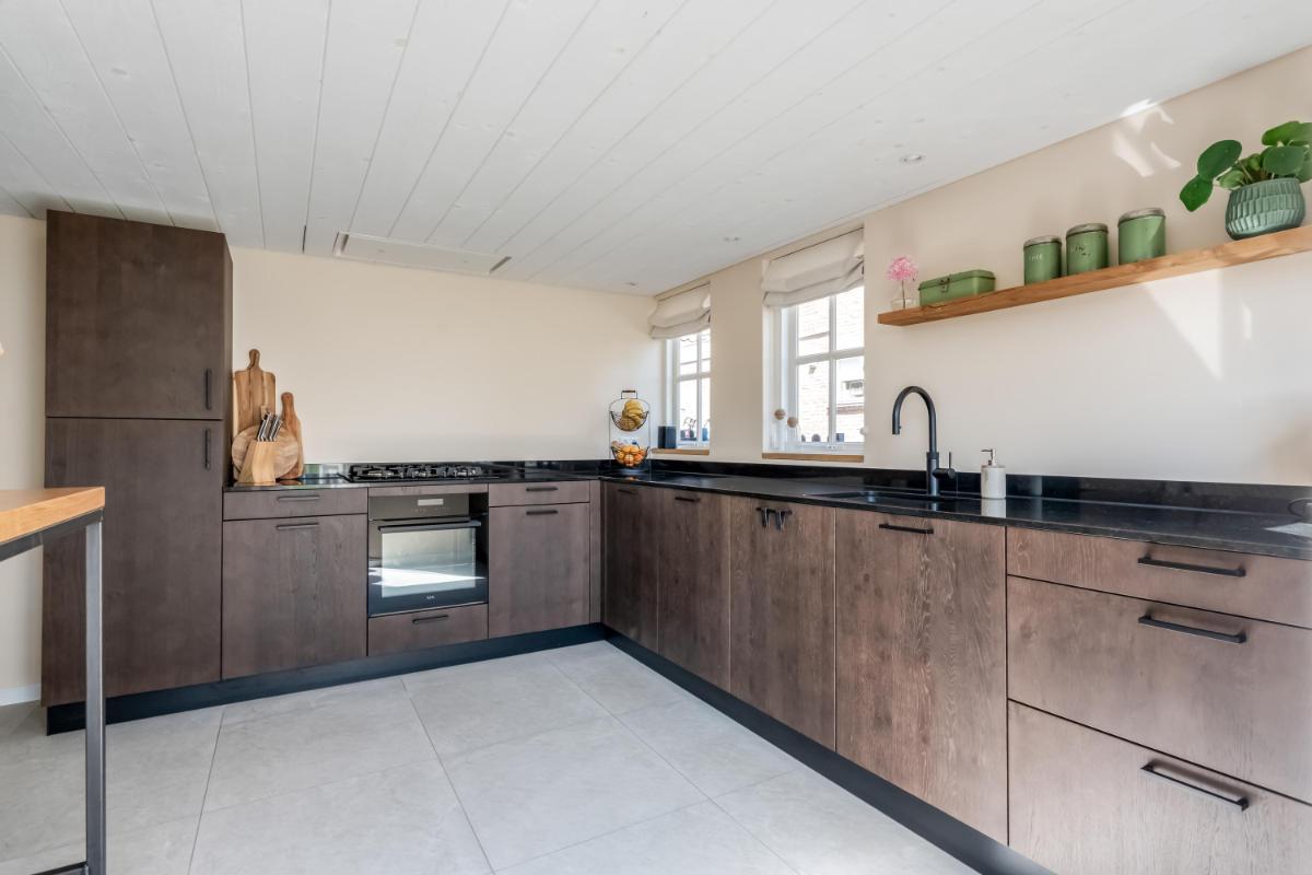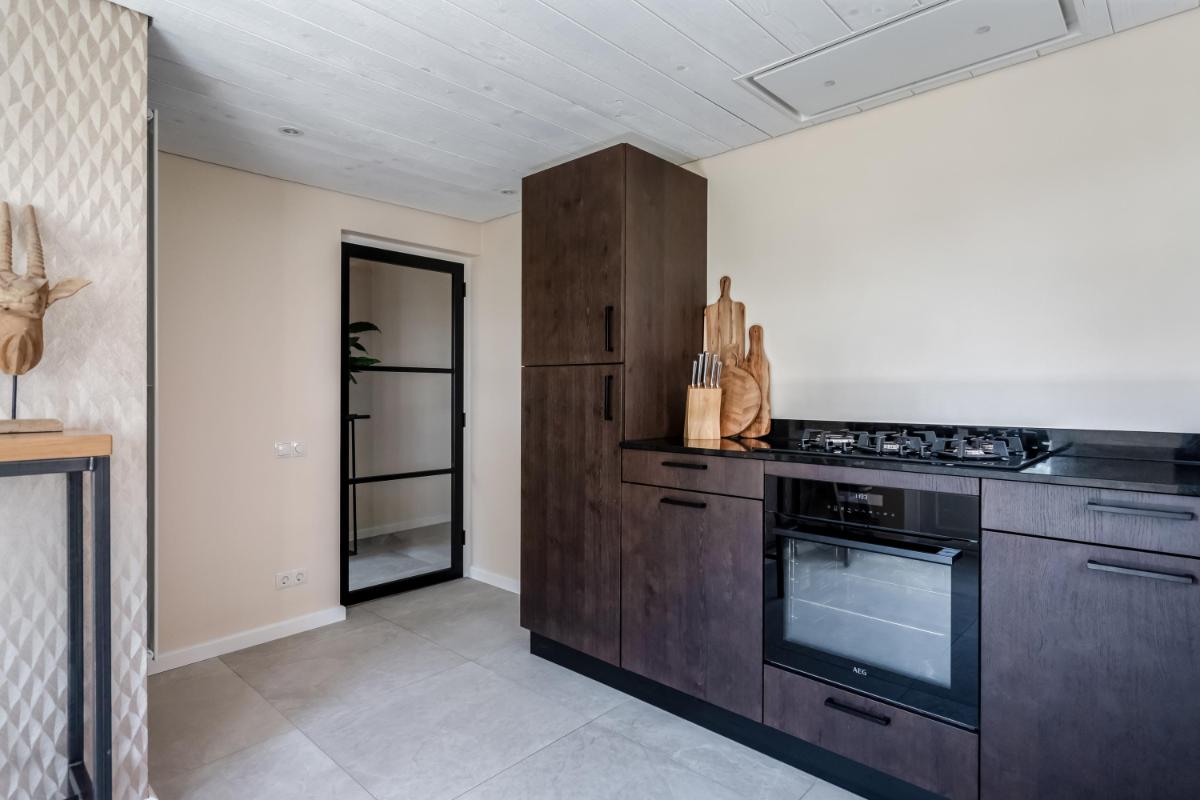 Begane grond De entree bevindt zich aan de keukenzijde, die in de praktijk de voorzijde van de woning vormt. Je komt binnen in de moderne keuken, die in 2021 volledig is vernieuwd. Deze is voorzien van een kookplaat, oven, afzuigkap, vaatwasser, koelkast en Quooker, en heeft een tijdloze afwerking in neutrale tinten.
