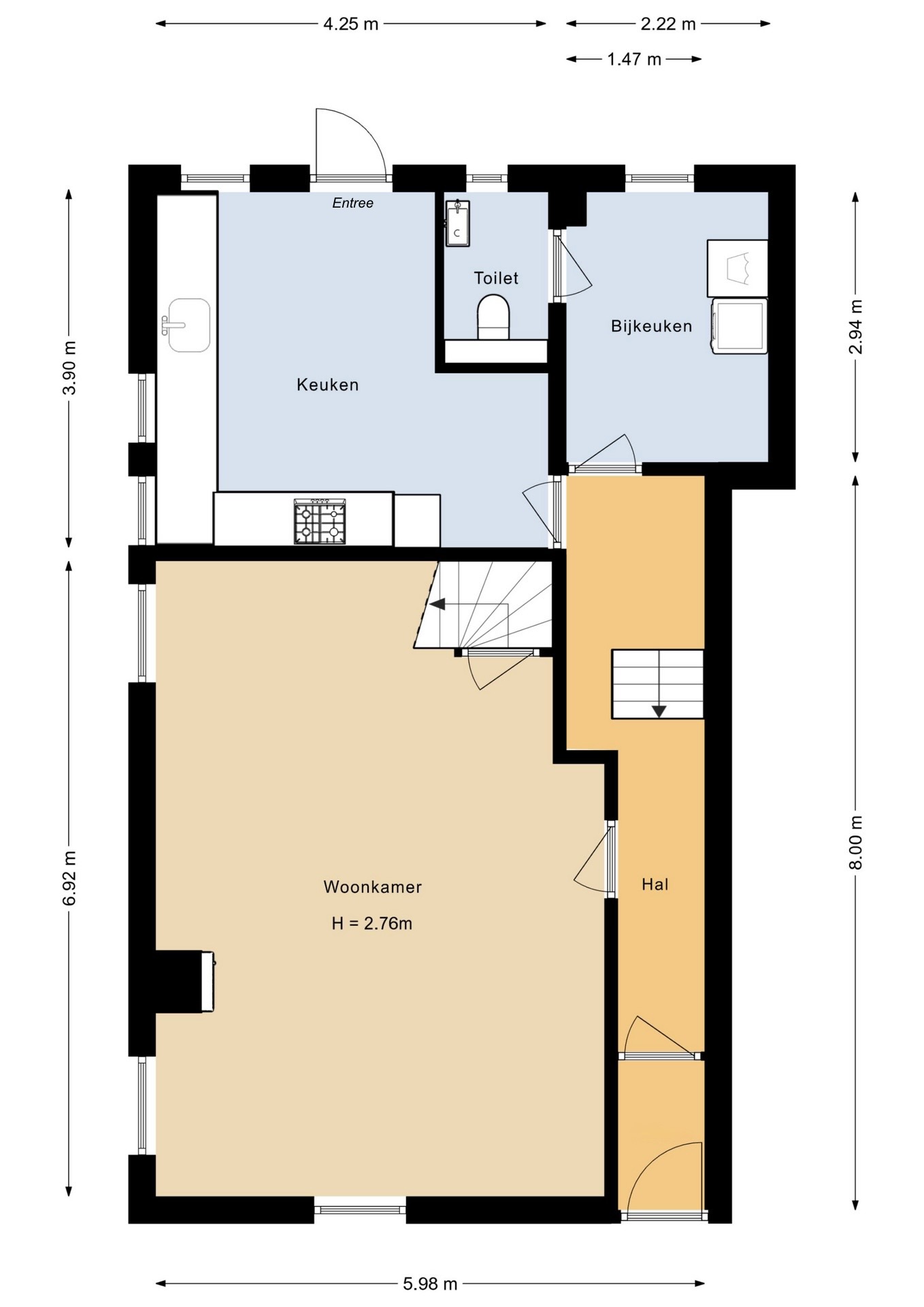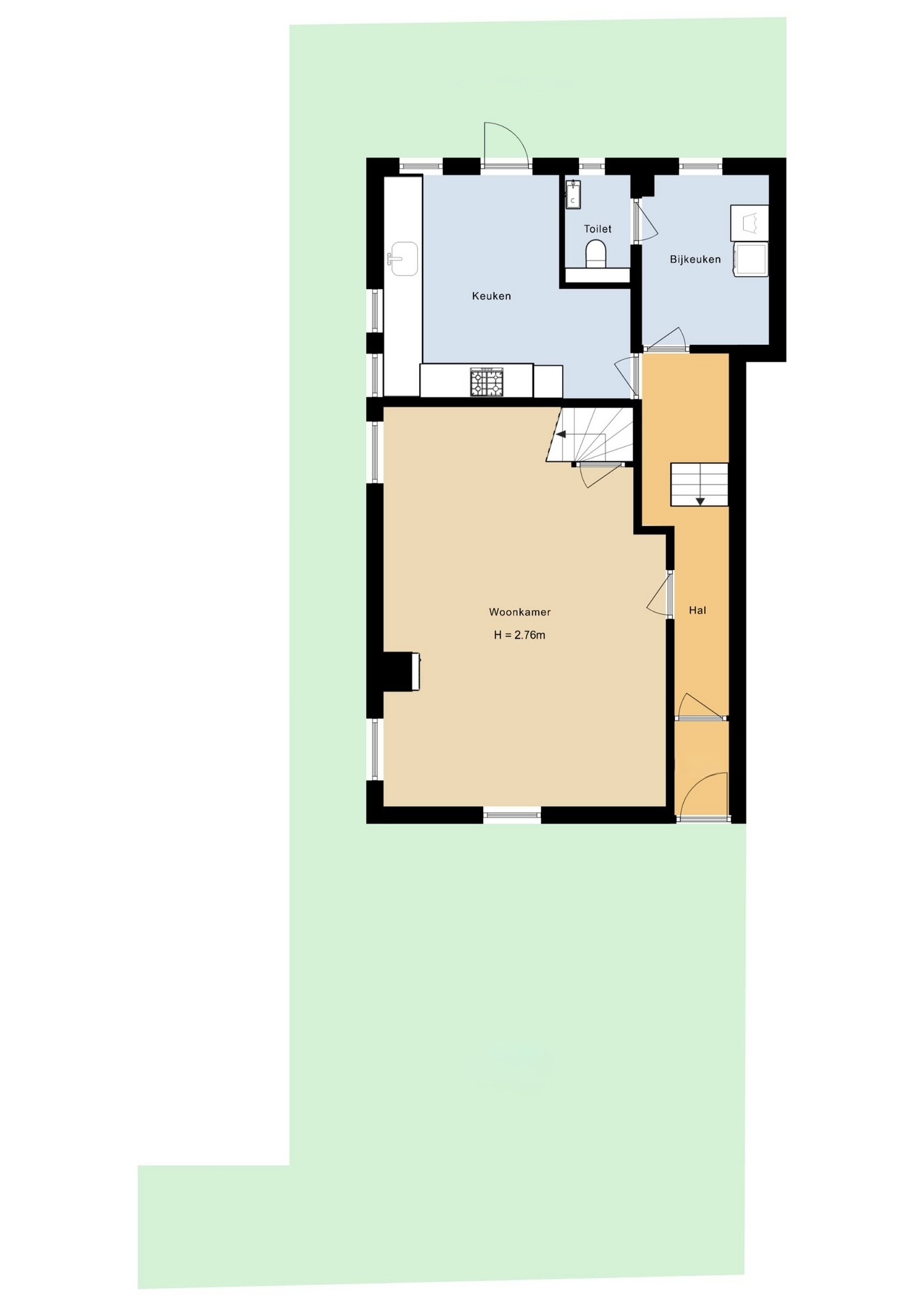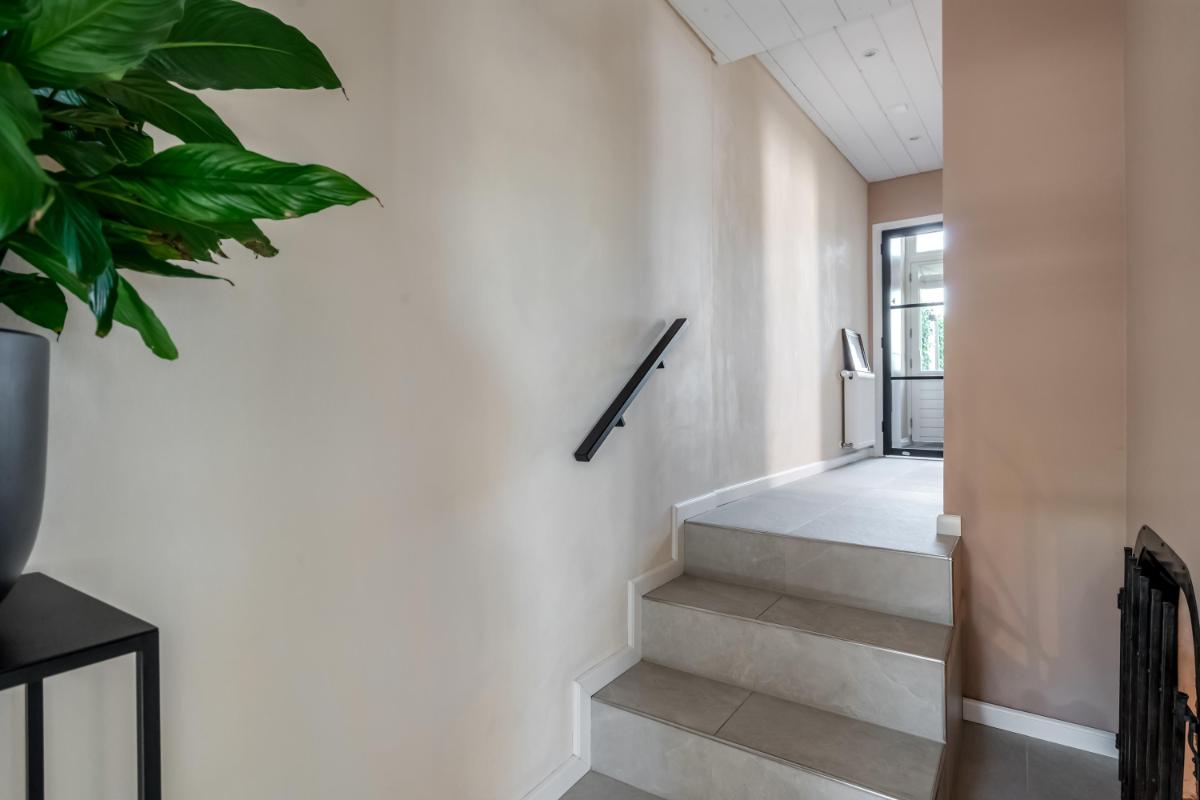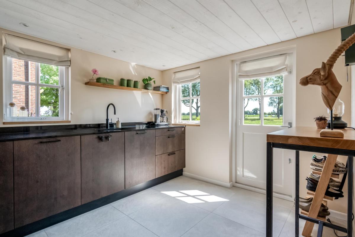 Begane grond De entree bevindt zich aan de keukenzijde, die in de praktijk de voorzijde van de woning vormt. Je komt binnen in de moderne keuken, die in 2021 volledig is vernieuwd. Deze is voorzien van een kookplaat, oven, afzuigkap, vaatwasser, koelkast en Quooker, en heeft een tijdloze afwerking in neutrale tinten.