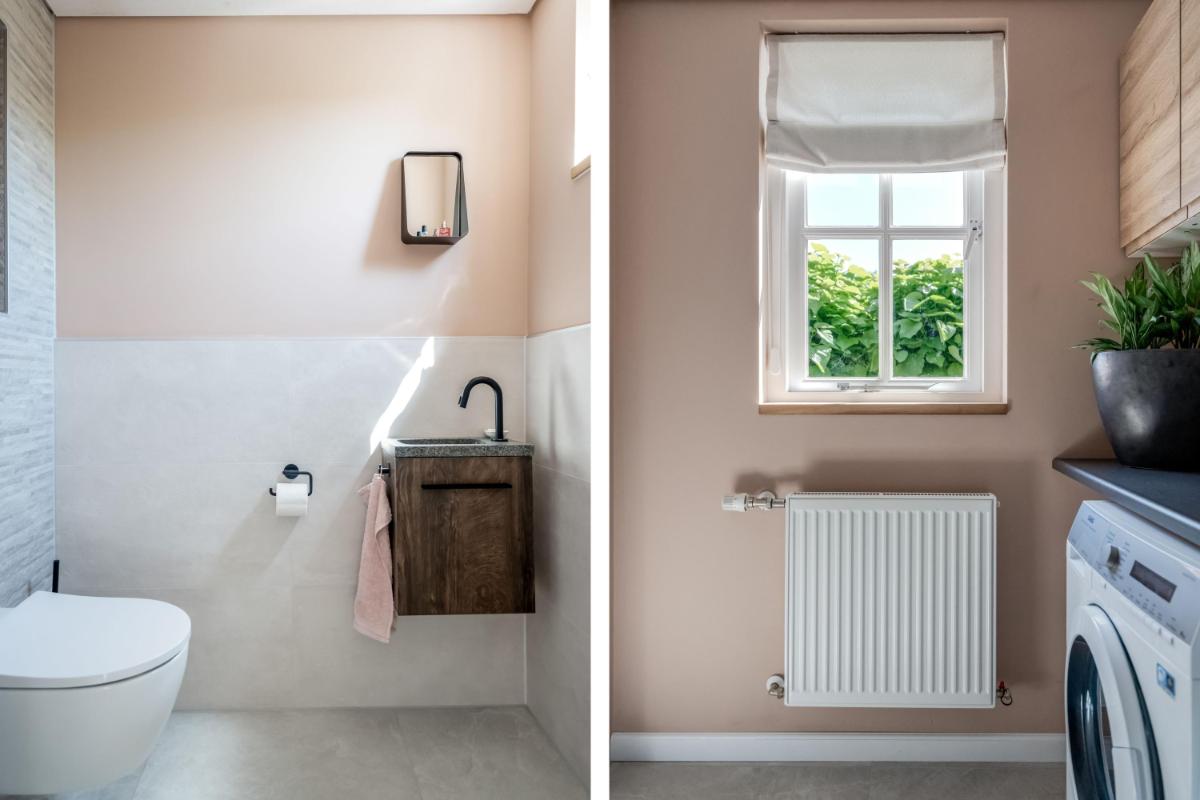 Vanuit de keuken bereik je de hal, die centraal in de woning ligt. Vanuit hier zijn de bijkeuken met wasmachineaansluiting en werkblad, het toilet met fonteintje en de provisiekelder toegankelijk. Daarnaast geeft de hal toegang tot de tuin en de woonkamer.