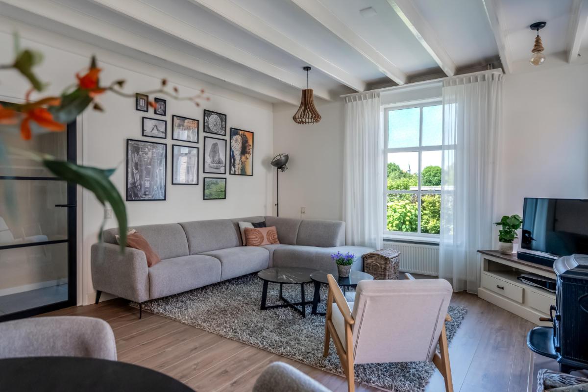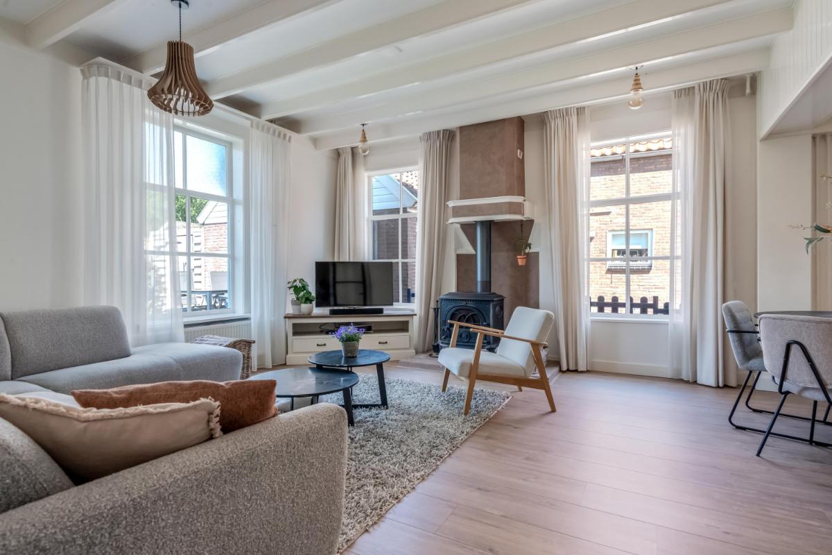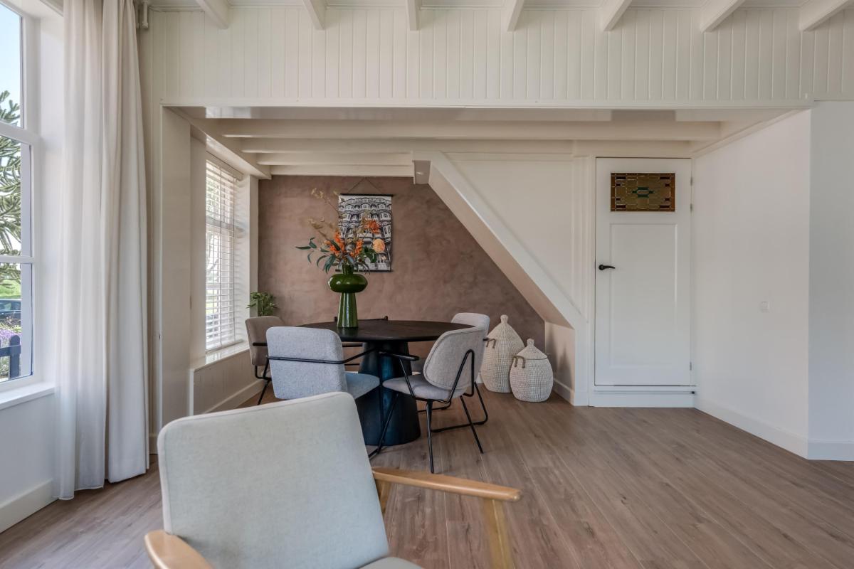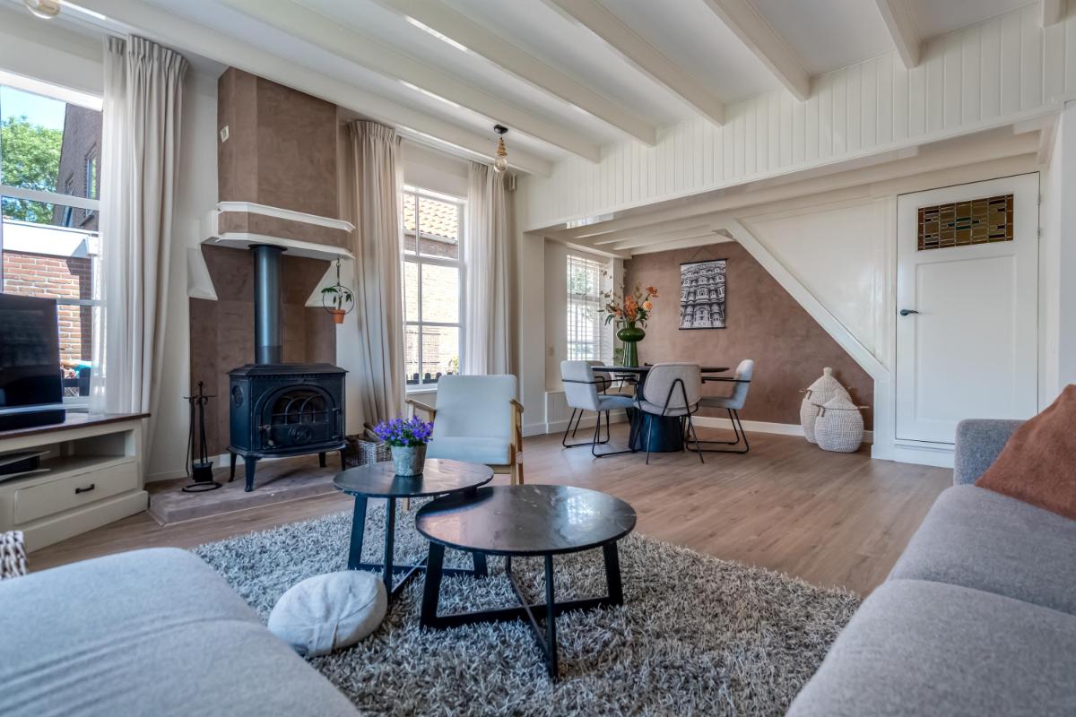 De woonkamer is ruim en licht dankzij de plafondhoogte van circa 2,76 meter en de grote ramen in de voor- en zijgevel. De houten vloer en de houtkachel zorgen voor een warme, uitnodigende sfeer die perfect past bij het karakter van deze woning. De trap naar de eerste verdieping bevindt zich in woonkamer.