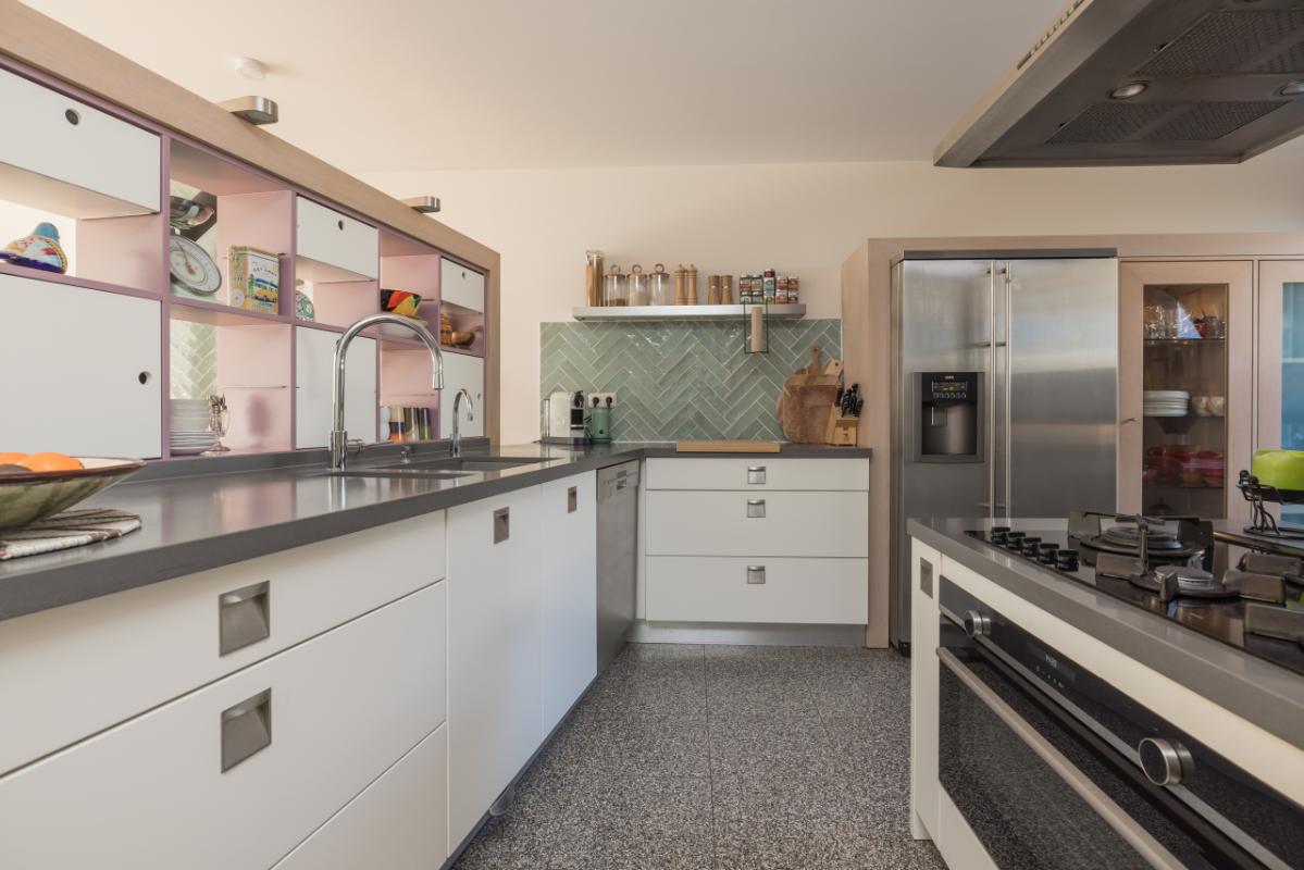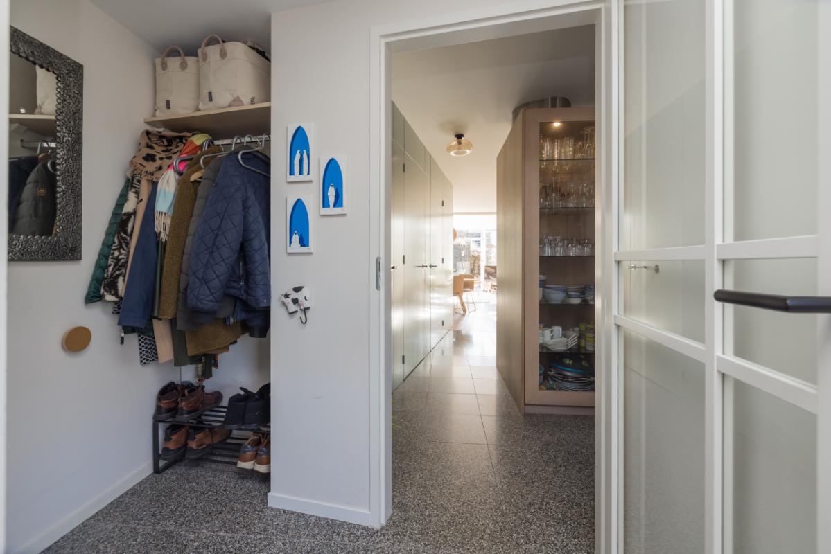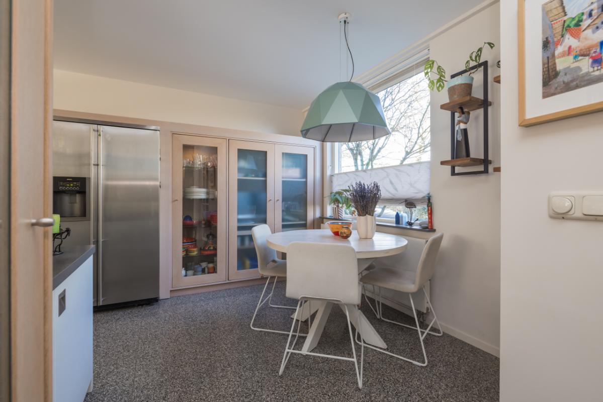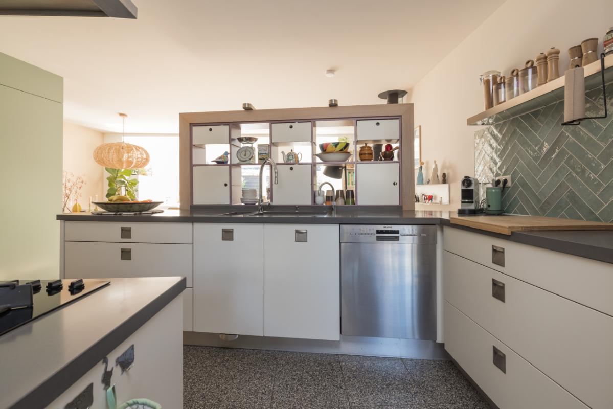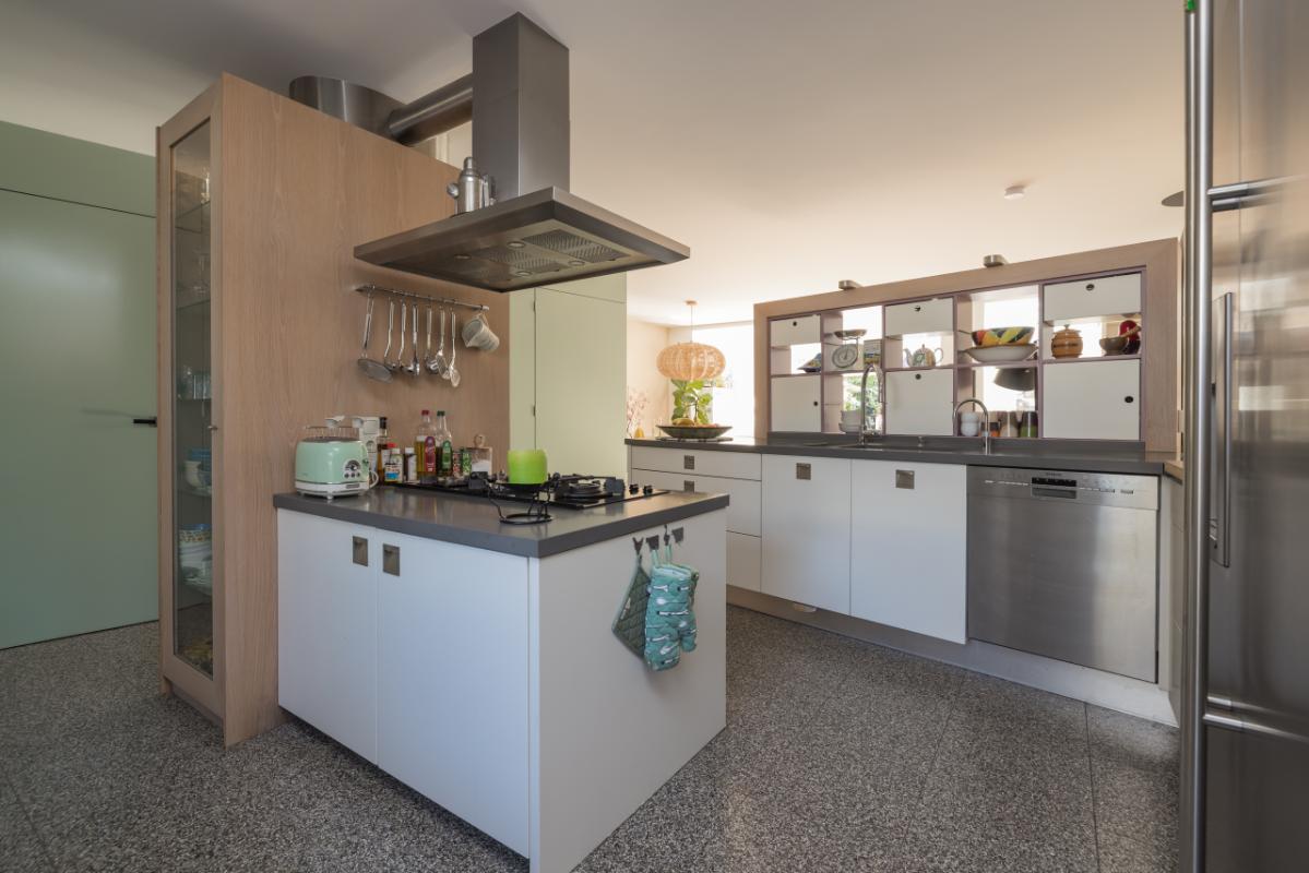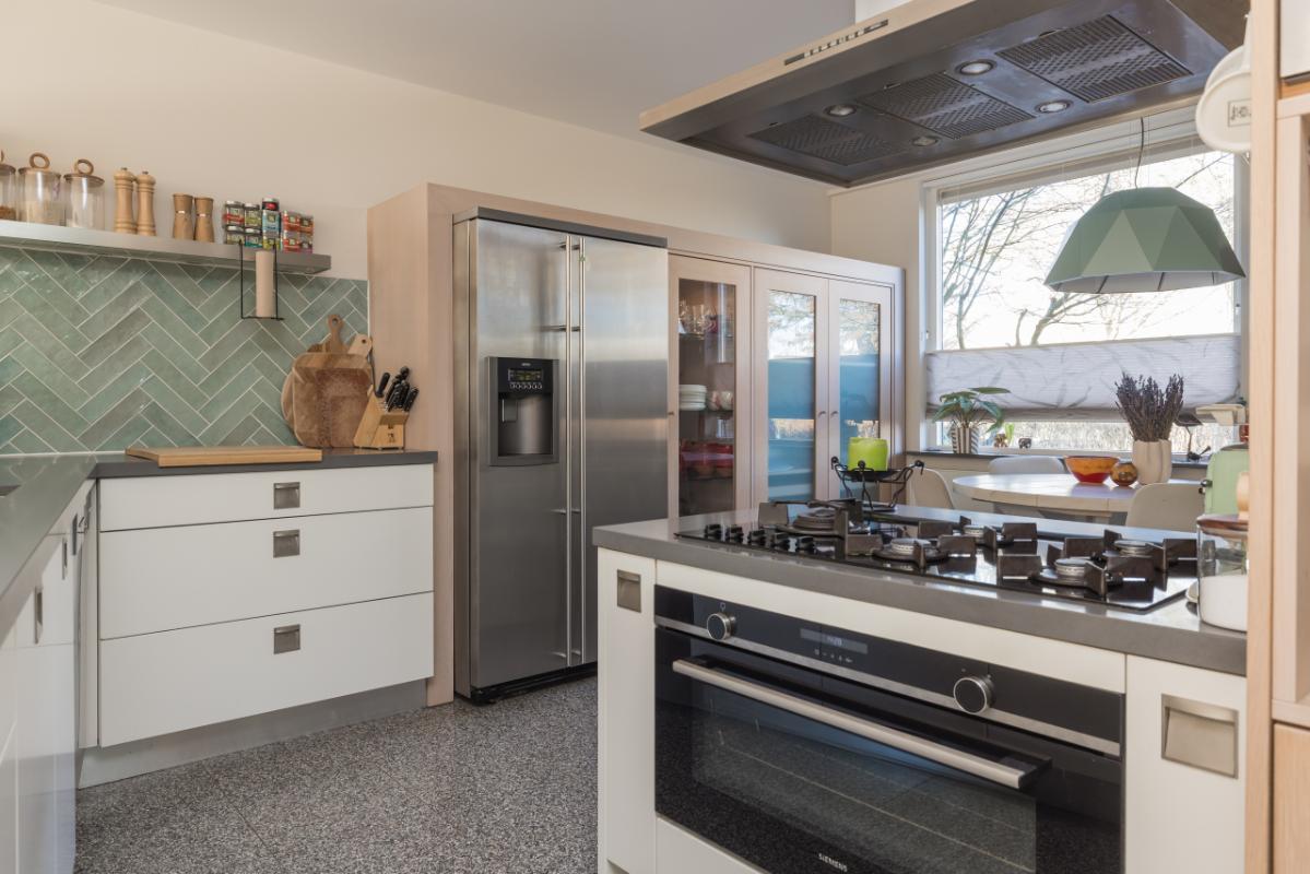 Aan de voorzijde van de woning bevindt zich de ruime woon-/eetkeuken. Deze moderne witte woonkeuken in hoekopstelling met kookeiland biedt volop werk- en bergruimte en is van alle gemakken voorzien zoals: een oven/grill, combi-oven/magnetron, 5-pits gaskookplaat, vaatwasmachine, Quooker en Amerikaanse koelkast met water- en ijsblokjestap. Daarnaast is er extra bergruimte aanwezig in de trapkast en vaste provisie/bergkast. De hal en keuken zijn voorzien van granito vloertegels.