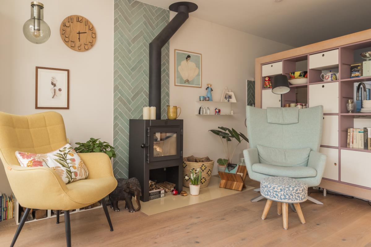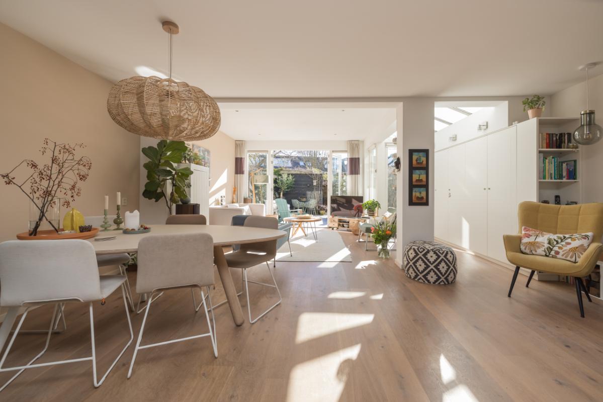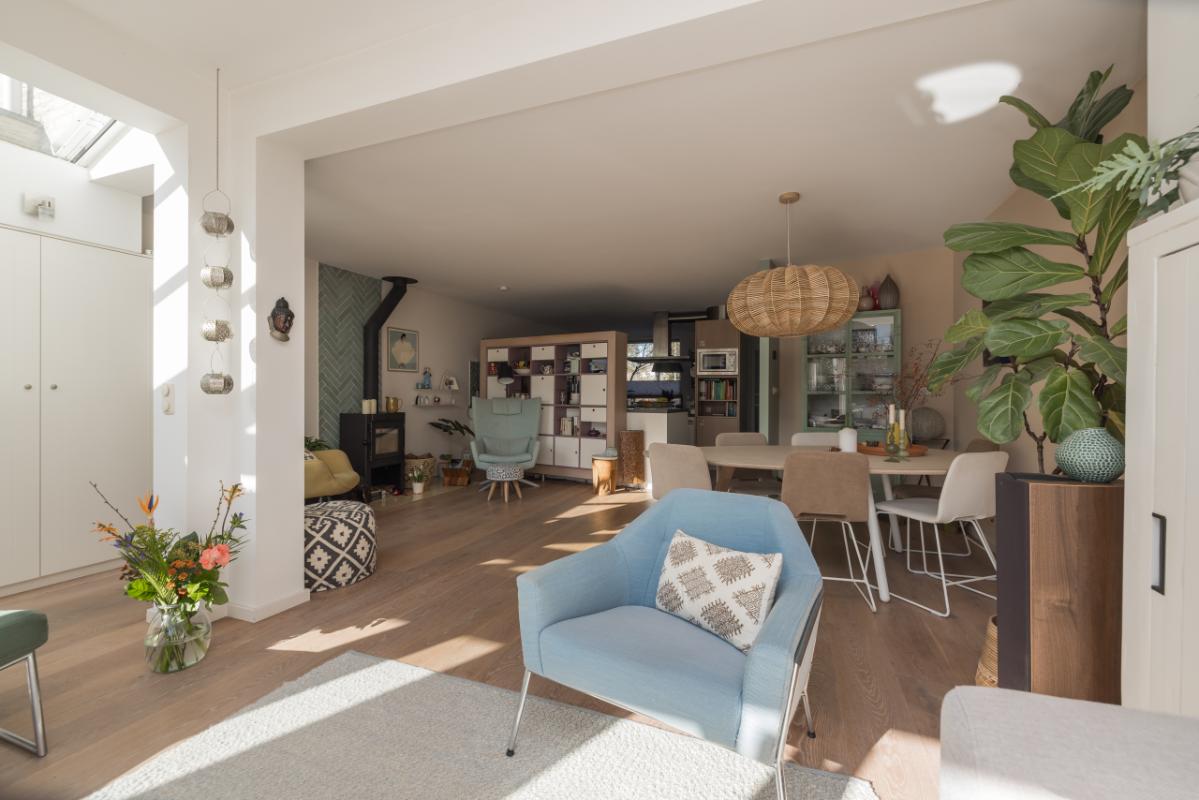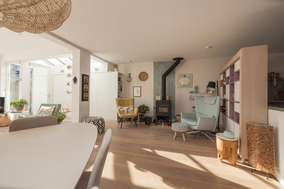 Aan de achterzijde van de woning bevindt zich de uitgebouwde en heerlijk lichte woonkamer. Deze royale living is speels ingericht en beschikt over een sfeervolle houtkachel, maatwerk inbouwkasten, een lichtstraat en openslaande deuren naar de tuin. De woonkamer is netjes afgewerkt met een massieve eikenhouten vloer, strakke wanden en een plafond met inbouwverlichting.