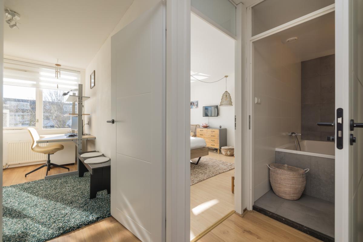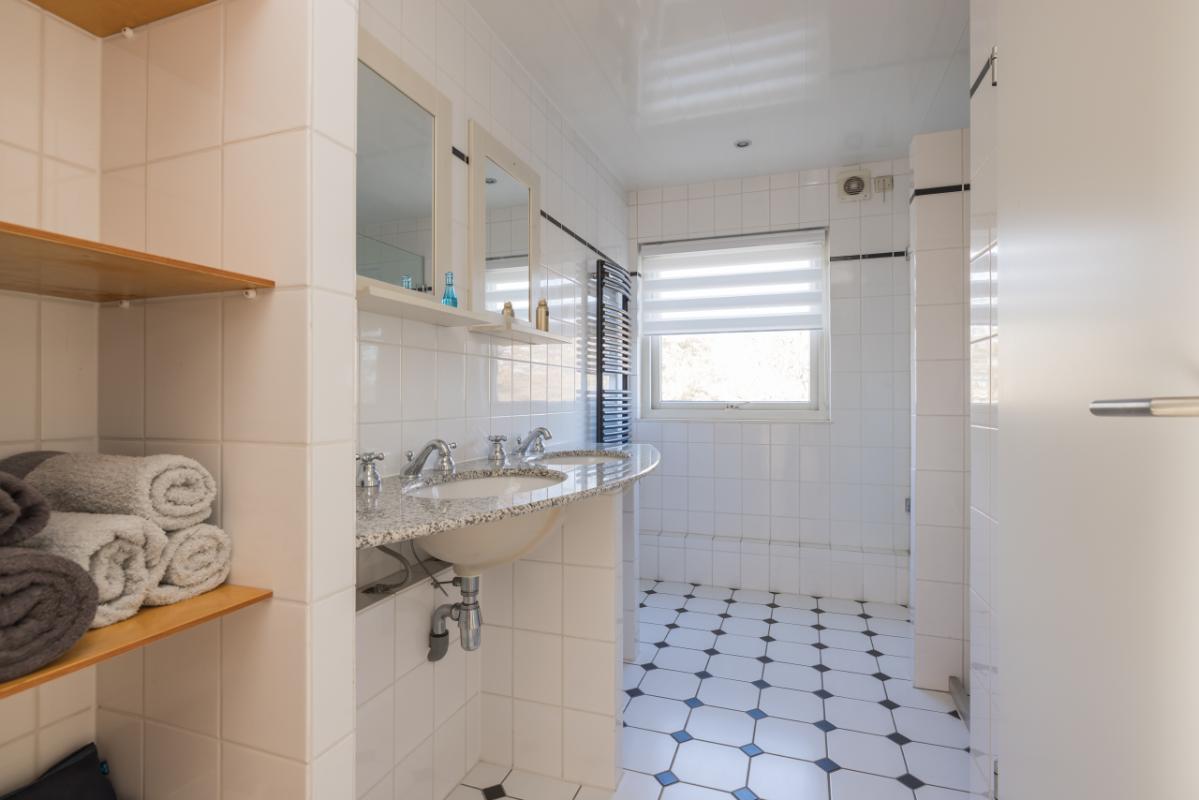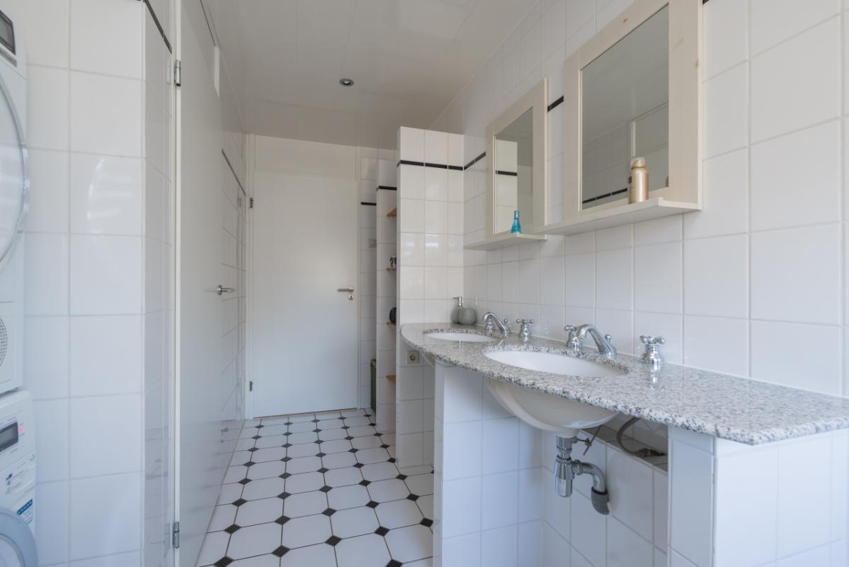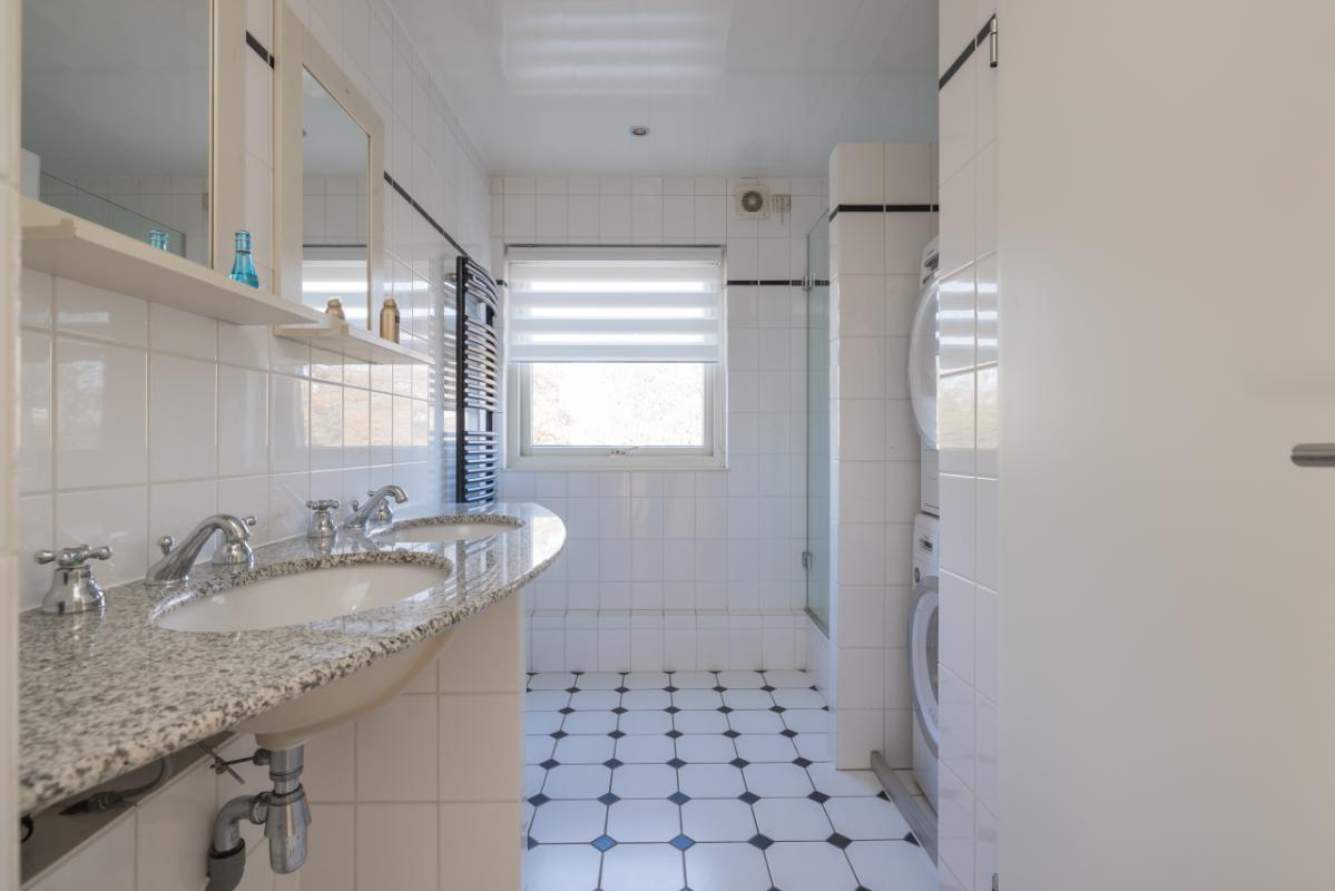 2e Etage: Overloop. Royale tweede badkamer (wit/zwart) voorzien van dubbele wastafel, douchecabine, aansluitingen voor de wasmachine en droger en kast met opstelling C.V.-combiketel (Intergas, 2023) en boiler. Ruime vierde slaapkamer aan de voorzijde. Ruime vijfde slaapkamer aan de achterzijde voorzien van dakkapel, wastafel en voldoende bergruimte in de schuifkast en achter knieschot.