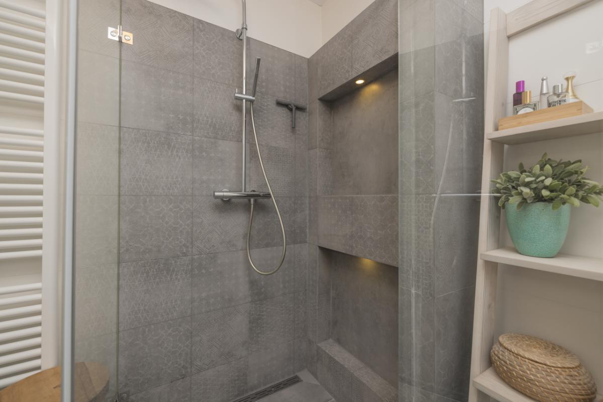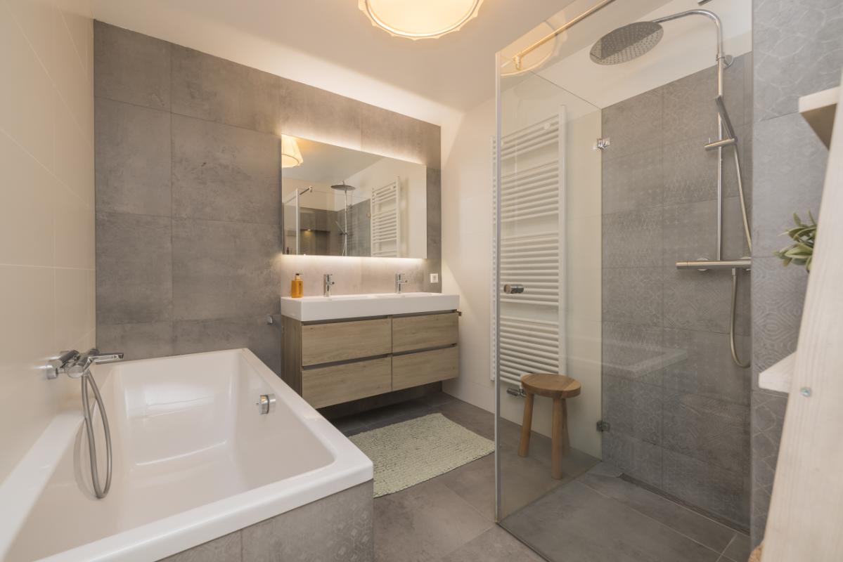 De stijlvolle badkamer is uitgevoerd in een moderne wit/grijze kleurstelling en van alle gemakken voorzien. Met een ligbad, dubbele wastafelmeubel, design radiator en luxe inloopdouche met ingebouwde verlichting en regendouche is dit een heerlijke plek om te ontspannen.
